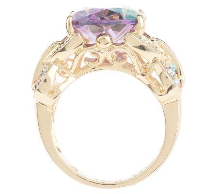 Goldtone/Purple: pale purple aurora borealis center stone, multicolored accent stones