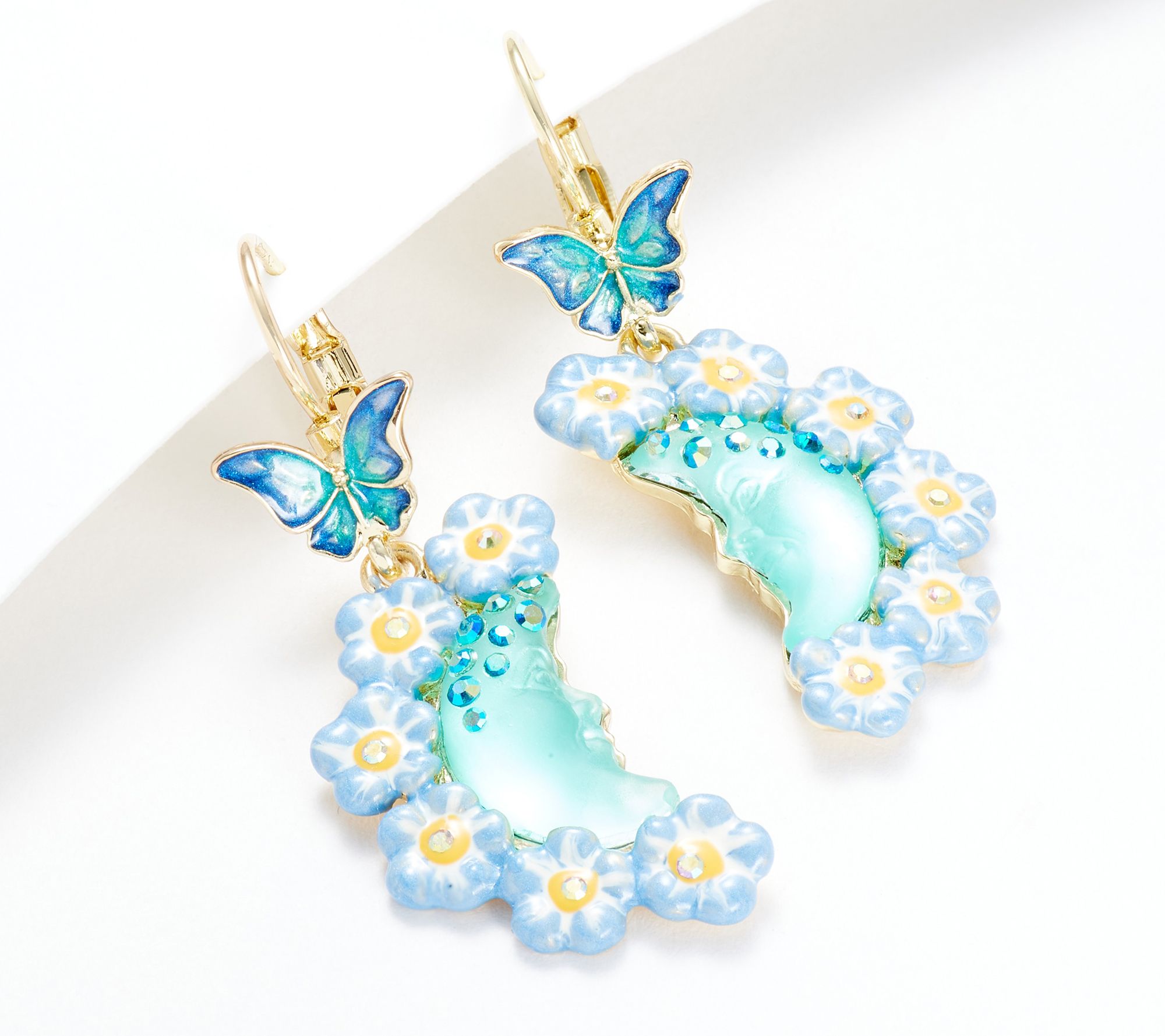 A sparkling crescent moon surrounded by enameled flowers dangles from a tiny aqua-blue butterfly, transporting you to an enchanted, magical place at any moment. Wear these Goddess Moon earrings when whimsy is the mood of the day. From Kirks Folly.