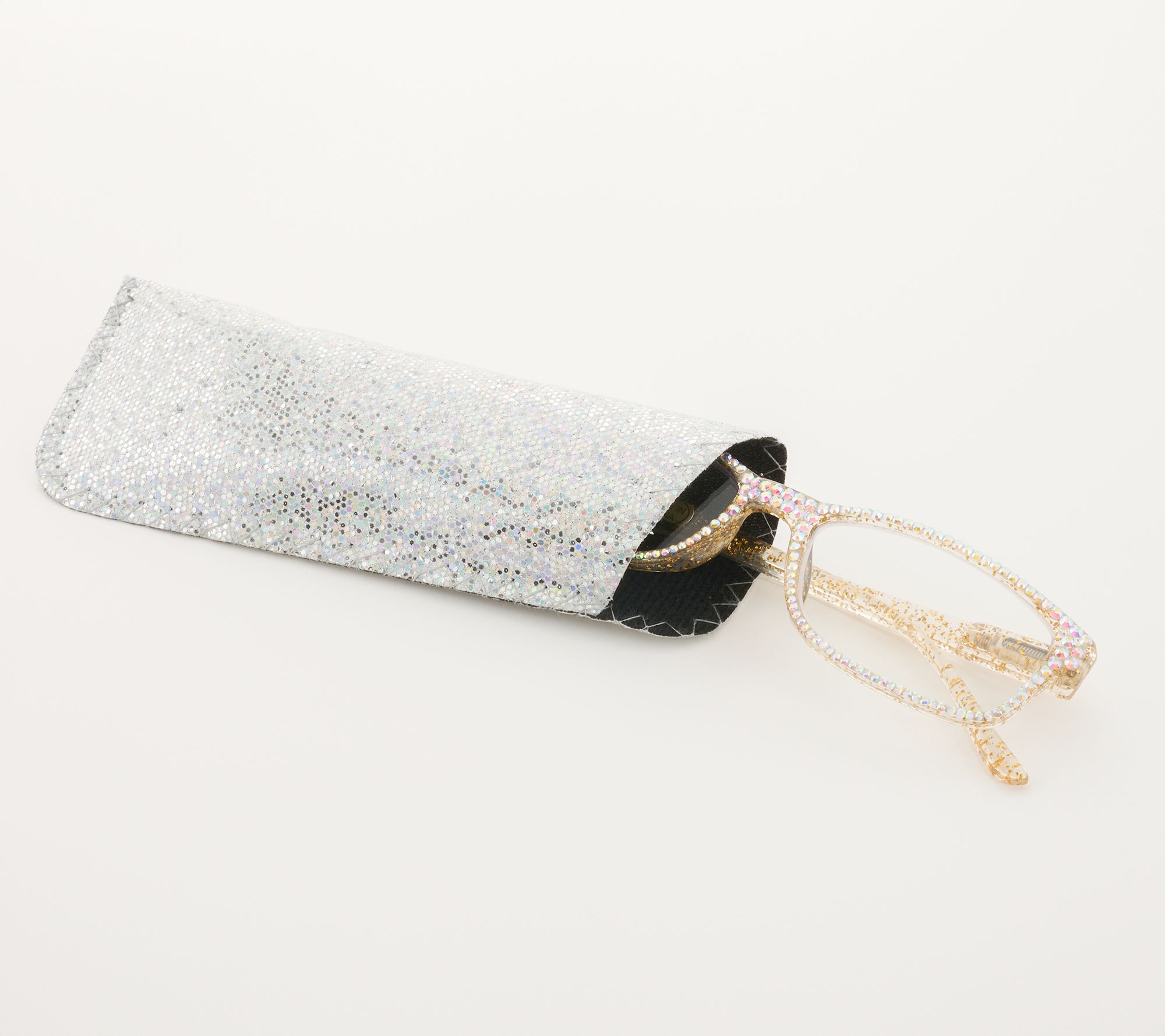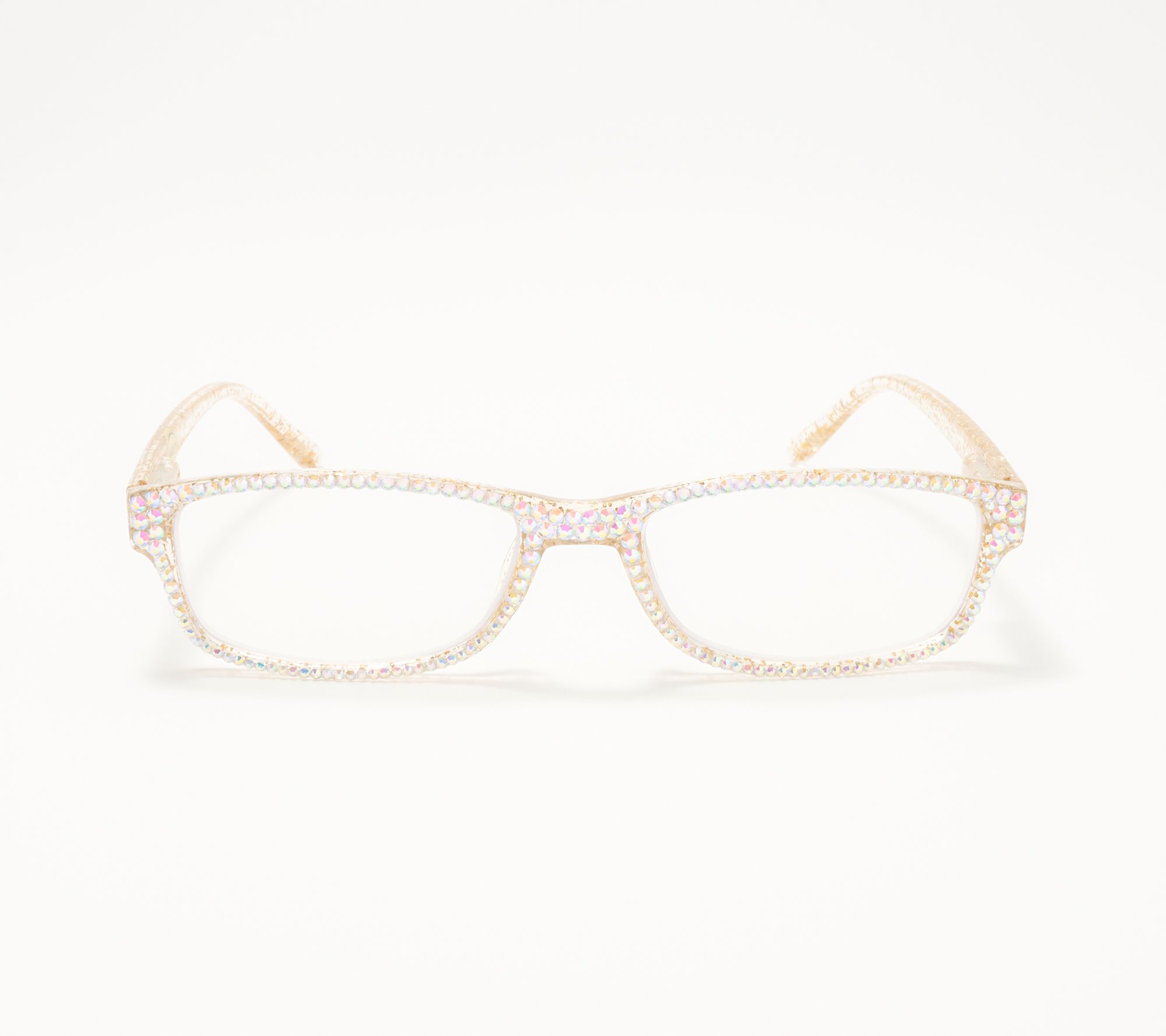 Add a sparkling accent to your day with the Glitter Goddess reading glasses. The shimmering goldtone glitter frame is paired with crystal aurora borealis faceted stones to brighten up every moment that calls for precise focus. From Kirks Folly.