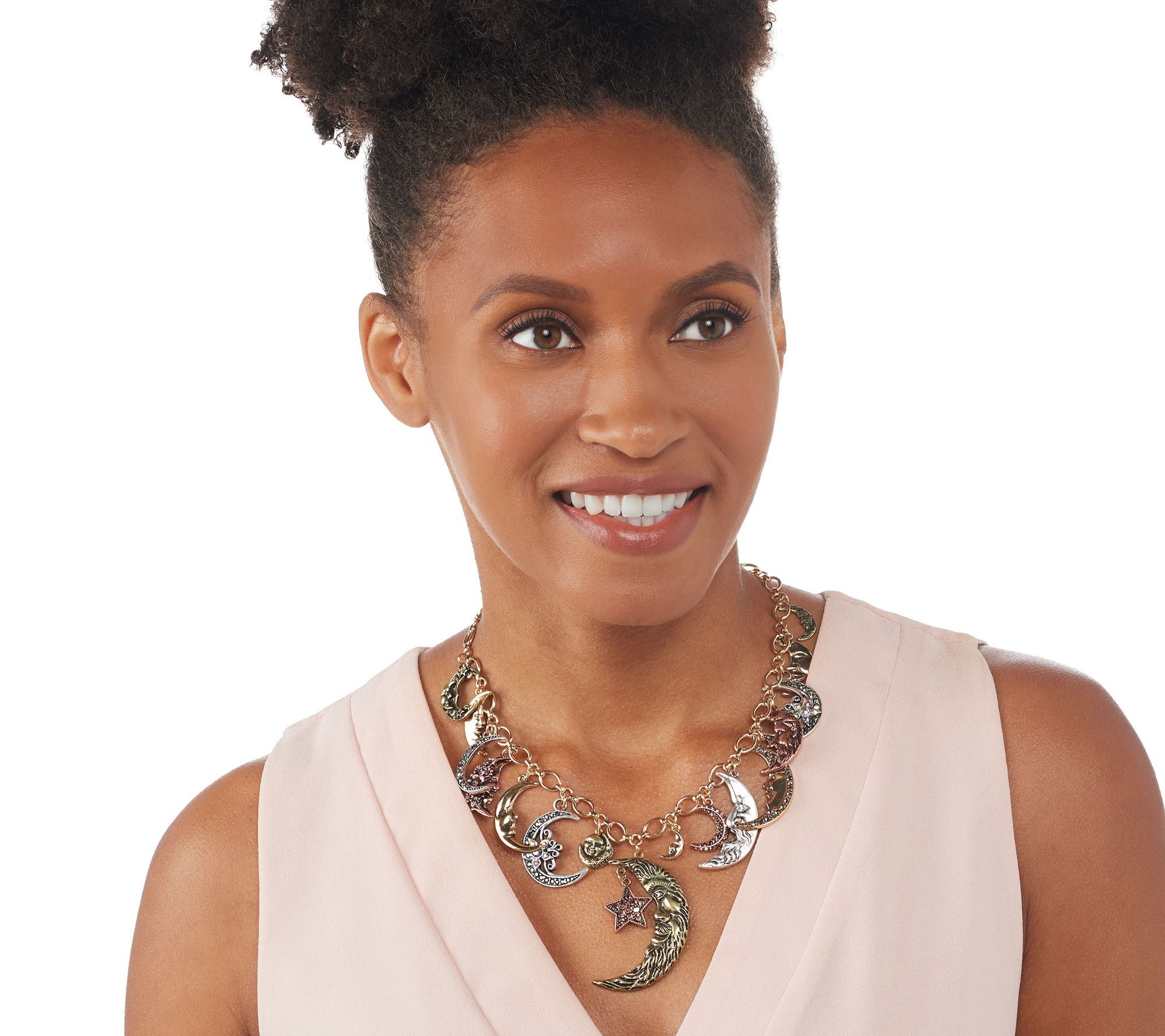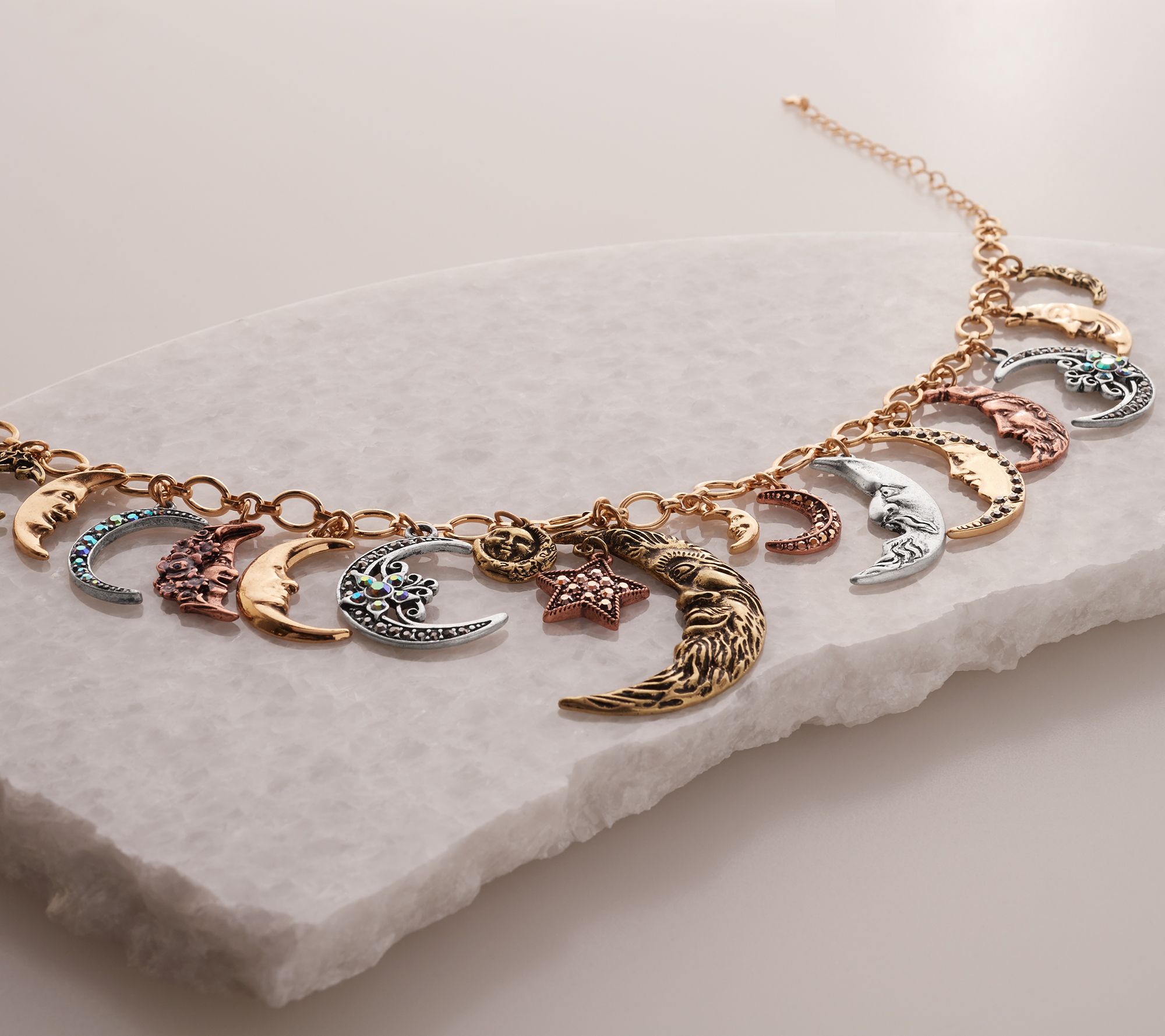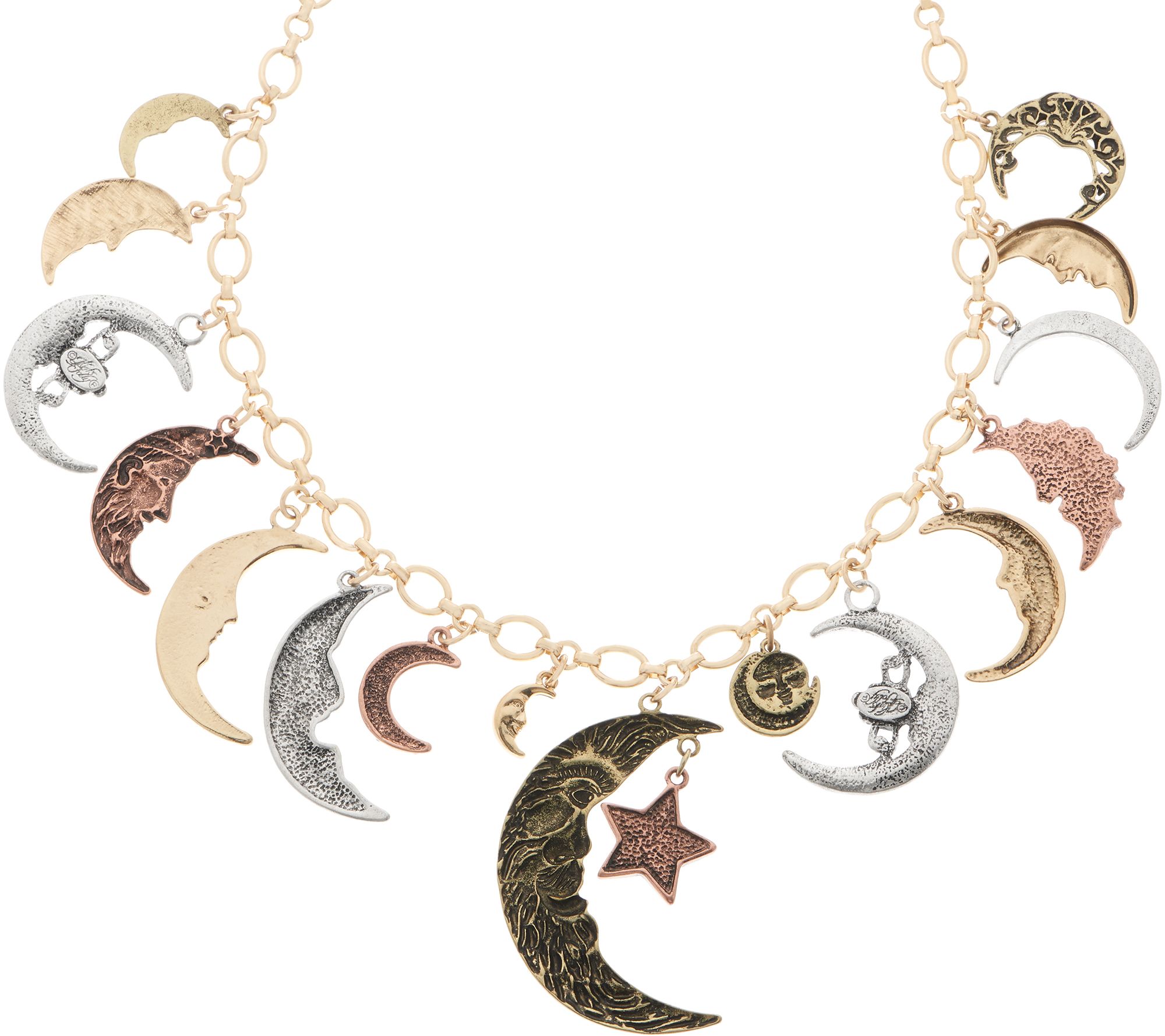You don't have to move heaven and earth to enchant with this sparkling, conversation-starting charm necklace. Part of the Kirks Folly Moon Shadow Collection depicting our unity under the sky, each finely detailed moon face displays a look worthy of a time-treasured story. From Kirks Folly.