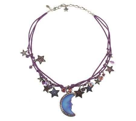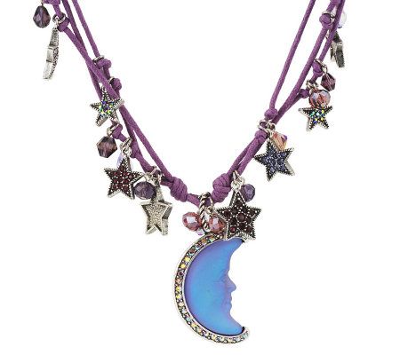 Out of this world. The stars are aligned with this cord necklace, composed of stars and aurora borealis beads that vary in shape and size. Dangling from the cord is a crescent shaped seaview moon that is also bordered by aurora borealis crystals. From Kirks Folly.