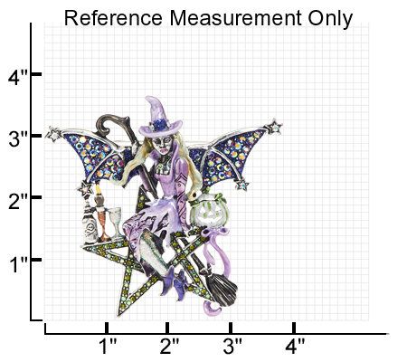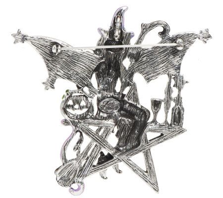Pin/enhancer with goddess witch perched on a five-point star; bottle of potion, candlestick, cup, jack-o'-lantern, and broomstick add to the scene; oxidized finish