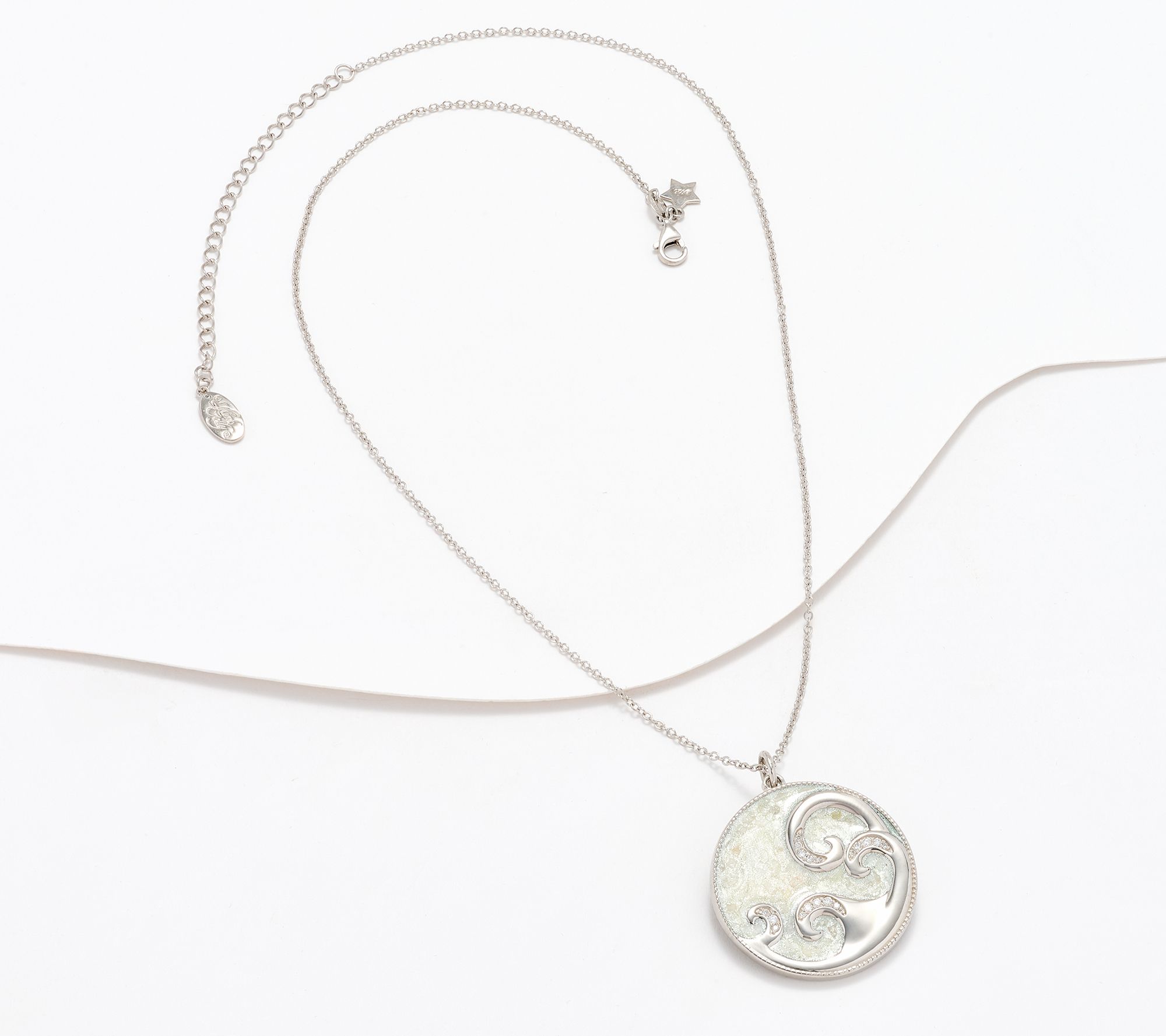 Approximate measurements: Pendant 1-9/16"L x 1-5/6"W x 3/16"H; Chain 18"L plus 3" extender