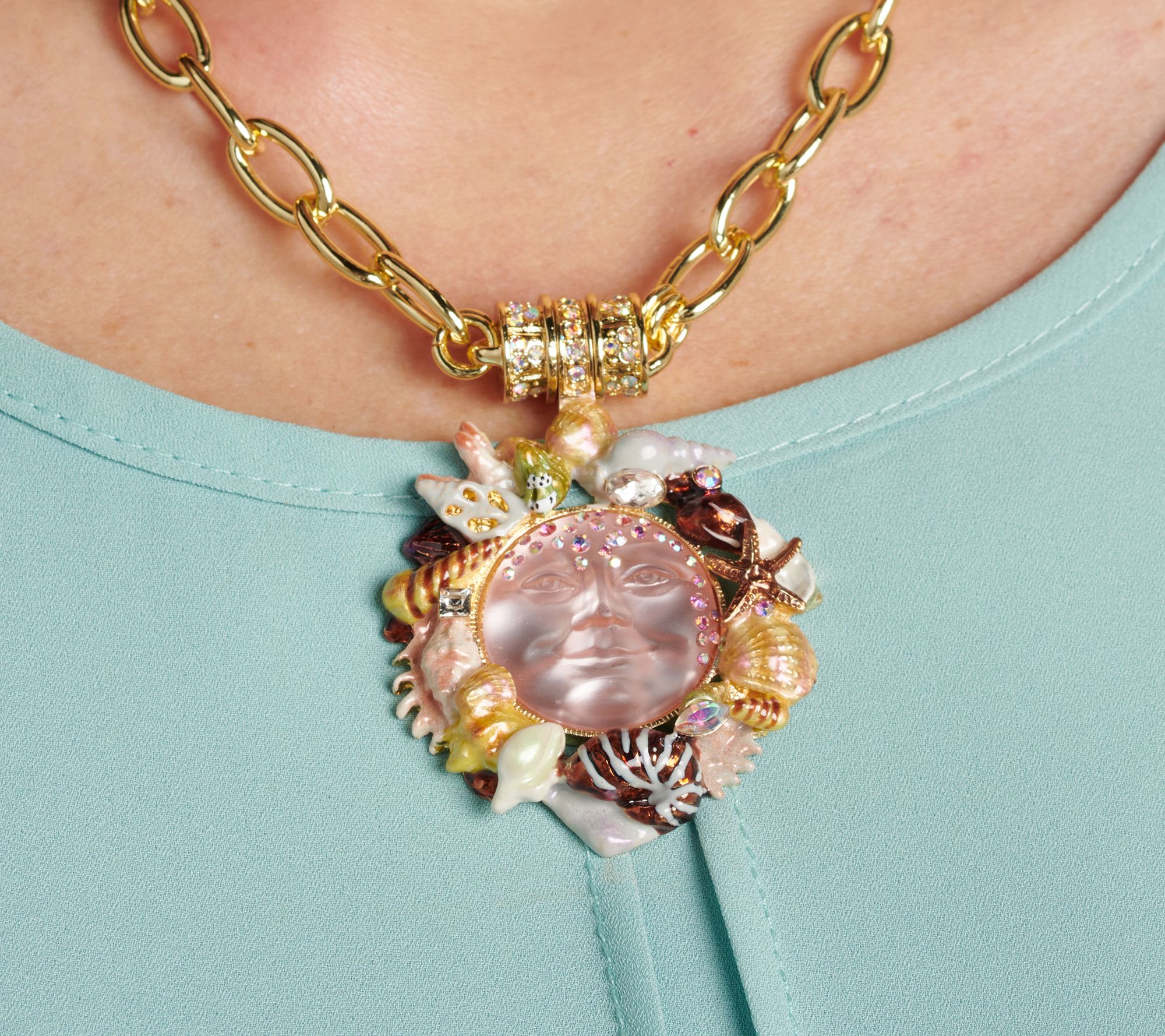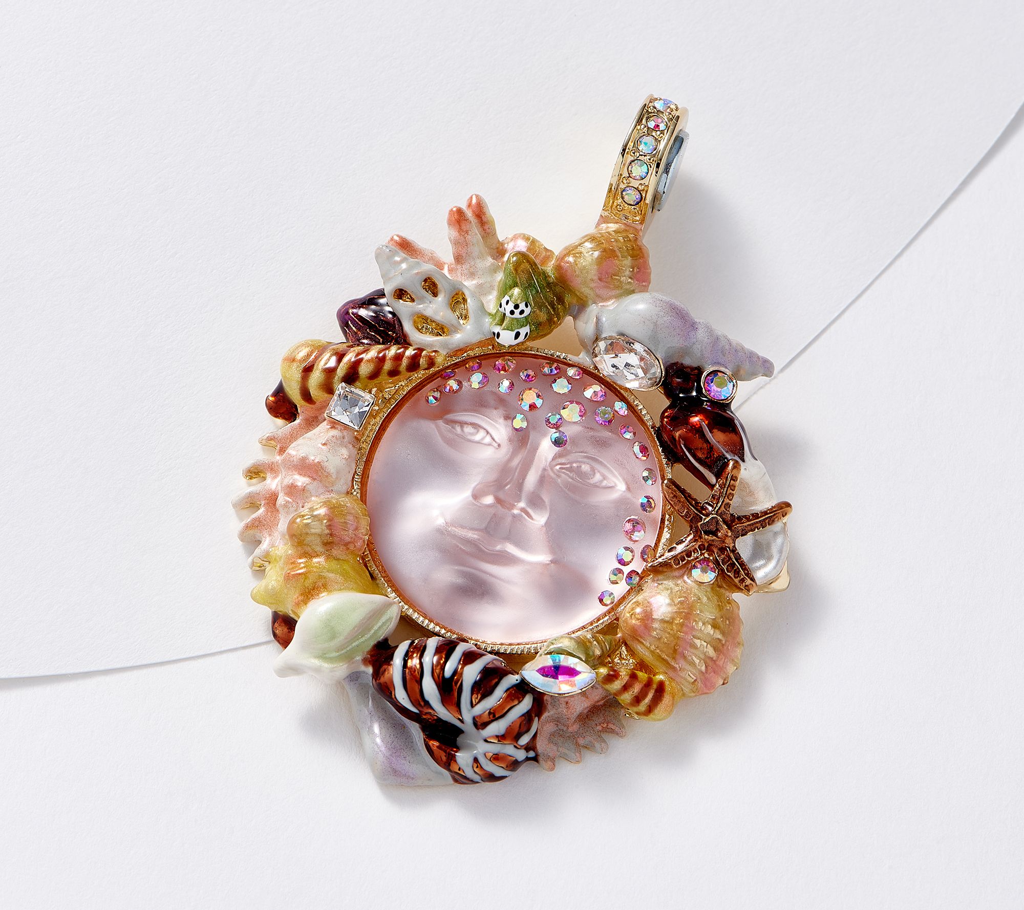 • Peach moon stone; matching aurora borealis crystals; variety of shells surrounding the moon; polished finish