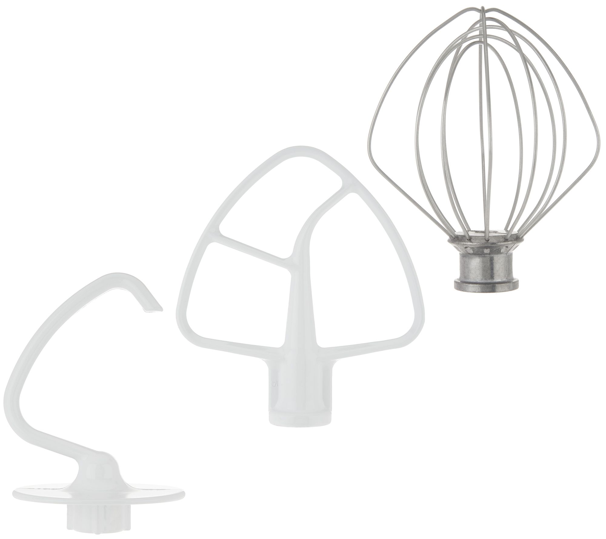 Includes tilt-head stand mixer, 5-qt painted stainless steel bowl, dough hook, flat edge beater, wire whip, and pour shield