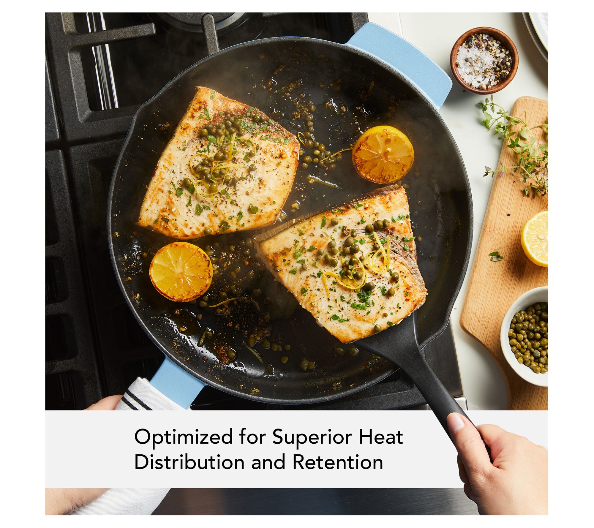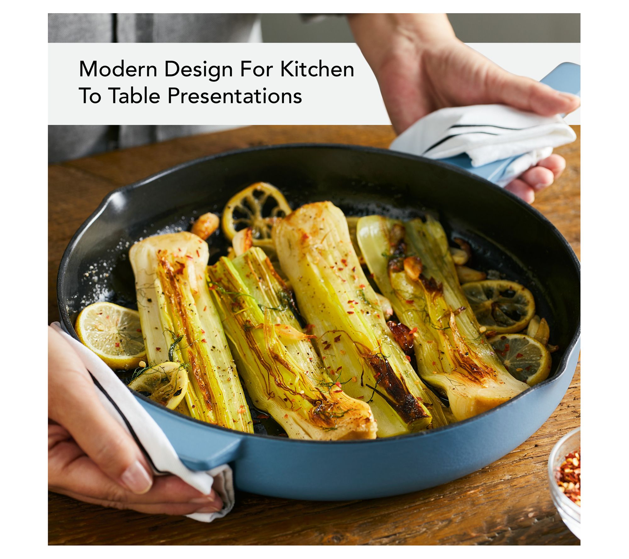 Experience all the delicious benefits of cast iron without the maintenance when you have this enameled skillet, perfect for achieving sizzling sears or beautiful browning whether in the oven or on the stovetop. From KitchenAid.