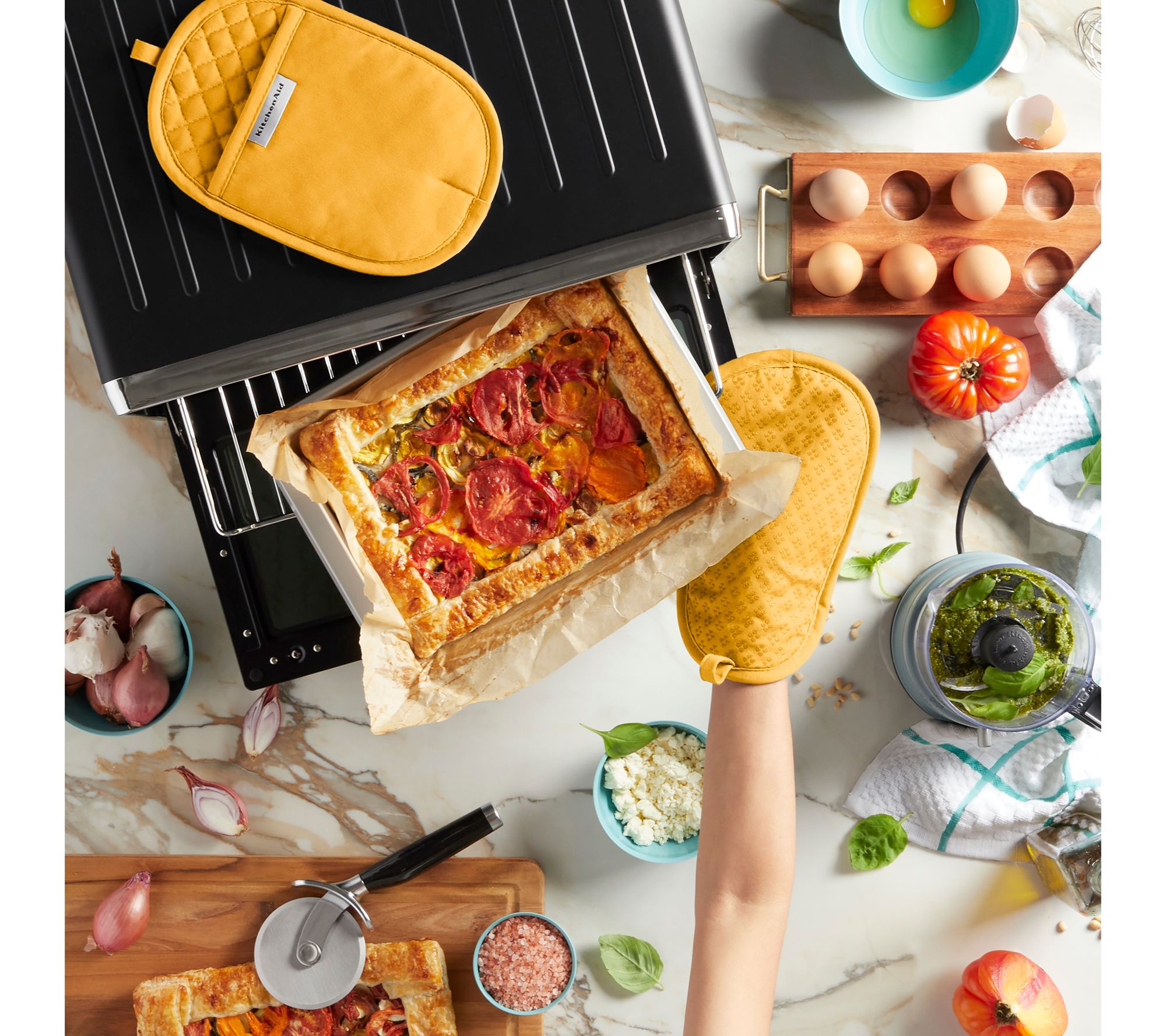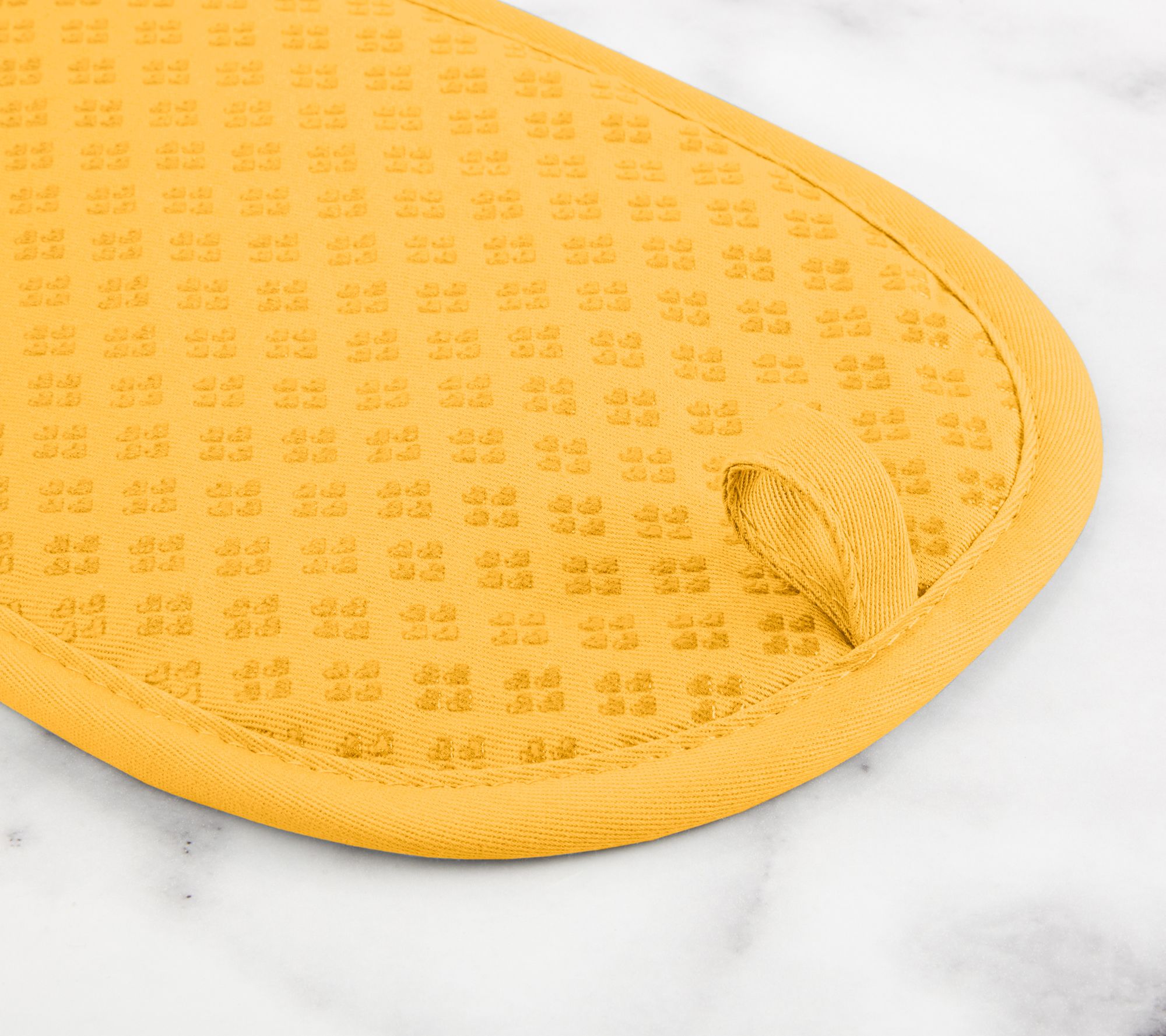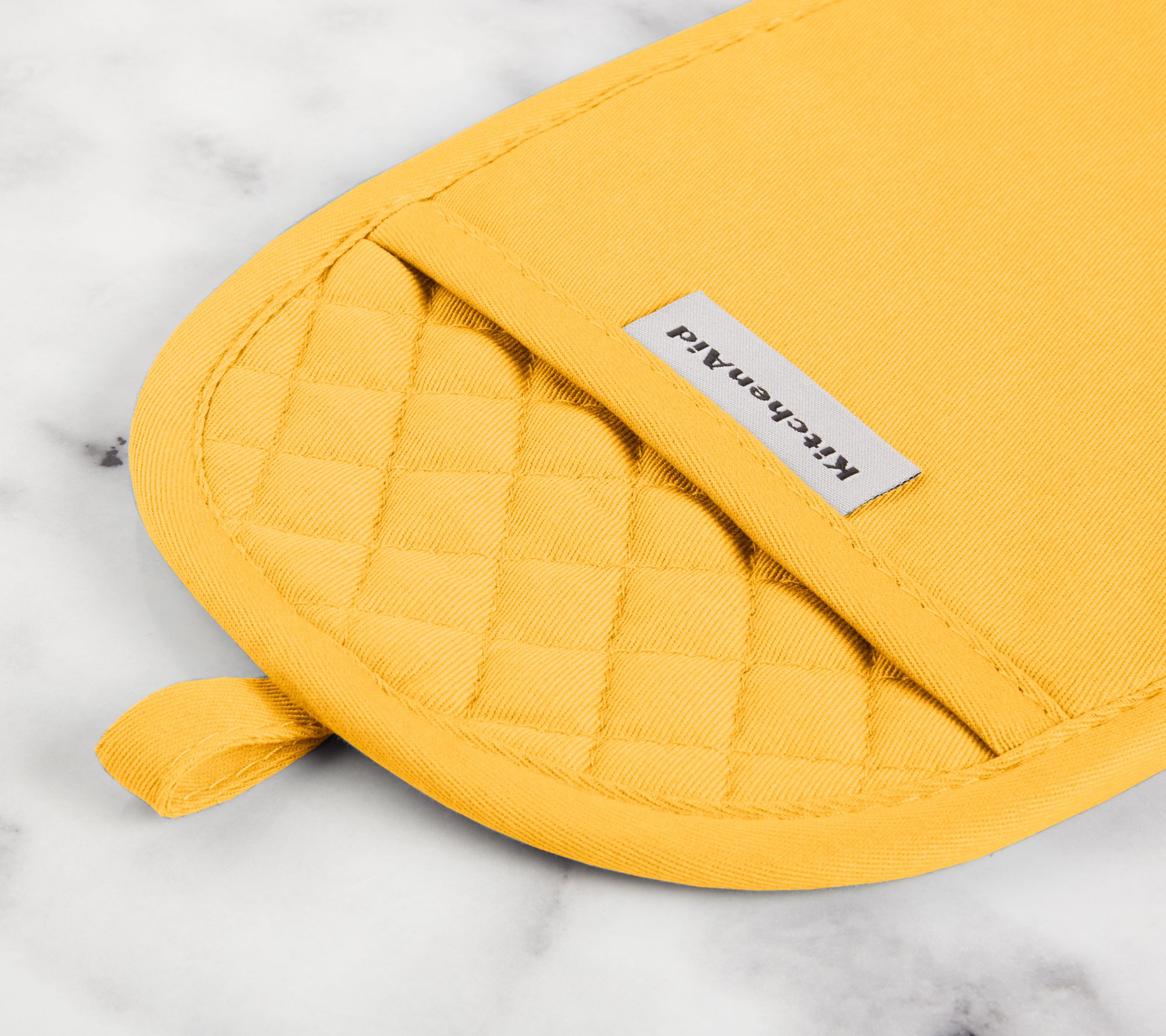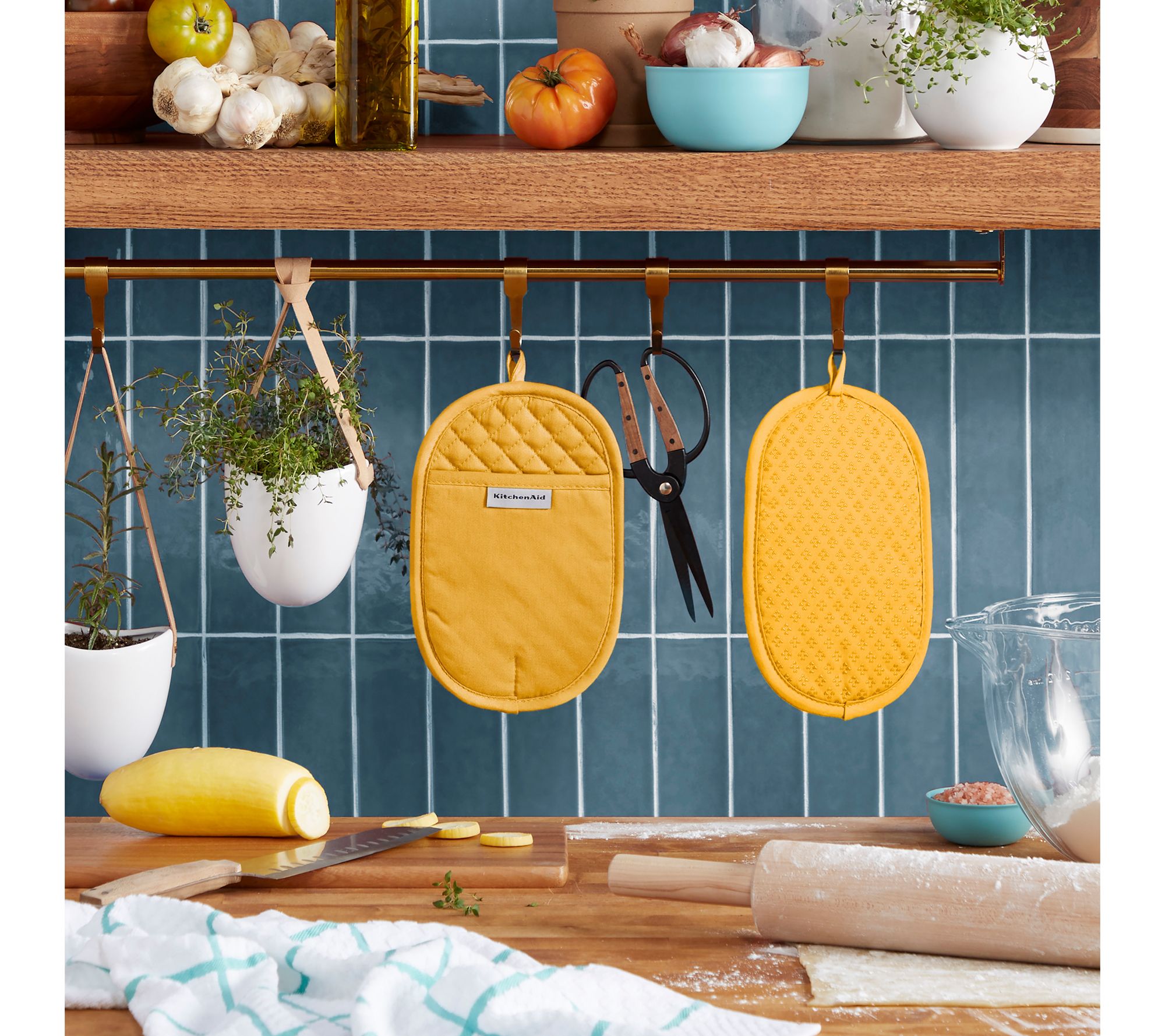 Things too hot to handle in the kitchen? These oval pot holders are crafted from heat-resistant cotton to help protect your hands from hot pots and pans and feature a heart-shaped silicone grip for a more secure hold. The hanging loop makes for easy storage when not in use. From KitchenAid.