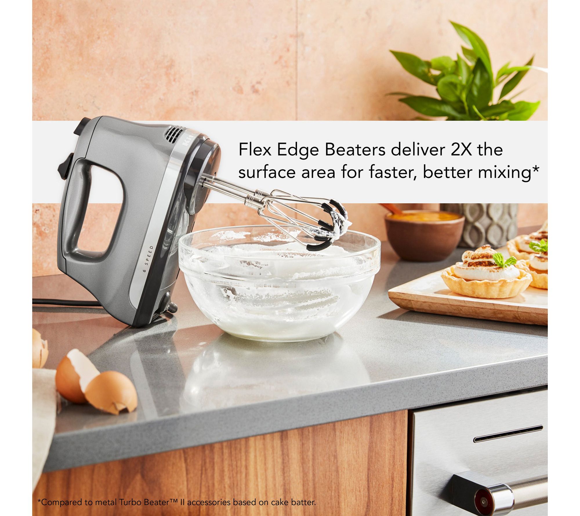 The Flex Edge Beater Accessory was designed for KitchenAid Hand Mixersto deliver 2X the surface area for faster, more thorough mixing, andalso reduces the need to scrape down sides of the bowl, when comparedto metal beaters. Fits KitchenAid Hand Mixer models KHM3, KHM5, KHM6,KHM7, KHM9, and KHMB7, sold separately.Compared to metal Turbo BeaterII accessories based on cake batter. Includes 2 beaters. 2x2x7.25;2 Beaters;2 Beaters