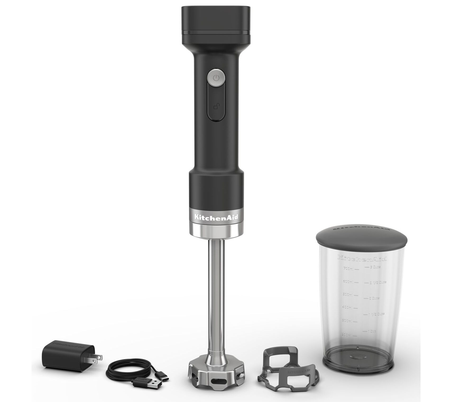 Includes variable speed cordless hand blender, 12V MAX removable battery, USB-C cable, wall adapter, 3-cup jar with lid, removable 7" blending arm with stainless steel blade, and removable pan guard