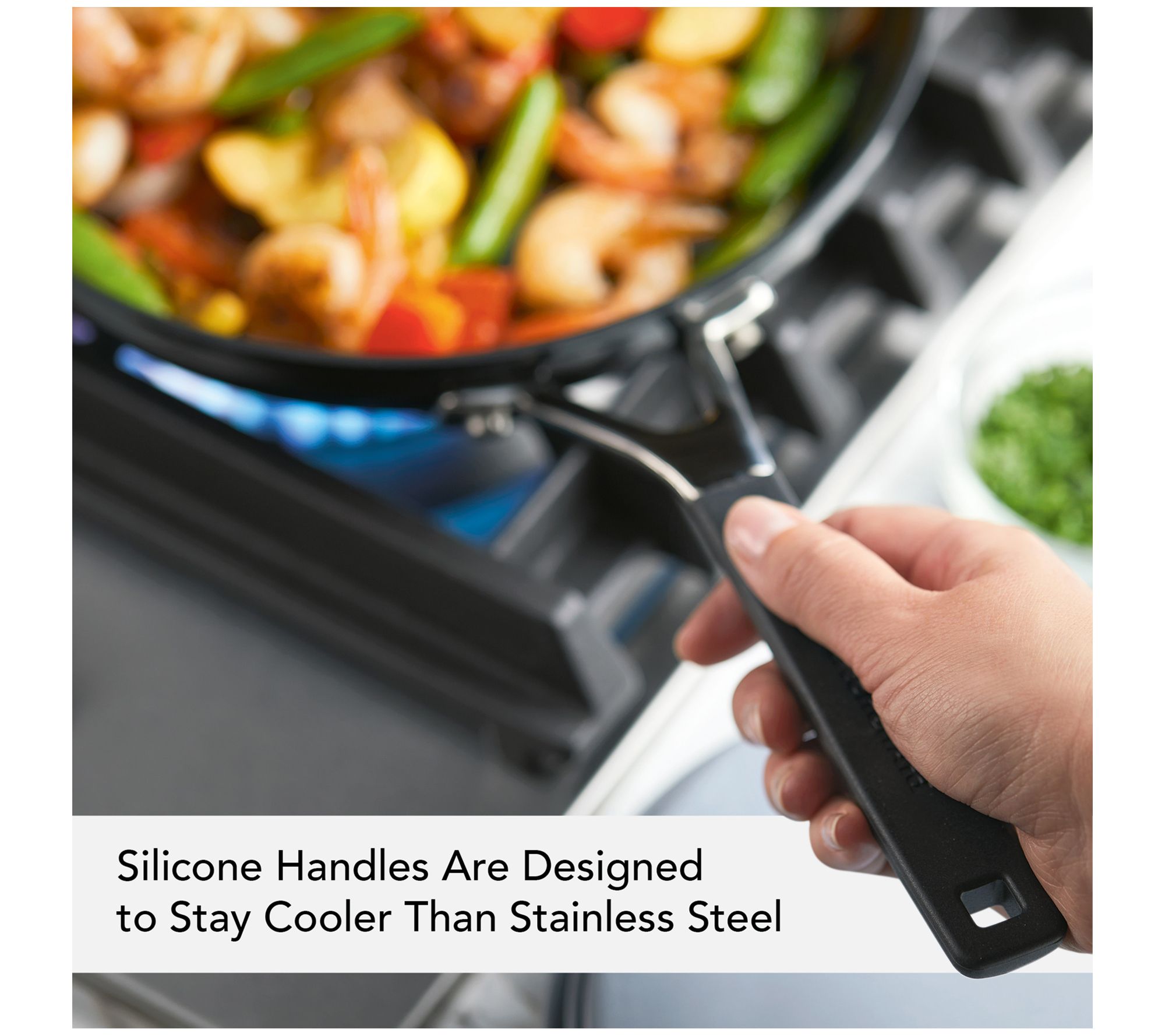 • Thick forged aluminum bases; hard anodized aluminum construction; dual riveted stainless steel handles; silicone grips