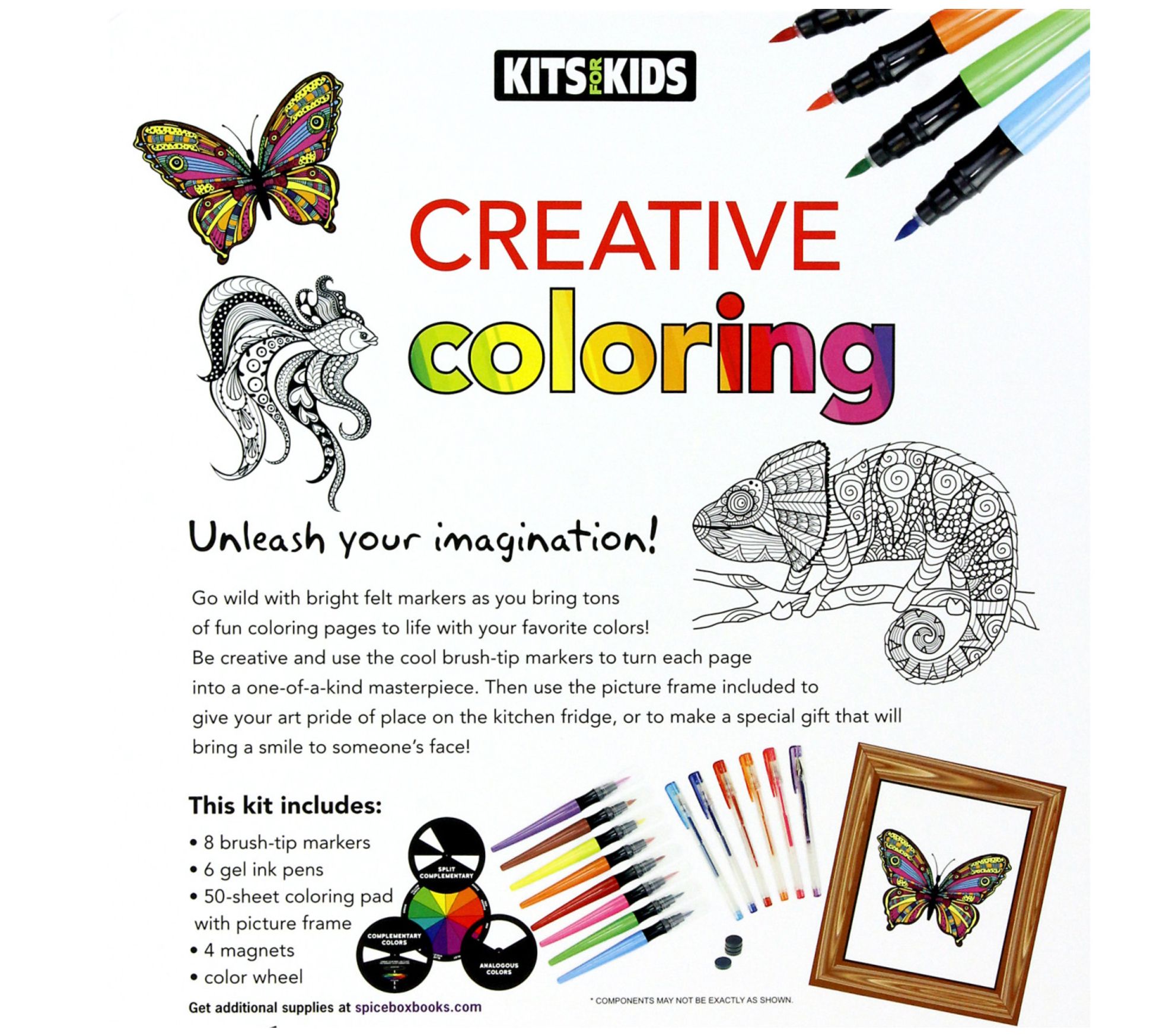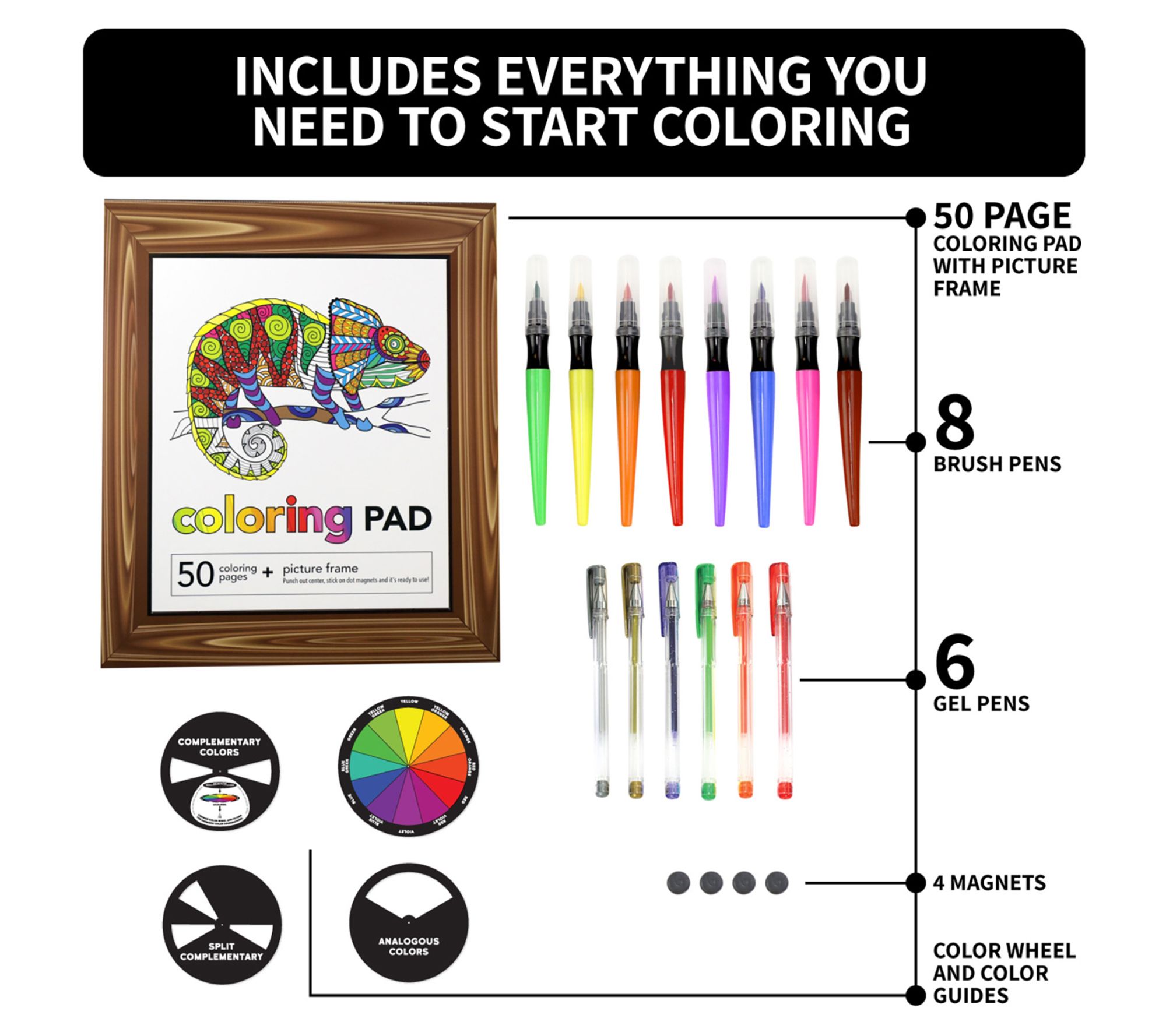 • Includes brush-tip markers, gel ink pens, coloring pad with picture frame, magnets, and color wheel