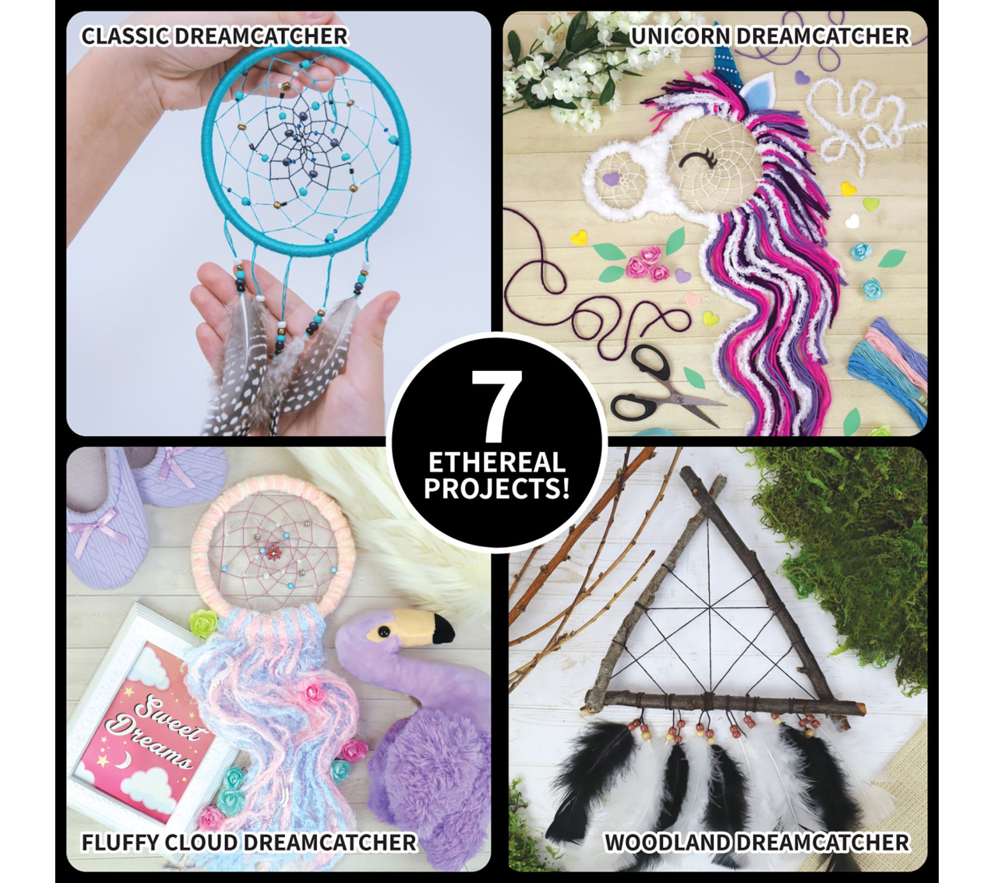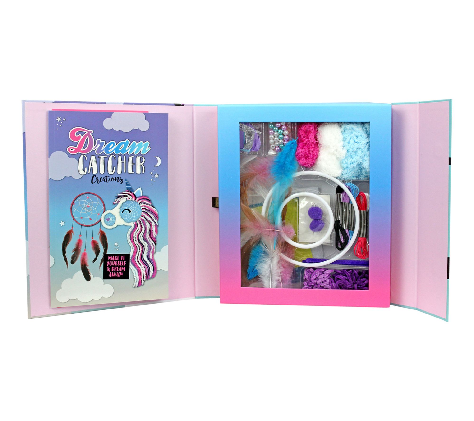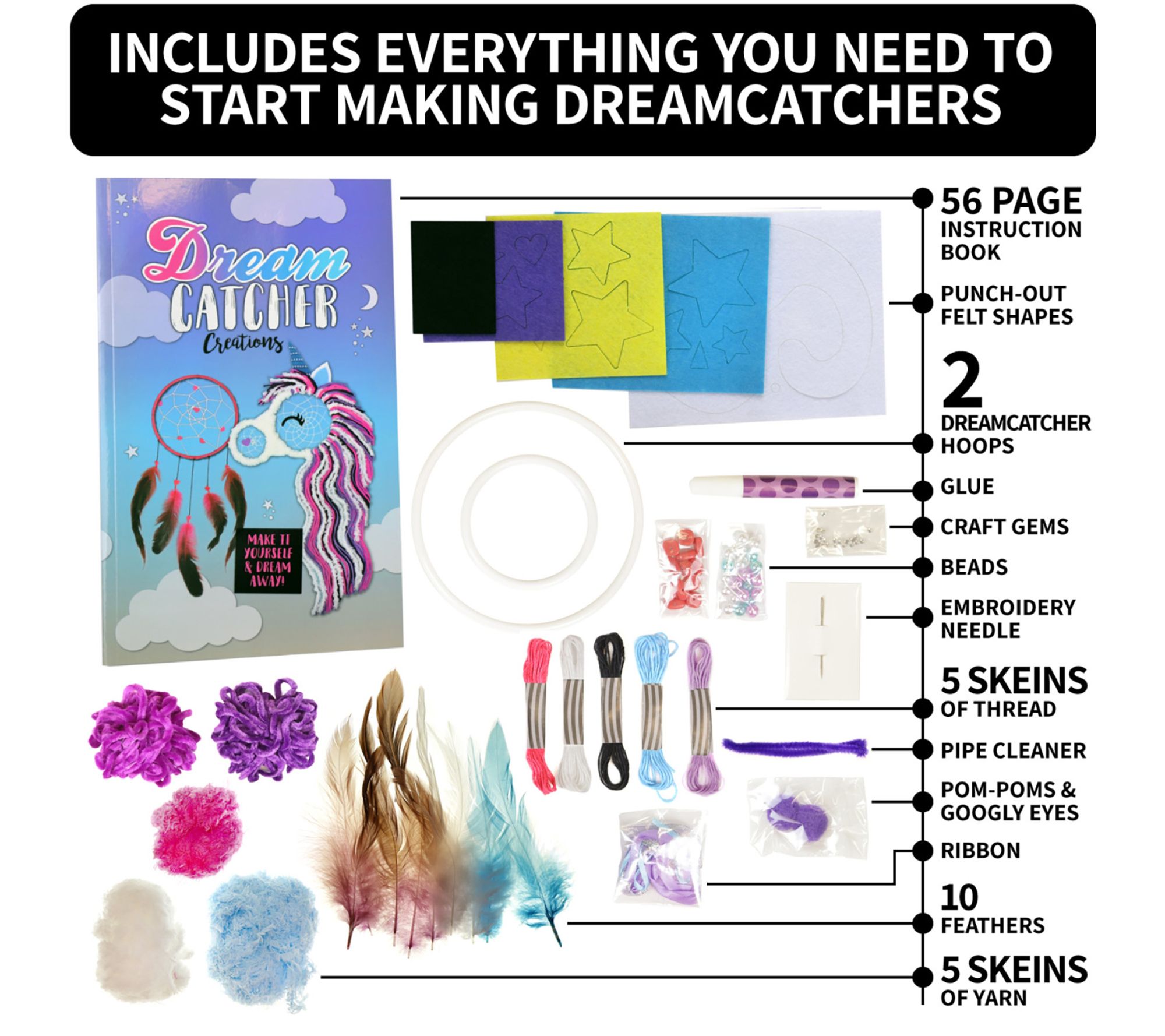 • Includes two dreamcatcher hoops, assorted yarn (76 ft), five skeins of thread, three skeins of ribbon, craft glue, embroidery needle, 10 feathers, assorted beads, 20 craft gems, pipe cleaner, two pom-poms, two googly eyes, and assorted precut felt shapes.