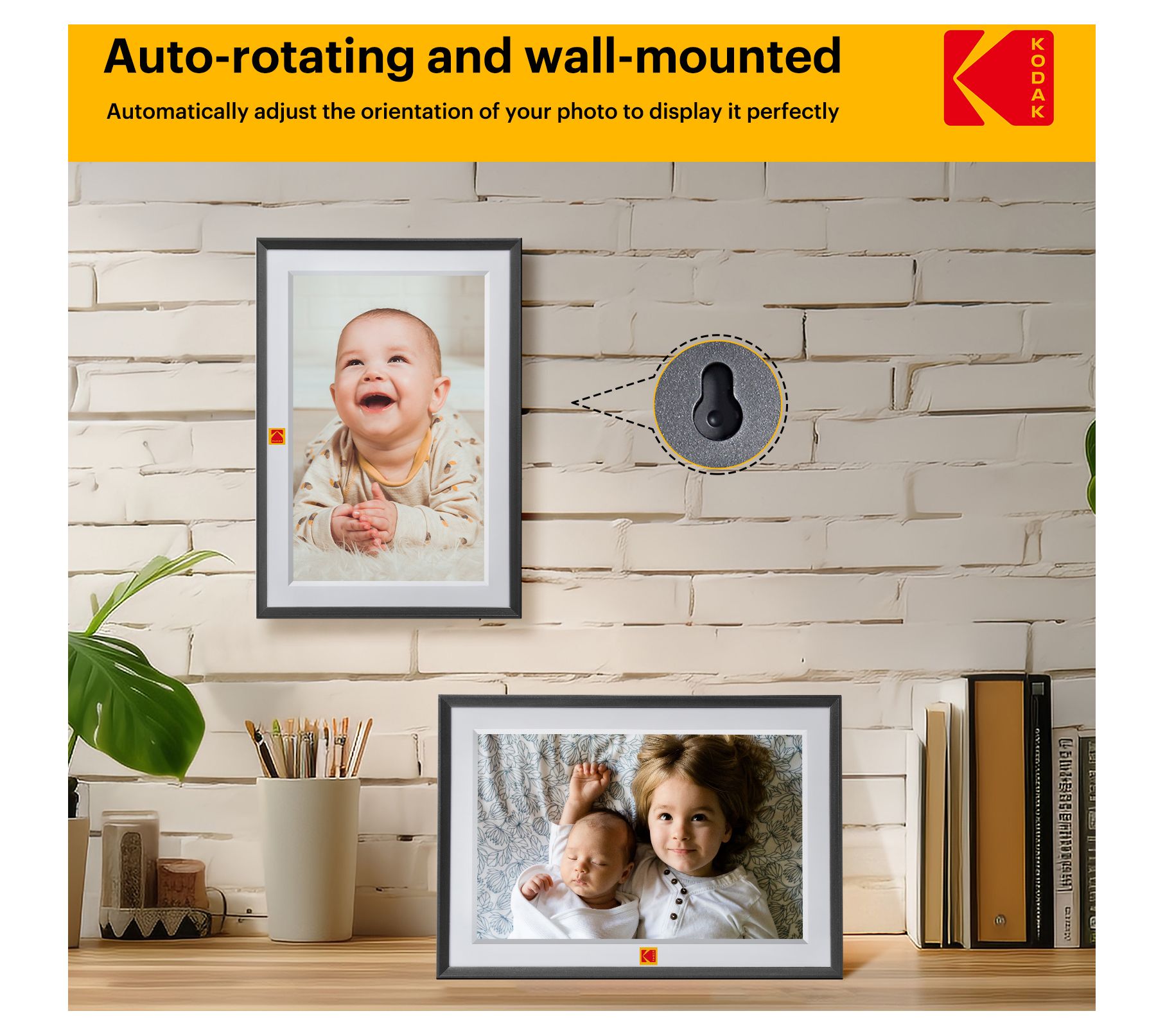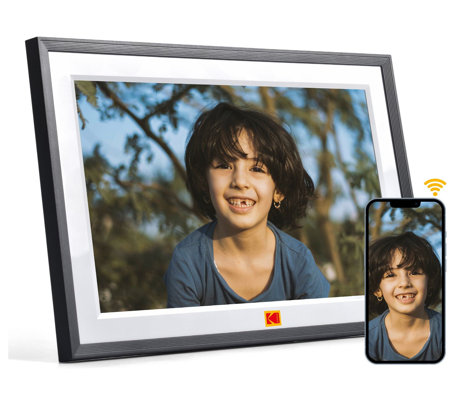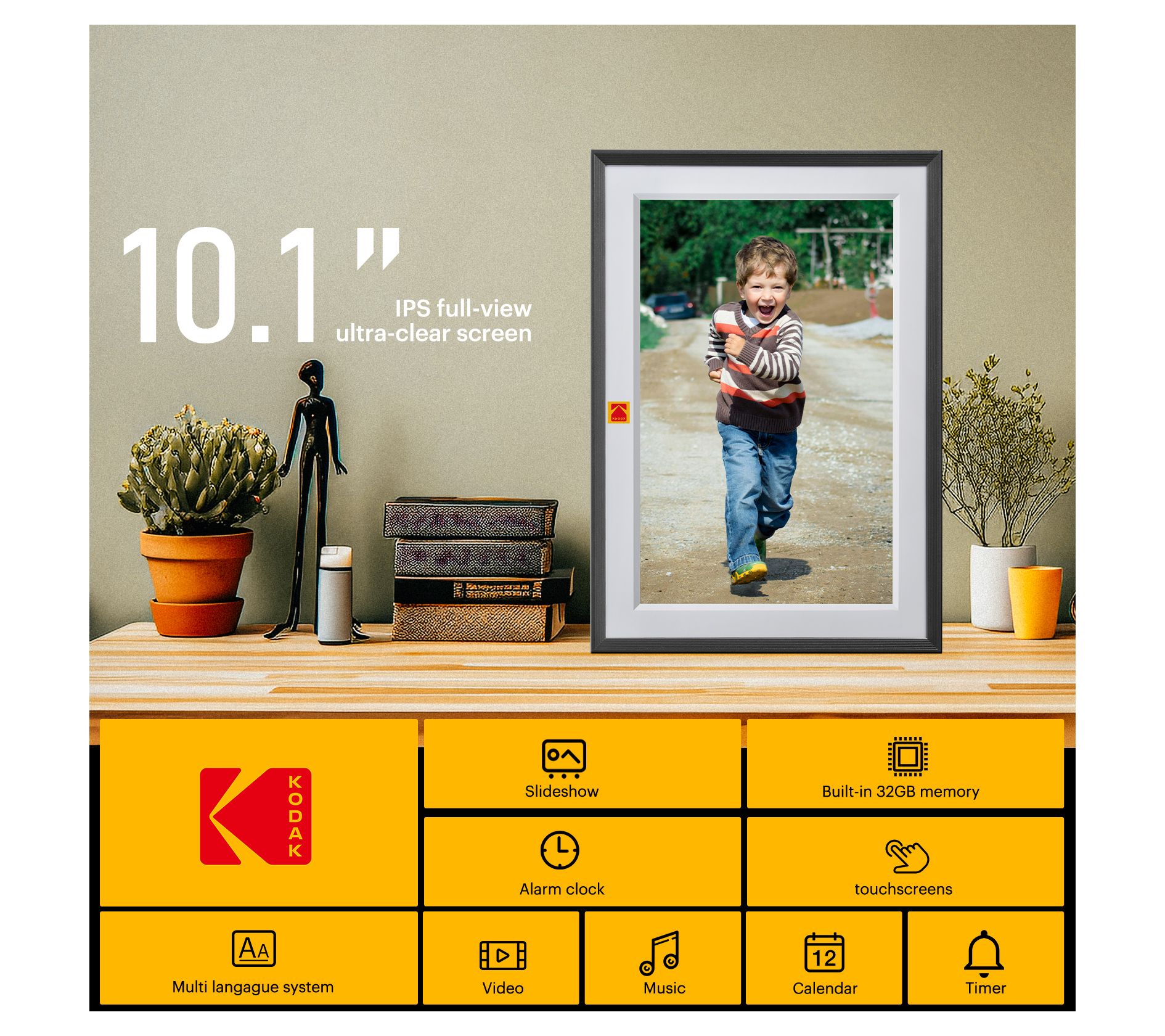 Capture favorite moments and bring them to life on the Kodak 10.1" digital photo frame, designed to showcase vibrant photos, music, and even videos. Share special memories with loved ones near and far via Wi-Fi, app, and email, then add weather, calendar, and clock features for extra everyday convenience. Keep your memories on display and ready to enjoy, all in one frame. From Kodak.