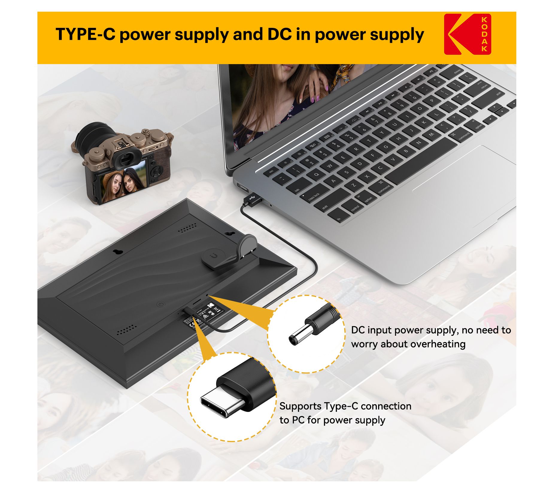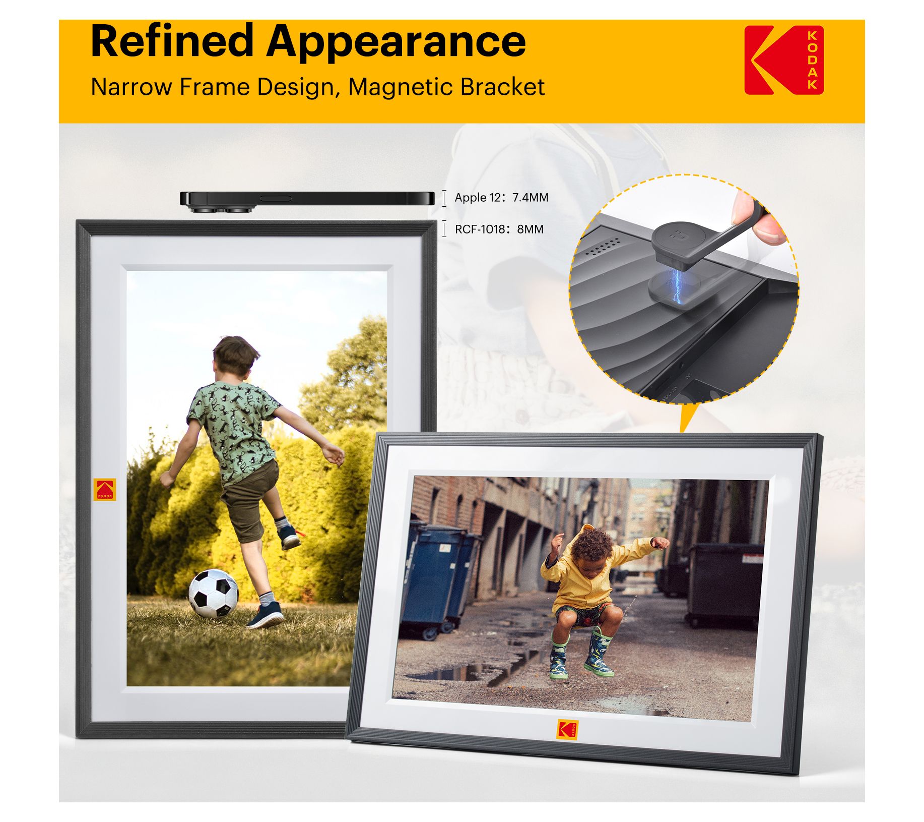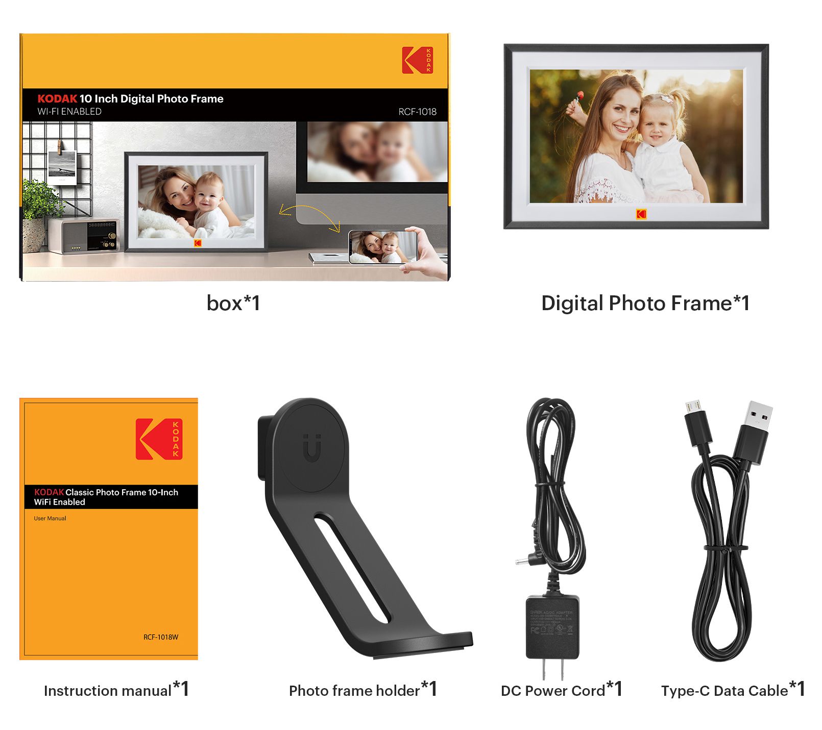 Capture favorite moments and bring them to life on the Kodak 10.1" digital photo frame, designed to showcase vibrant photos, music, and even videos. Share special memories with loved ones near and far via Wi-Fi, app, and email, then add weather, calendar, and clock features for extra everyday convenience. Keep your memories on display and ready to enjoy, all in one frame. From Kodak.