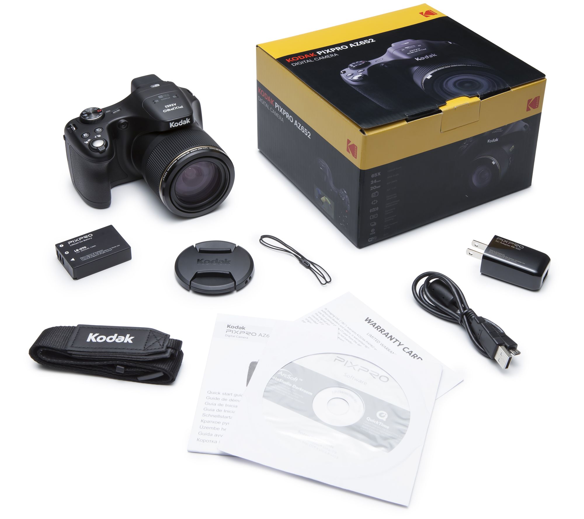 Includes Kodak PIXPRO AZ652 digital camera with AC adapter, USB cable, neck strap, lens cap, CD-ROM, and quick-start guide
