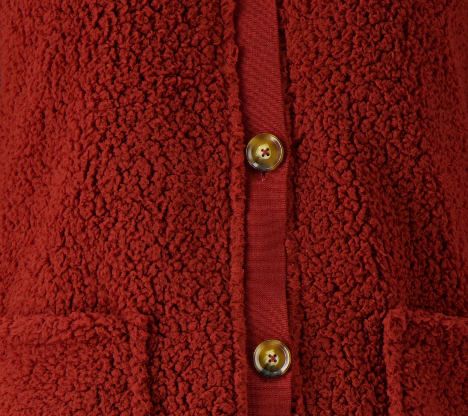 - Features: popcorn Sherpa, V-neckline, front pockets, four buttons, side slits