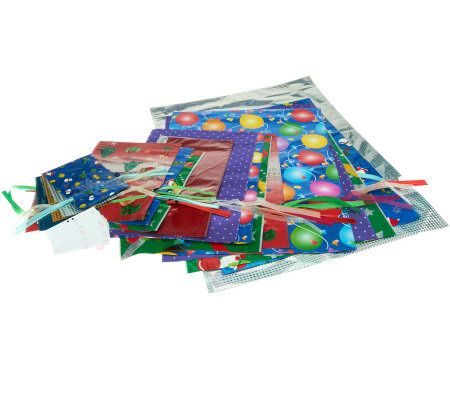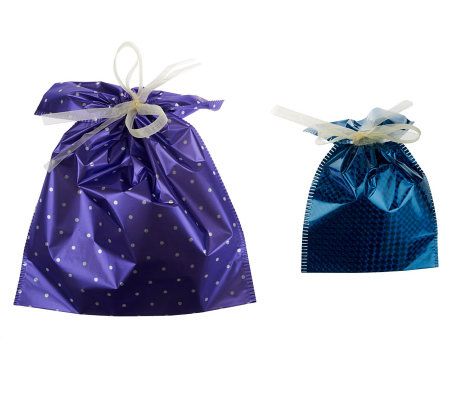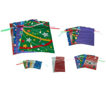 The joy of giving! Done in a variety of sizes, shapes, and colorful designs, this 50-piece gift bag set comes with everything you'll need to create perfect packages. Merriest of all, an attached drawstring ribbon secures your bag and creates a beautiful bow. From Kringle Express.