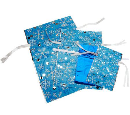 Gift wrapping as easy as 1-2-3. First, place your gift in one of this gift bag set's perfectly sized festive bags with a durable, reusable film. Second, use the drawstring ribbon to secure the top of the bag. Third, attach one of the coordinating gift tags. Giving never felt like such a gift! From Kringle Express.