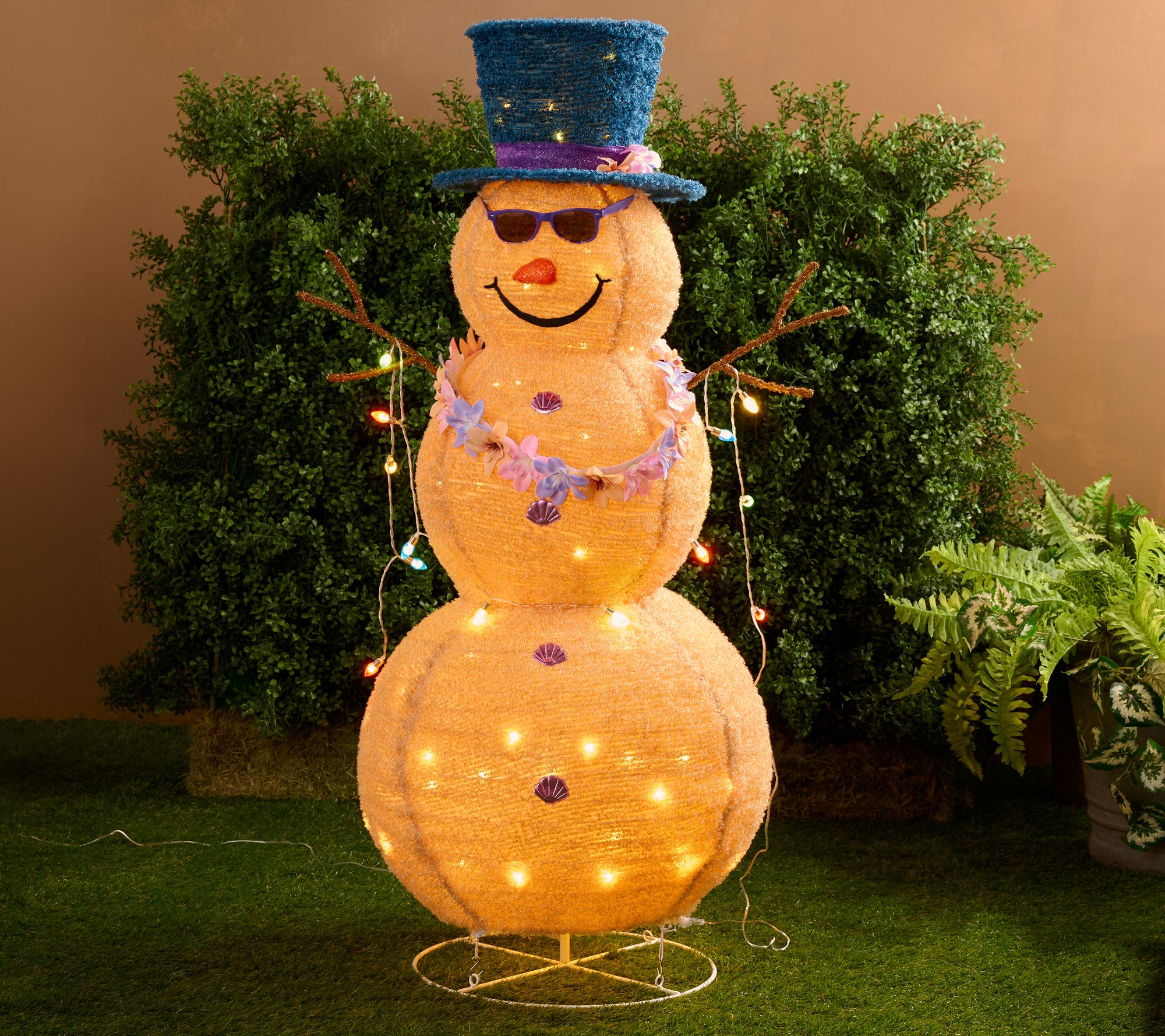 With chic sunnies and a fun flower lei slung across his shoulders, this sun-loving snowman delights even in the icy cold of winter! Add whimsy and a twinkling twist to traditional holiday decor with this light-up snowman -- or be summer-ready to celebrate Christmas in July. From Kringle Express.