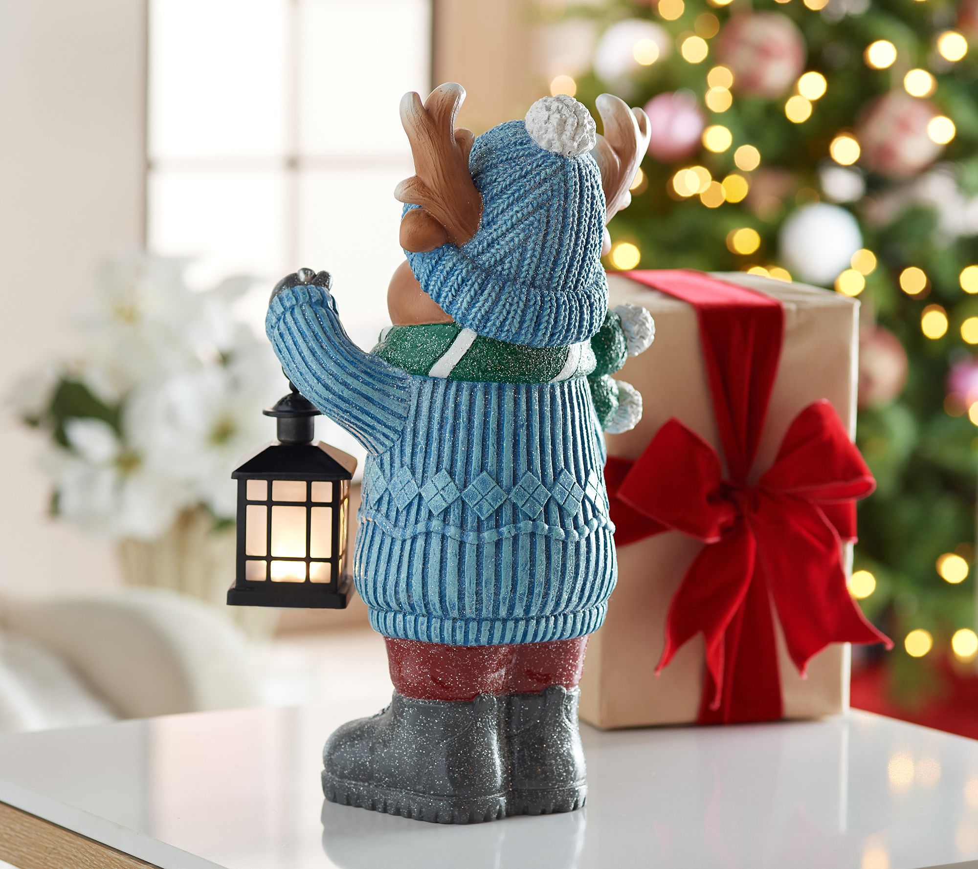This warm and cheery holiday friend figurine holds a lantern that lights up and sports a cozy winter sweater. From Kringle Express.