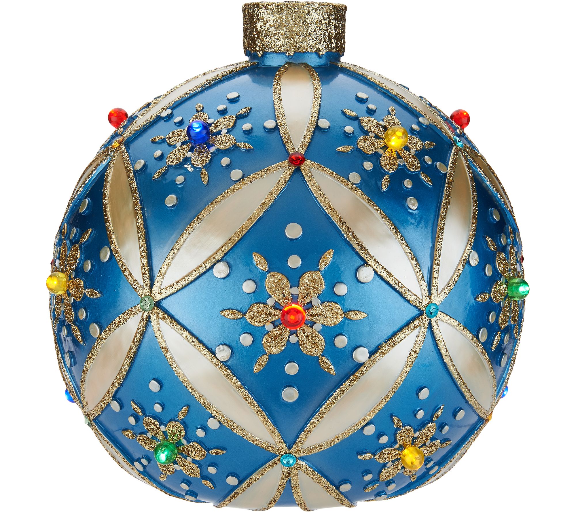 • Oversized ornament ornately decorated with glittered snowflake and ribbon pattern
