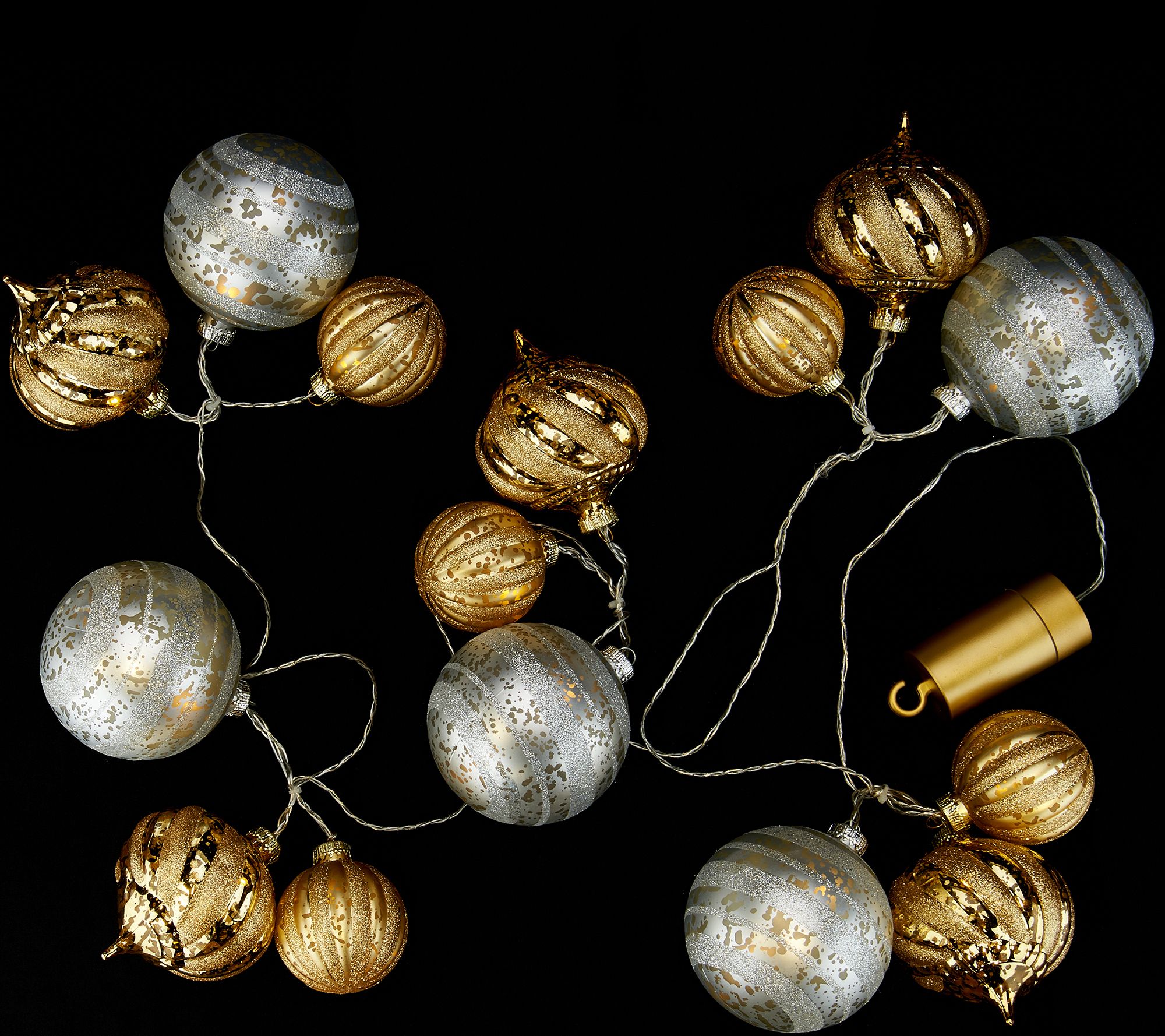 • Three ornaments in various sizes and shapes with glittered patterns clustered together