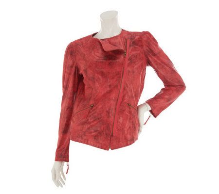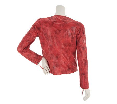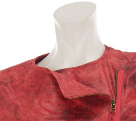 Biker chic. Zip closures add functional fashion to this embossed, faux leather moto jacket. It tops off your outfit with a look that's a bit edgy, but still lets you maintain your sophisticated style. From the Kris Jenner Kollection.