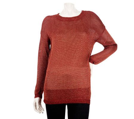 Pullover style, metallic threads, scoop neckline, long sleeves and hem with 1x1 rib trim