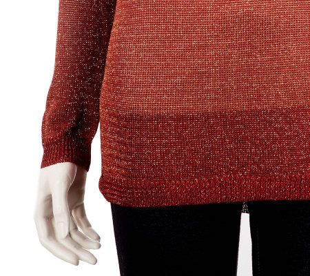 Understated shine. You don't need sequins, rhinestones, beads, and baubles to make an impact, this pullover sweater's metallic detail ensures you stand out for your stellar sense of style. From the Kris Jenner Kollection.