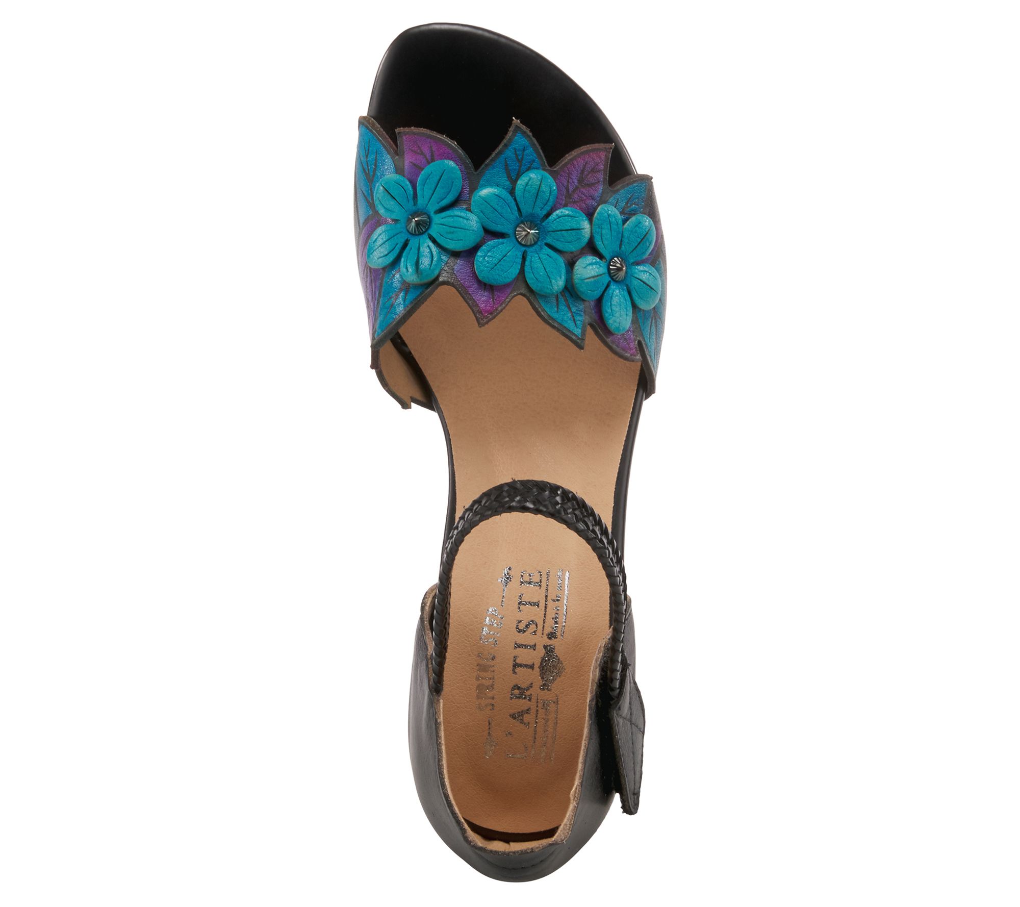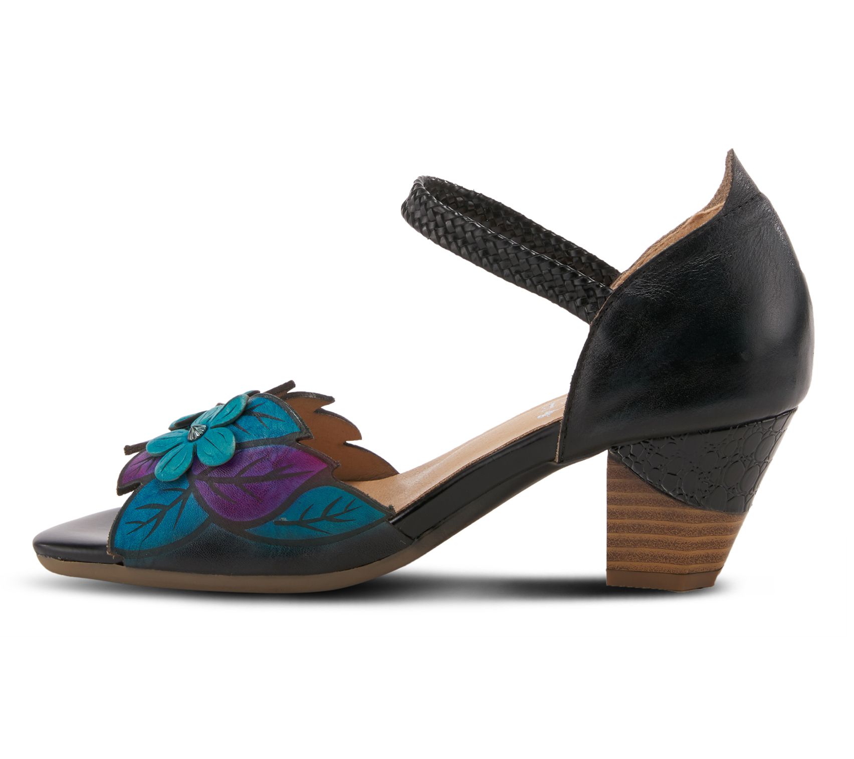 • Braided ankle strap with hook and loop closure, front strap adorned with floral accents, stacked-look heel tapered toe