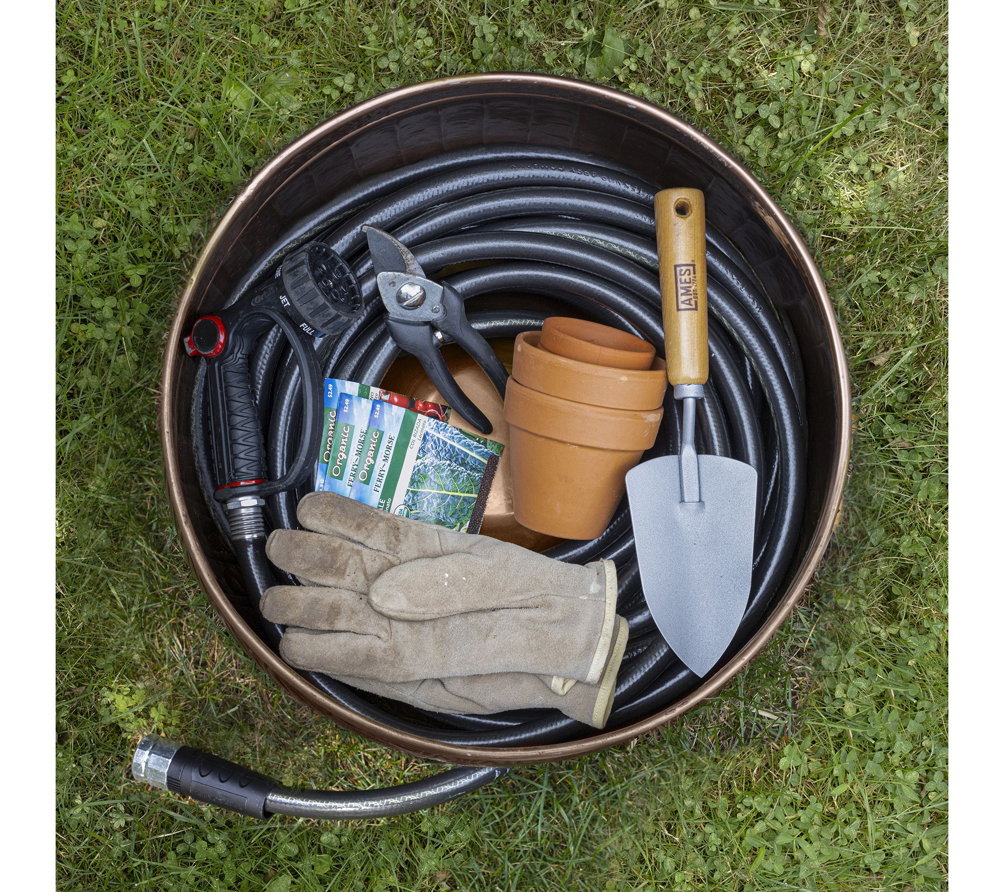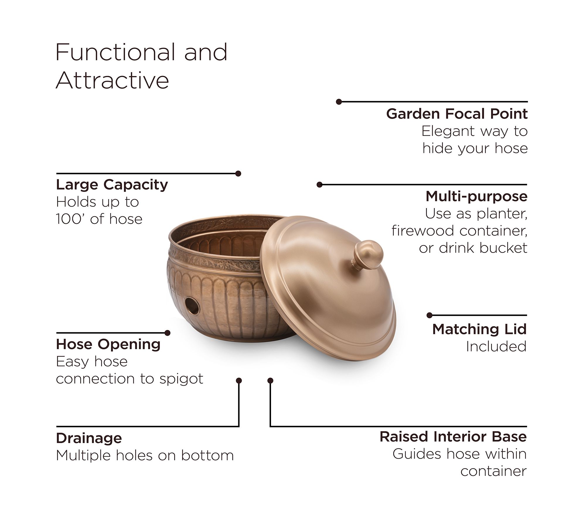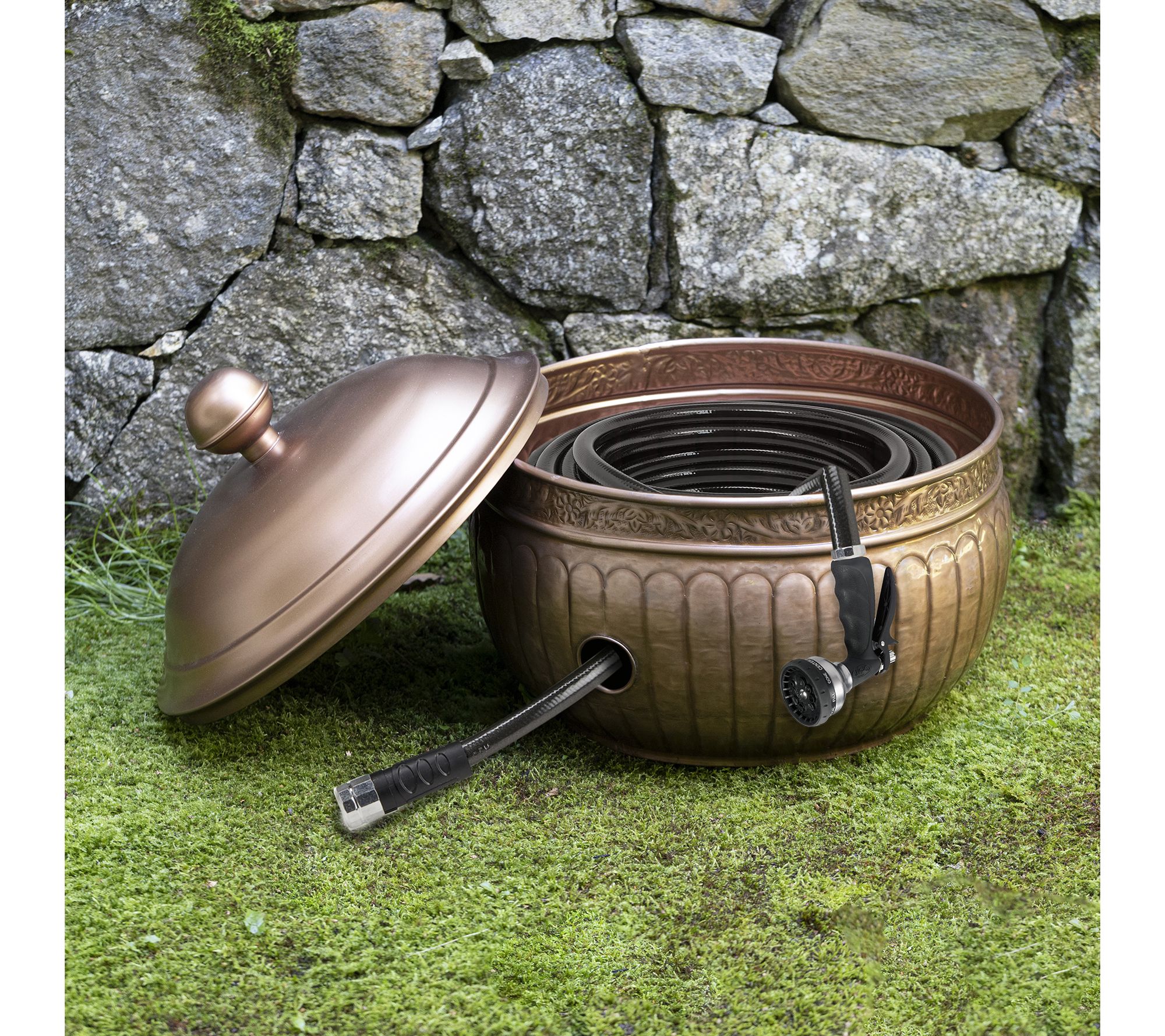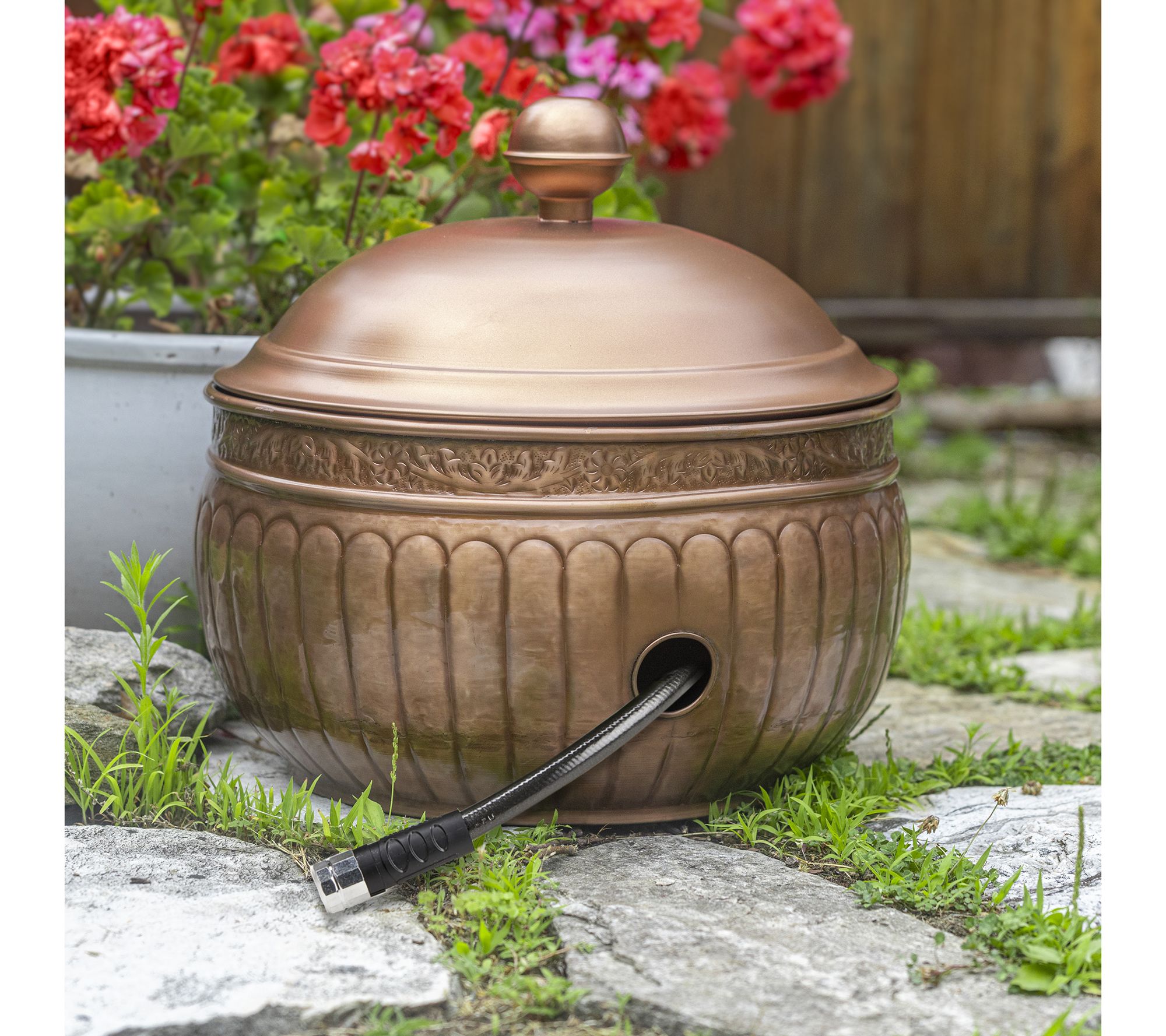 Keep your garden hose organized and enhance your outdoor space with the elegant La Jolla hose pot with lid in a sophisticated copper finish. Its dual-purpose design hides unsightly hoses while adding charm and practicality to your yard. The raised interior base ensures smooth hose management, and multiple drainage holes prevent water buildup. From Good Directions.