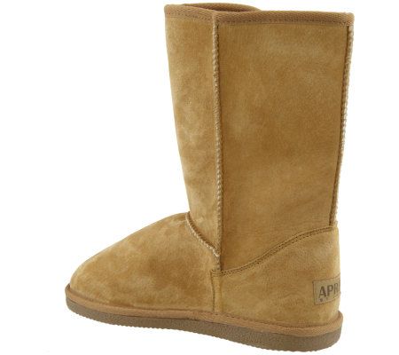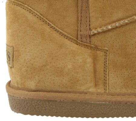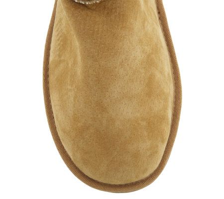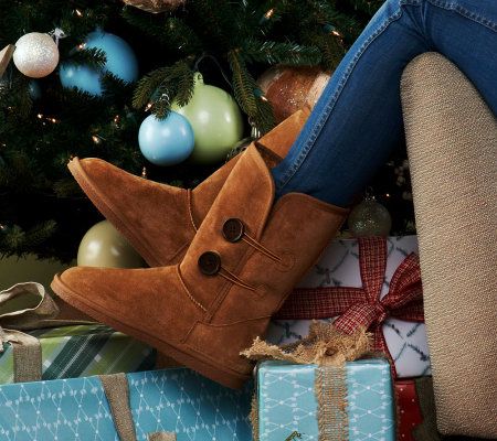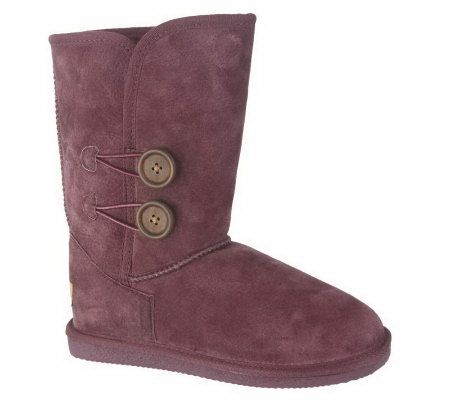 Your shoes say something about your style. These pull-on boots proclaim your posh fashion sense loud and clear with suede fabric, faux fur, and button detailing. From Lamo.