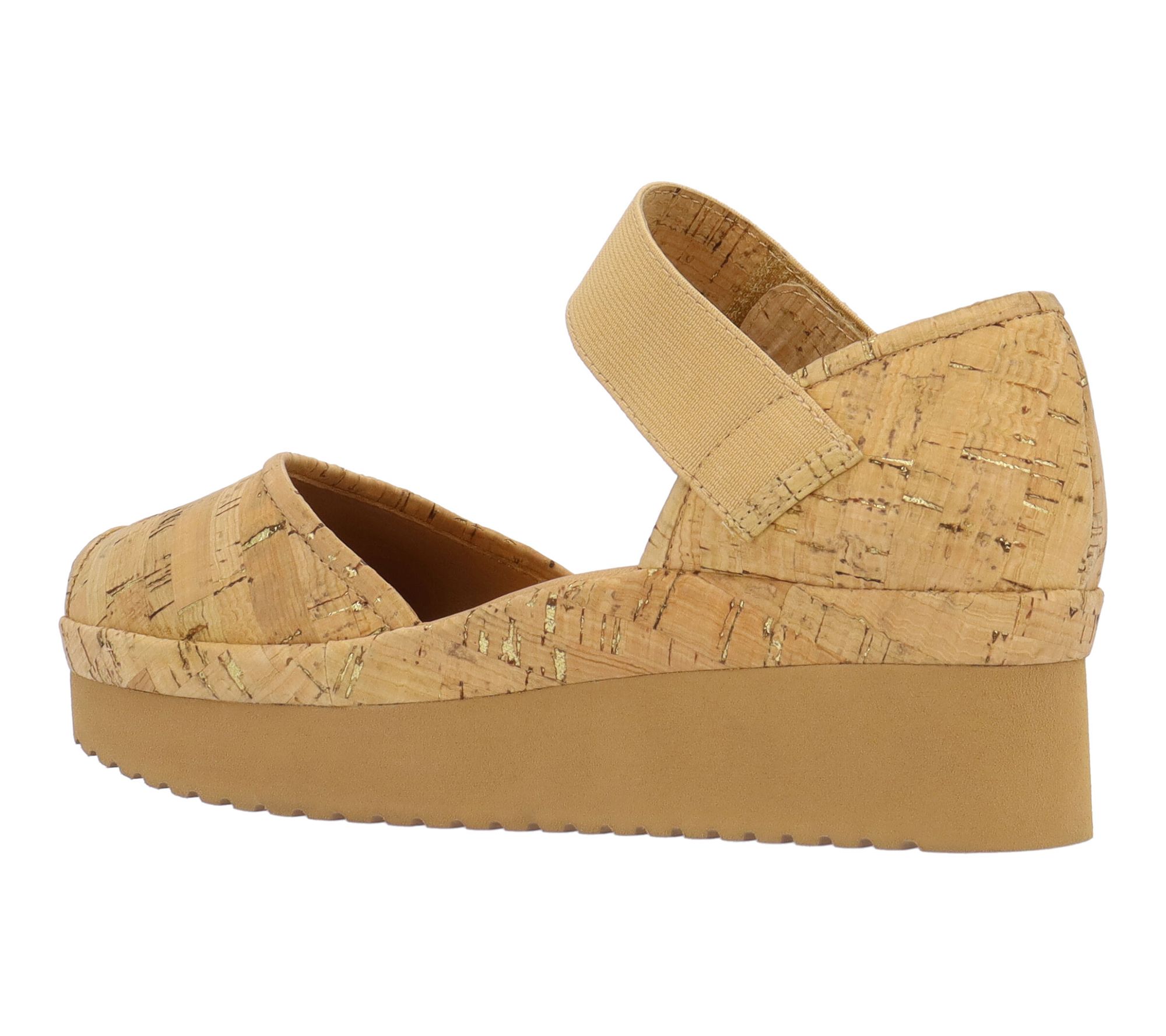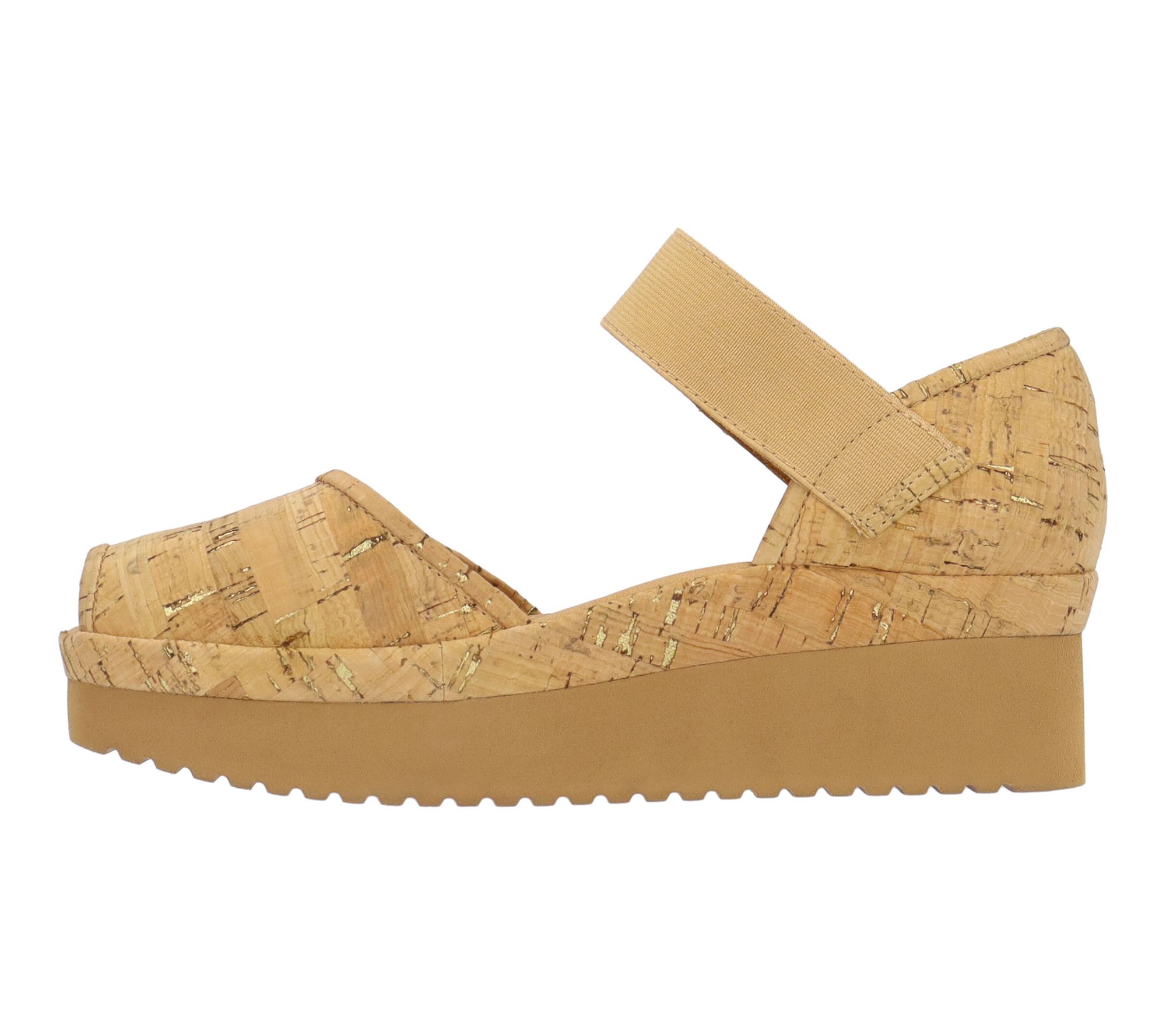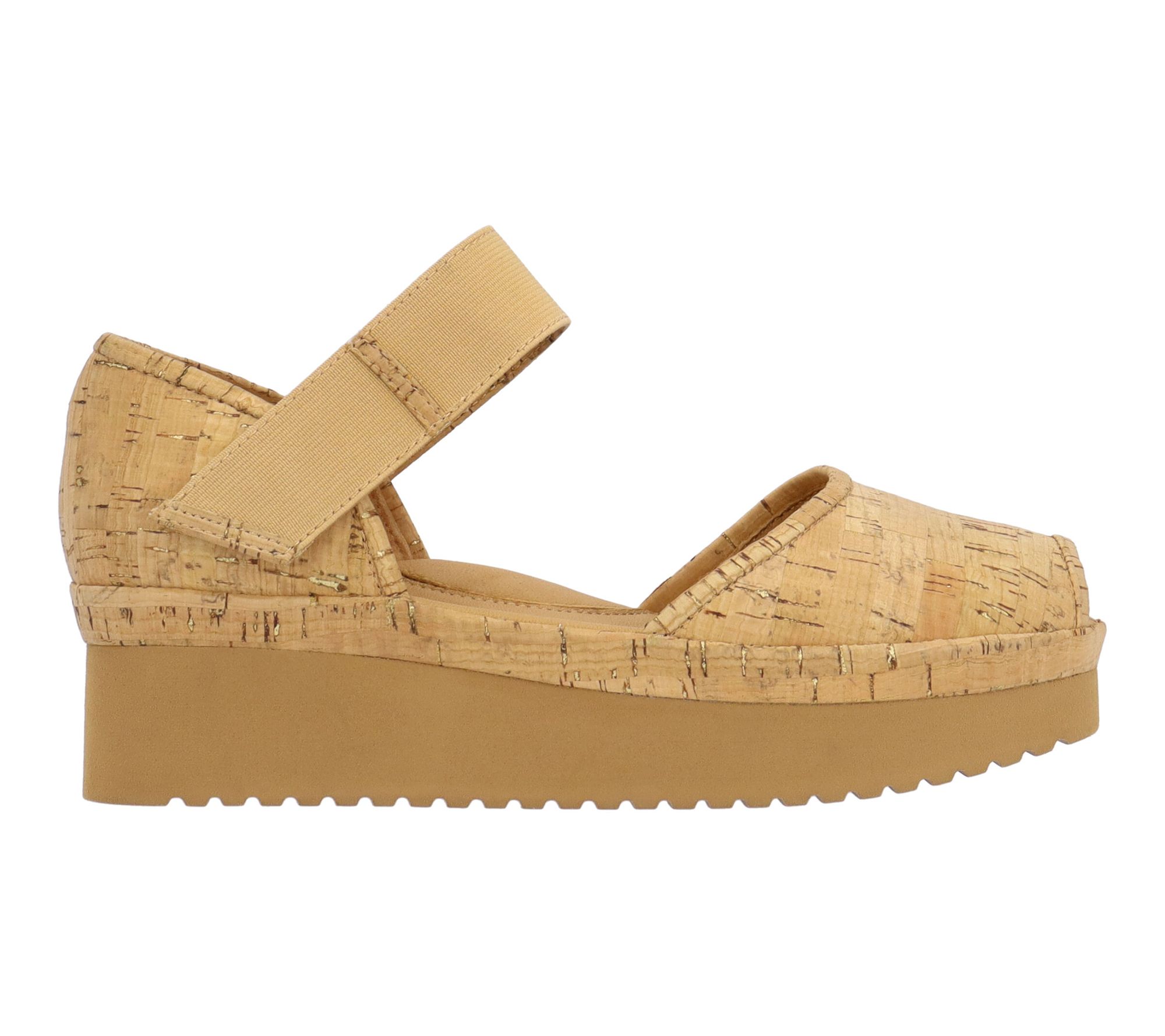 • Hook-and-loop closure, rounded toe, goldtone cork upper