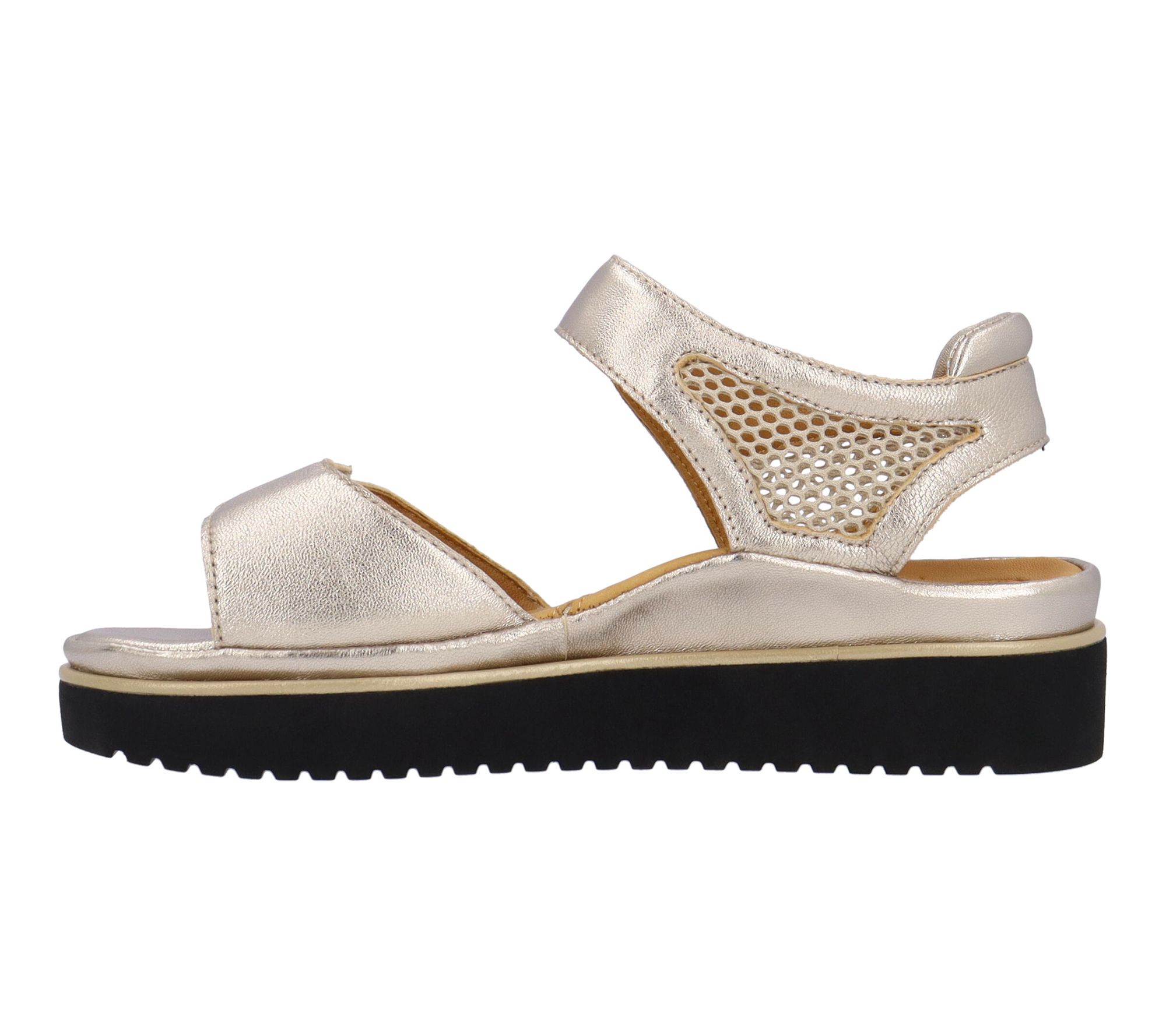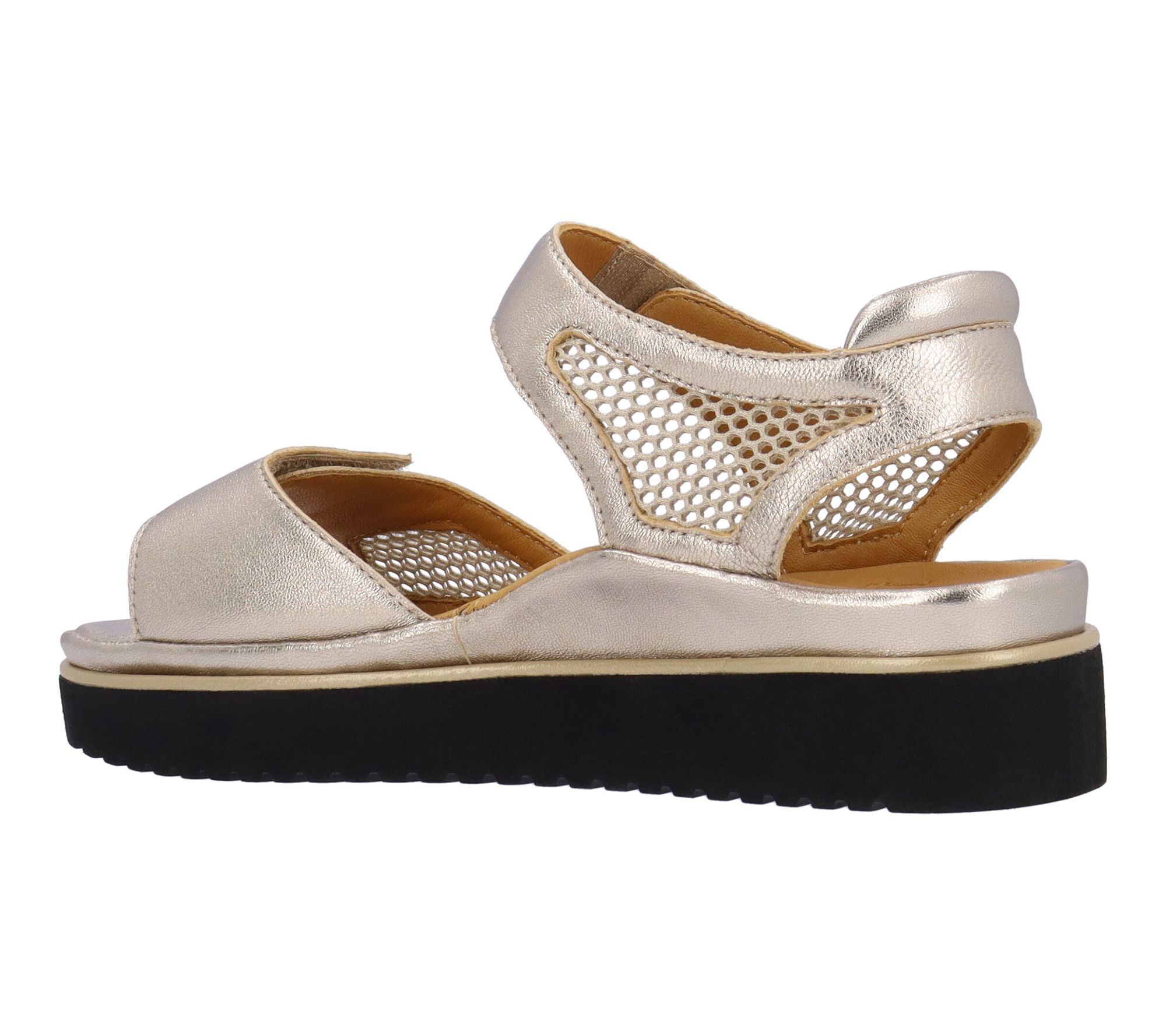 Bask in sunny day adventures with these sandals, designed for comfort with a memory foam insole and a chic mix of champagne leather and mesh. Effortless to slip on with a hook-and-loop closure, they boast a gentle heel that brings just enough lift for strolls along the boardwalk or gatherings with friends. From L'Amour Des Pieds.
