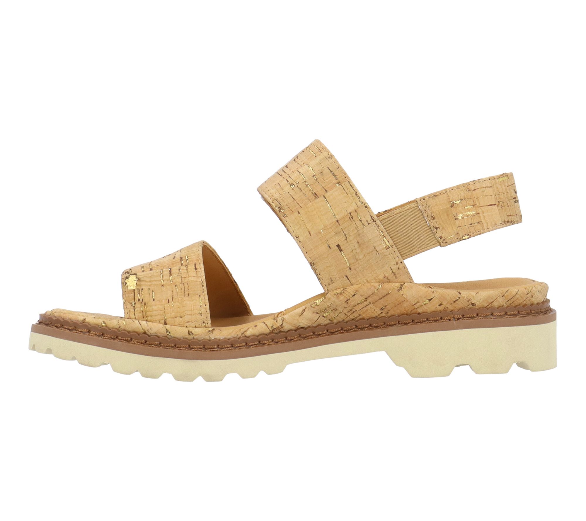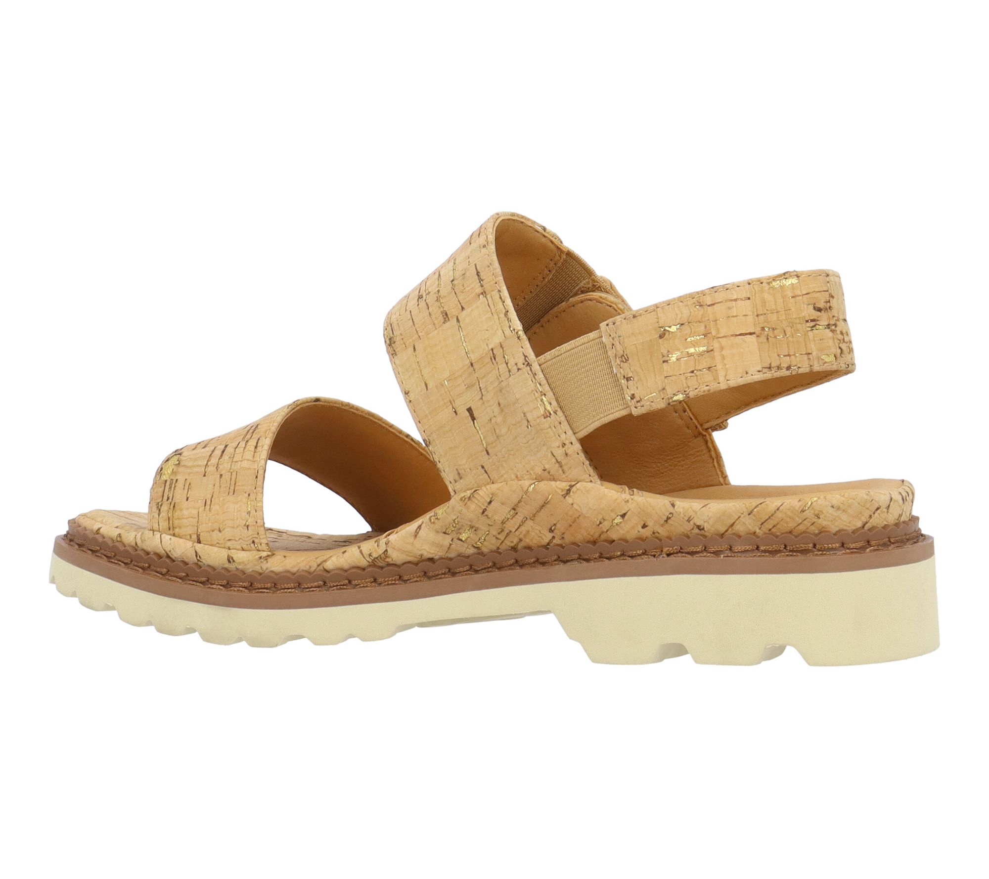 Open-toe slip-on sandal design features cork upper, hook-and-loop closure