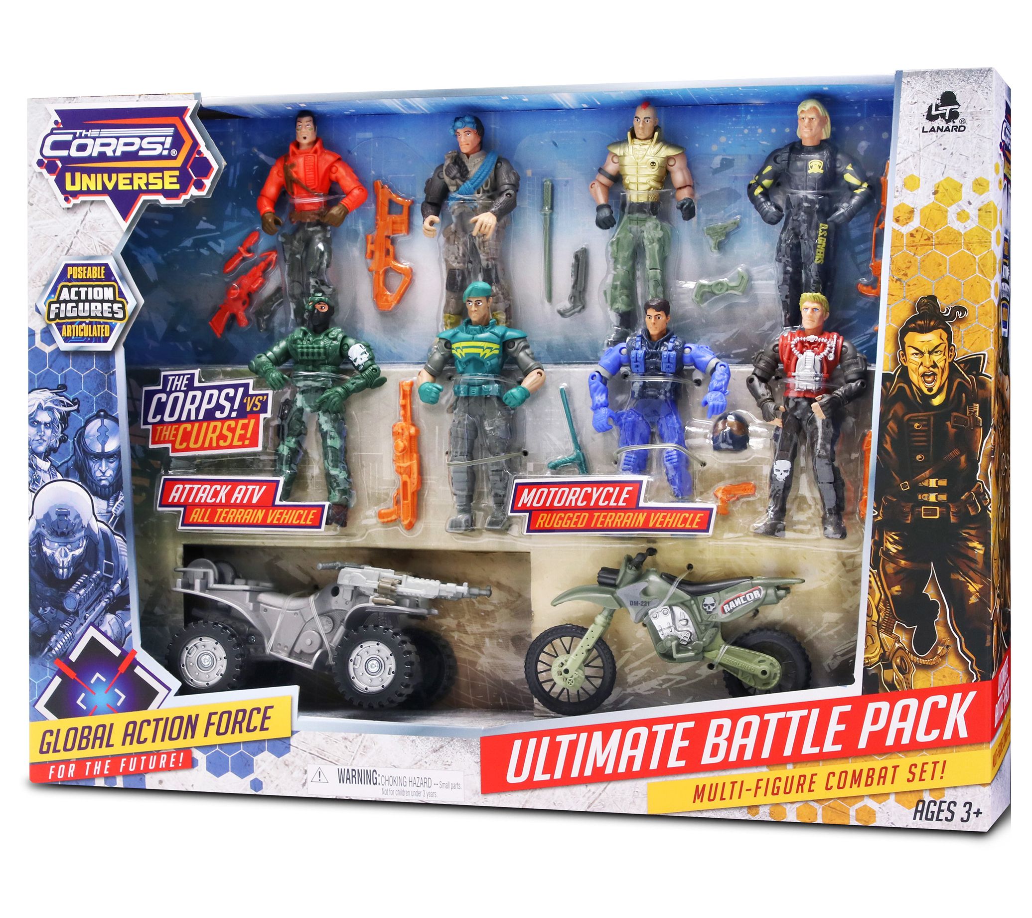 Gear up for battle with The Corps vs The Curse action-figure set. It comes with eight poseable figures, weapons, accessories, ATV, and motorcycle for action-packed, role-playing adventures. From Lanard.