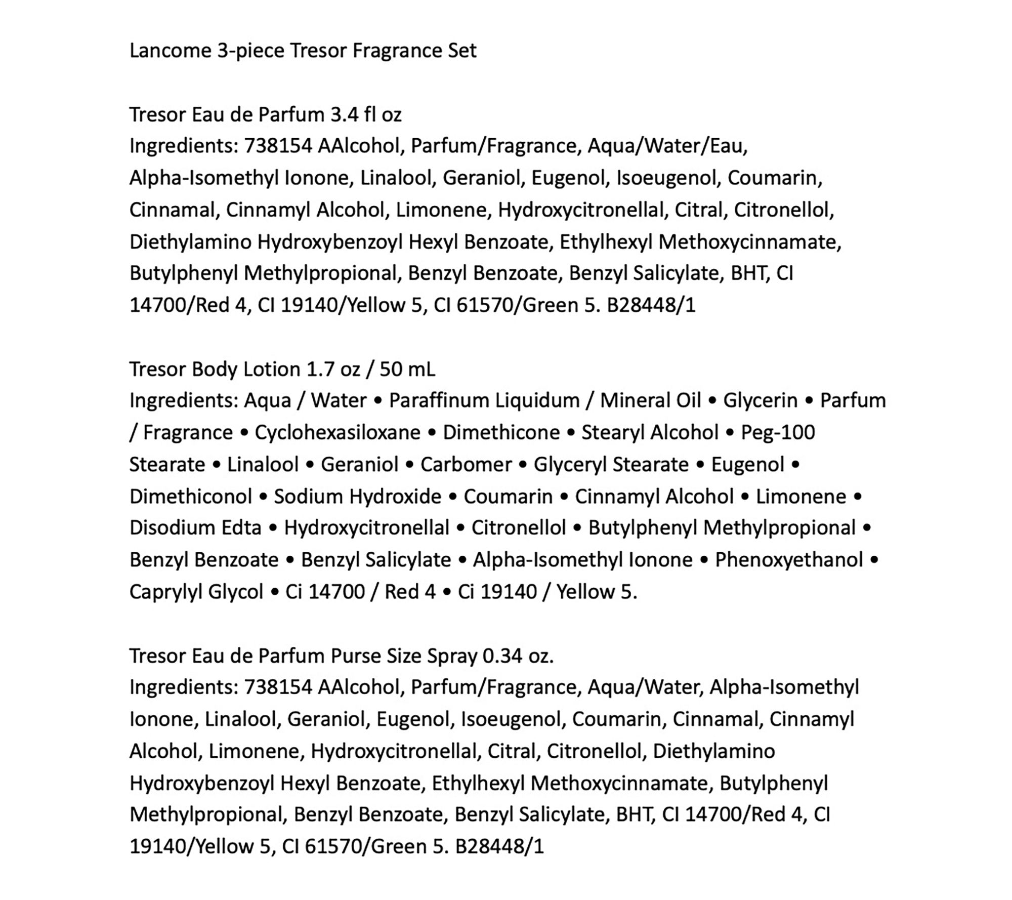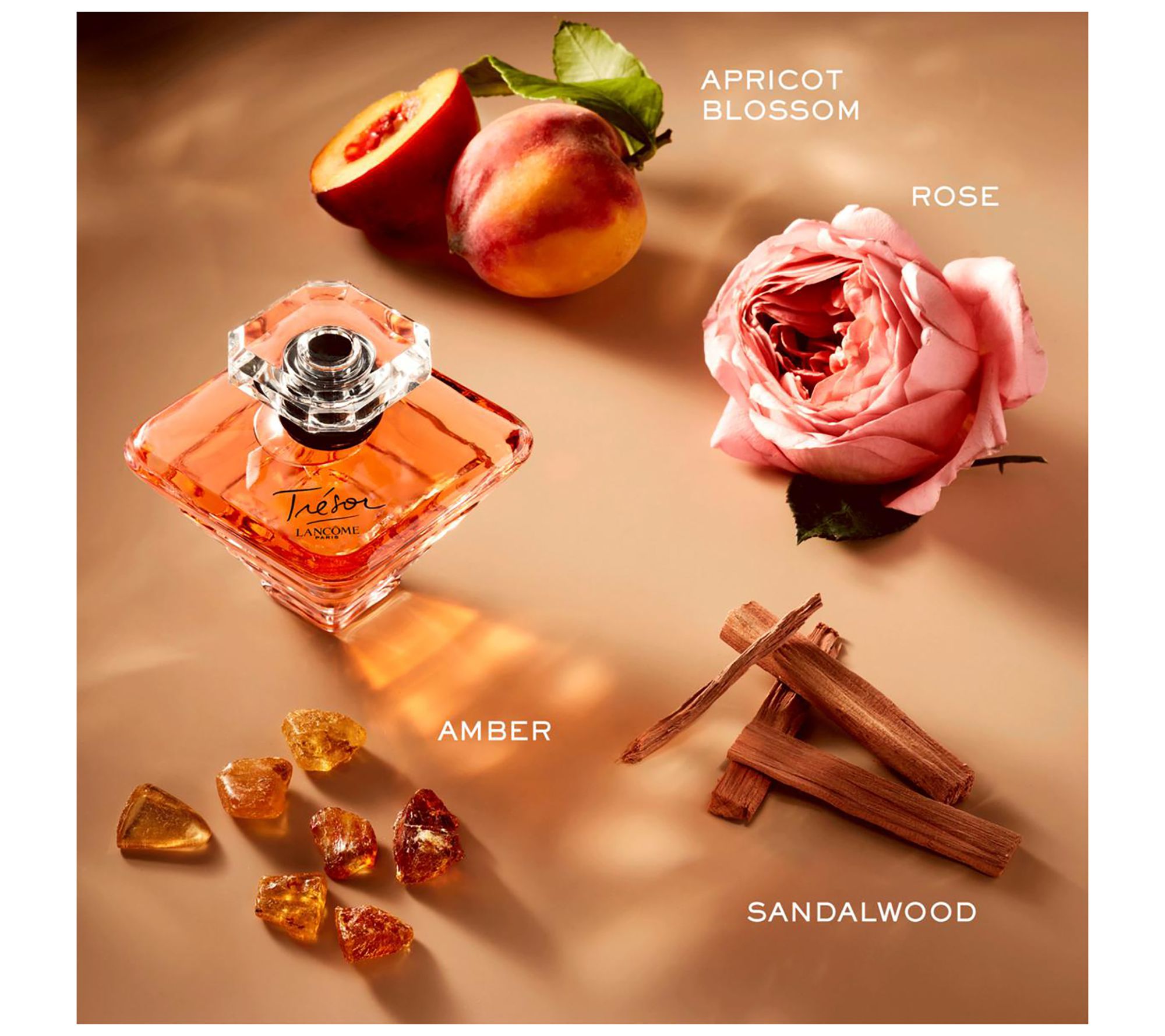 Indulge in three versions of the romantic and sensual Lancome Tresor: an eau de parfum to keep on your dresser, a purse-size spray to keep in your handbag, and a body lotion so you can layer the head-turning scent. The elegance of rose, muguet and lilac, the sparkle of apricot blossom; a glorious golden coral, so every drop opens like petals on the skin. The EDP bottle is an inverted glass pyramid with rounded edges, representing the softness of the wearer; the band is black, a subtle reminder of the power of love and the woman embracing it. The bottle is topped with an iconic diamond-shaped cap.