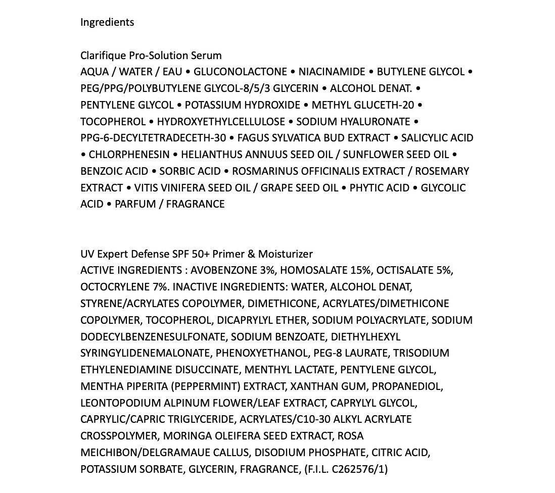 Clarifique Pro-Solution is a concentrated serum formulated with 10% PHA (polyhydroxy acid), niacinamide, and beech bud extract.