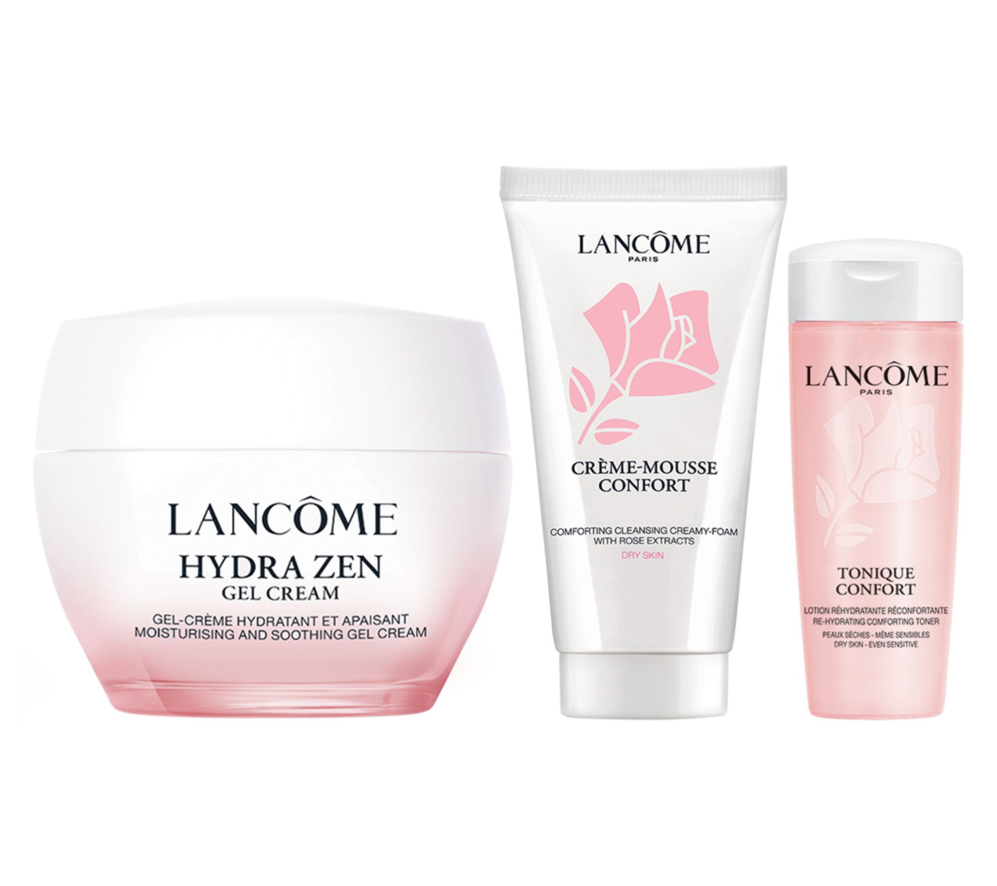 Discover Lancome's pink essential care collection featuring a full size of Hydra Zen Gel Cream. Hydra Zen Gel Cream Moisturizer is an moisturizer with a bouncy, gel-like texture that provides hydration for visibly glowing skin. Formulated with hyaluronic acid the gel cream delivers hydration for nourished skin. Creme Mousse Confort Cream-to-Foam Cleanser delivers a voluptuous foam to melt away makeup, even waterproof, and dissolve impurities. Skin looks radiant and feels soft and smooth. Tonique Confort is a toner that delivers hydration to skin. The silky, serum texture removes impurities and preps skin for skincare or makeup application.