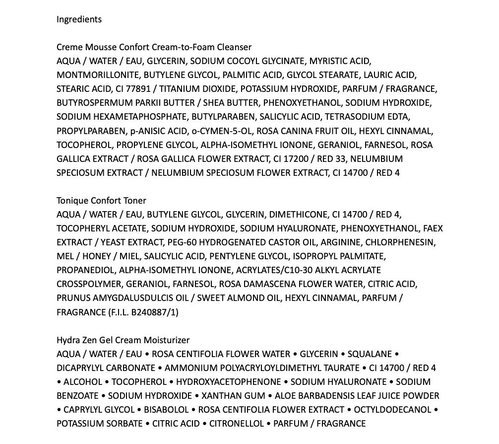 How do I use it: Cleanse with Creme Mousse Confort. Apply with your hands to increase the absorption and effectiveness of product ingredients for glowing skin. Pour a quarter-size amount of the toner formula into your hand, evenly distribute it onto both hands, and then gently pat the formula onto the face and neck until absorbed. Apply a dime-size amount of Hydra Zen onto the face and neck and massage into the skin until absorbed.