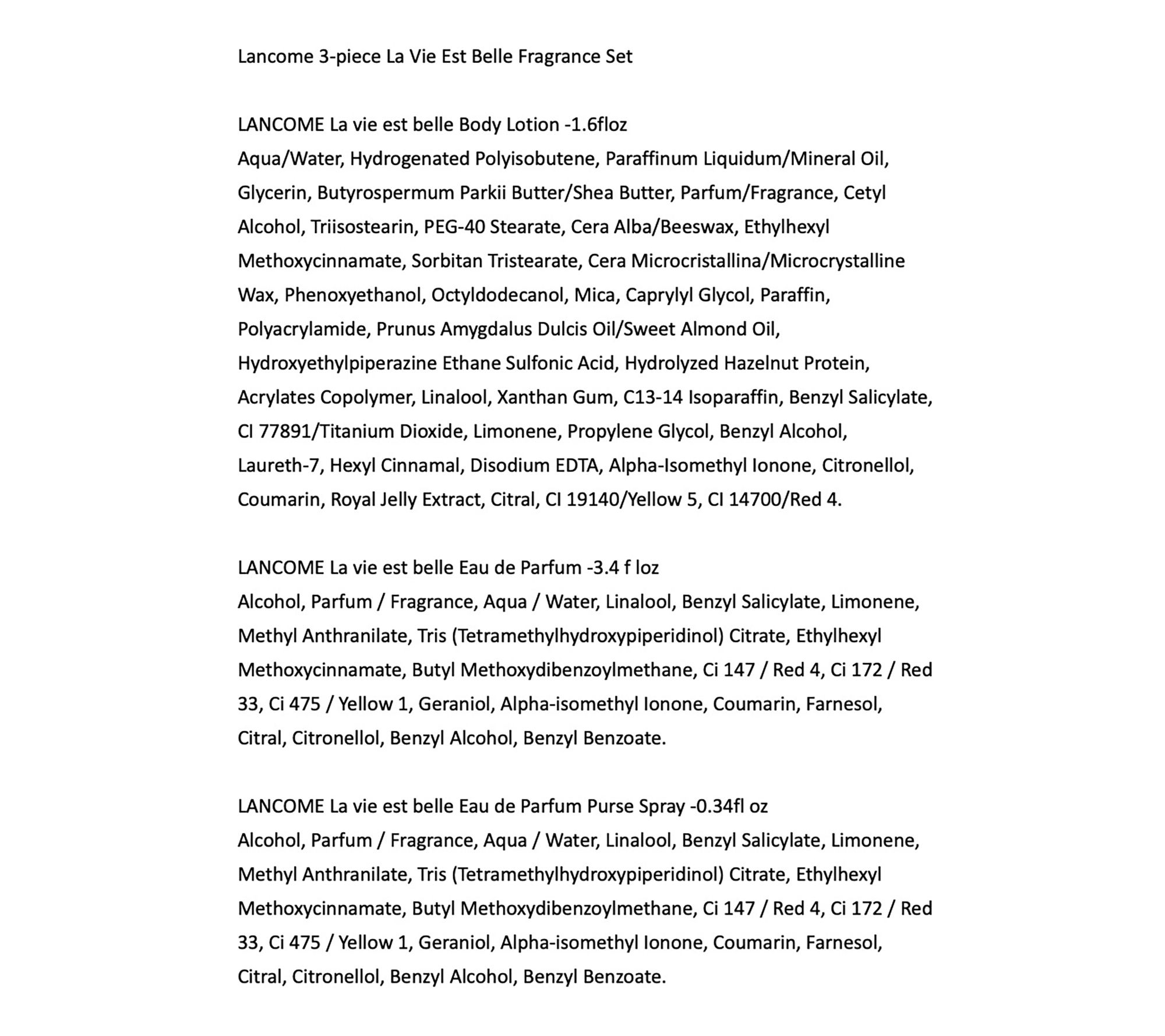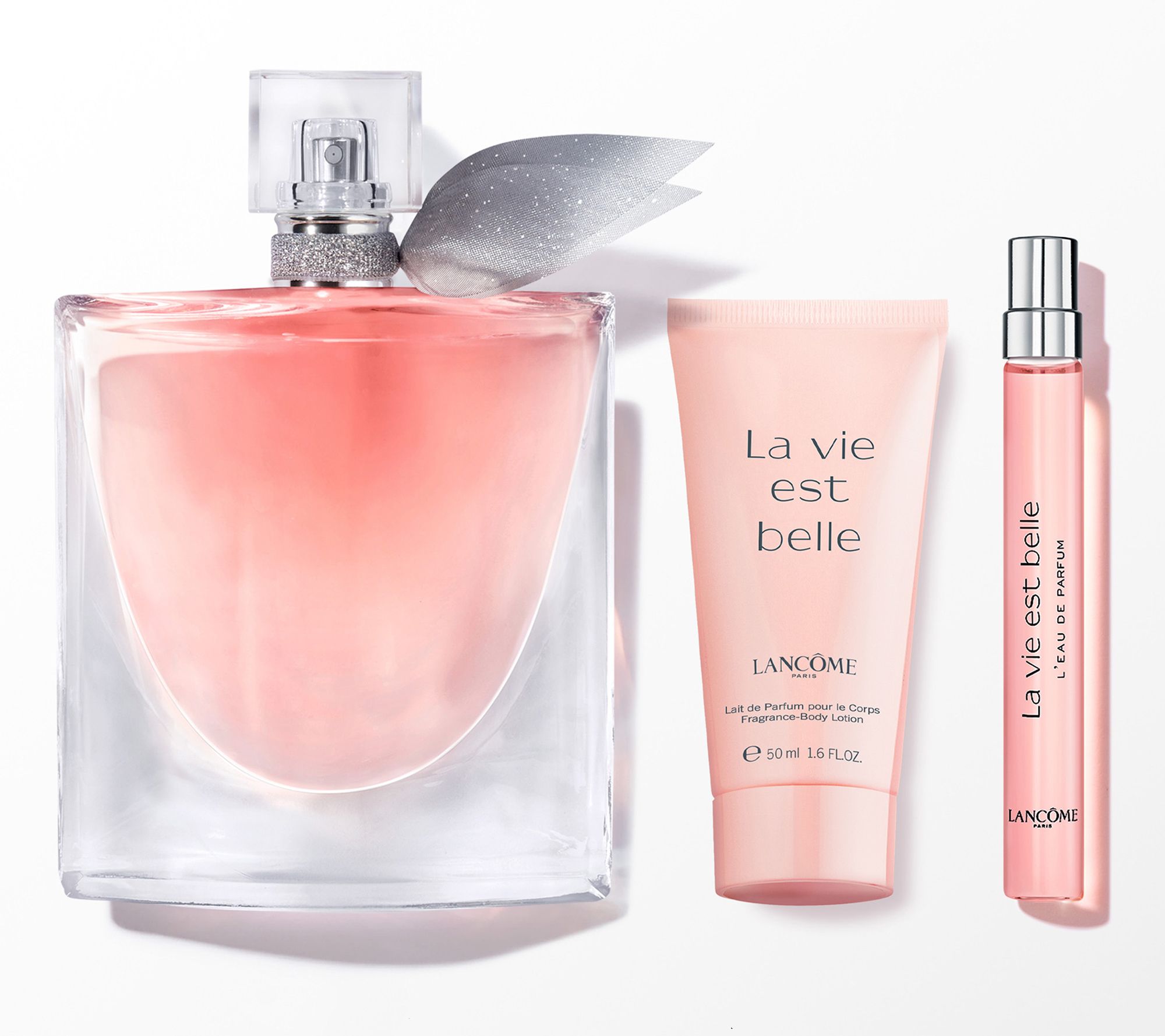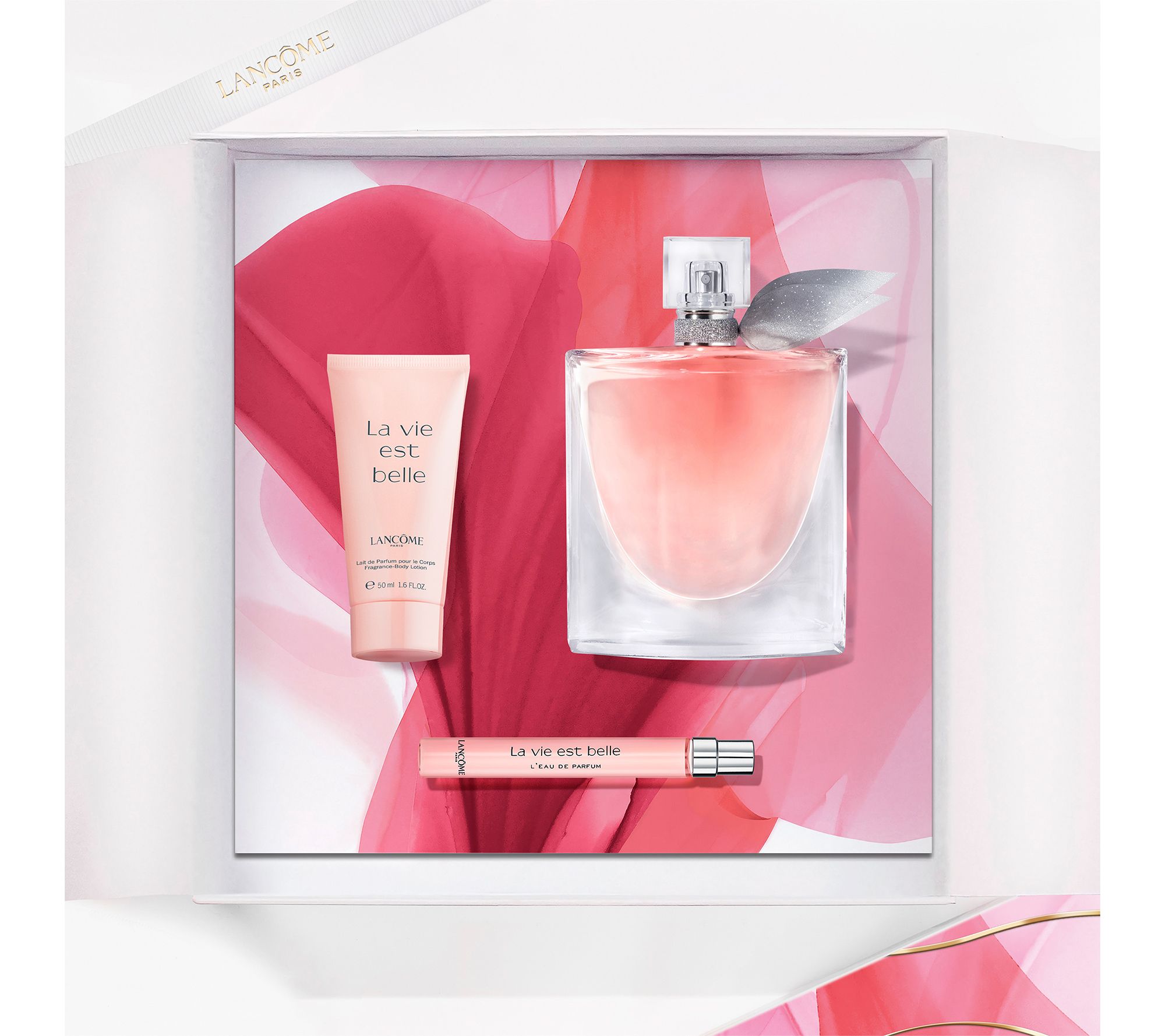 This three-piece set features La Vie Est Belle from Lancome in three versions: one eau de parfum to keep on your dresser, one purse spray to keep in your handbag, and one moisturizing body lotion so you can layer the sensual fragrance. La Vie Est Belle Body Lotion moisturizes, softens, and illuminates. A luxurious moisturizing fragrance body lotion that offers the unique experience of La Vie Est Belle. It helps skin appear temporarily hydrated and illuminated to its most beautiful self.
