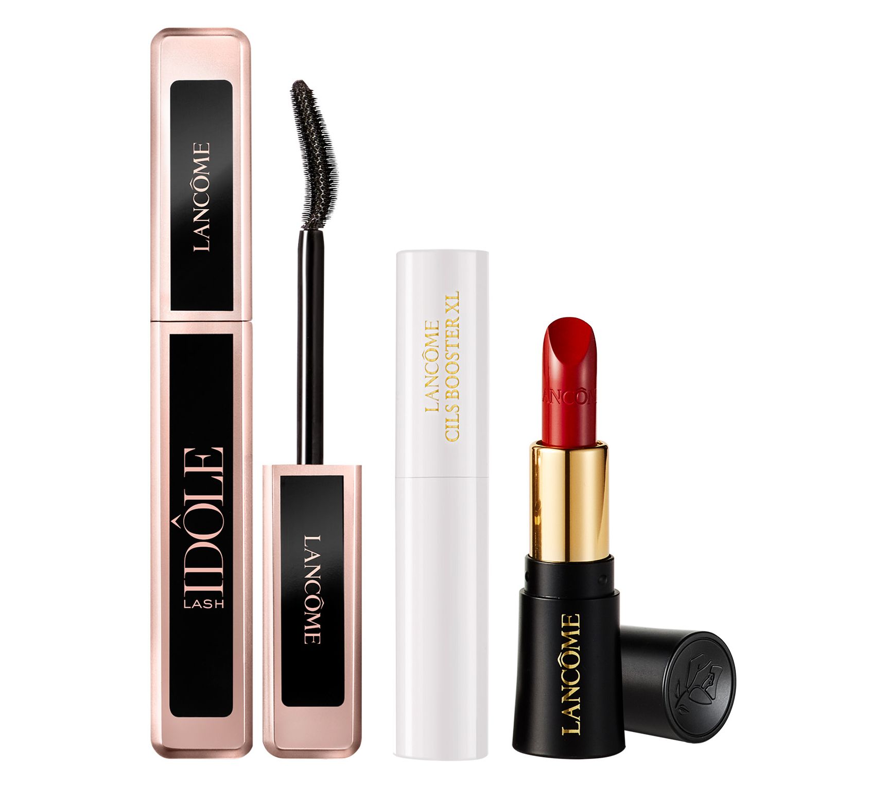 Lancome Lash Idole Eye and Lip Makeup Set will have your long-lasting look covered from lips to lashes. Hit your voluminous eyelash goals with Lash Idole. Cils Booster XL mascara primer is an eyelash primer that is packed with vitamins B5 and E. Lash Idole Mascara targets and volumizes the appearance of lashes for fully fanned out voluminous looking lashes. L'Absolu Rouge Drama Matte Lipstick is the ultimate longlasting lipstick powered by pure pigments for a vibrant and matte finish.