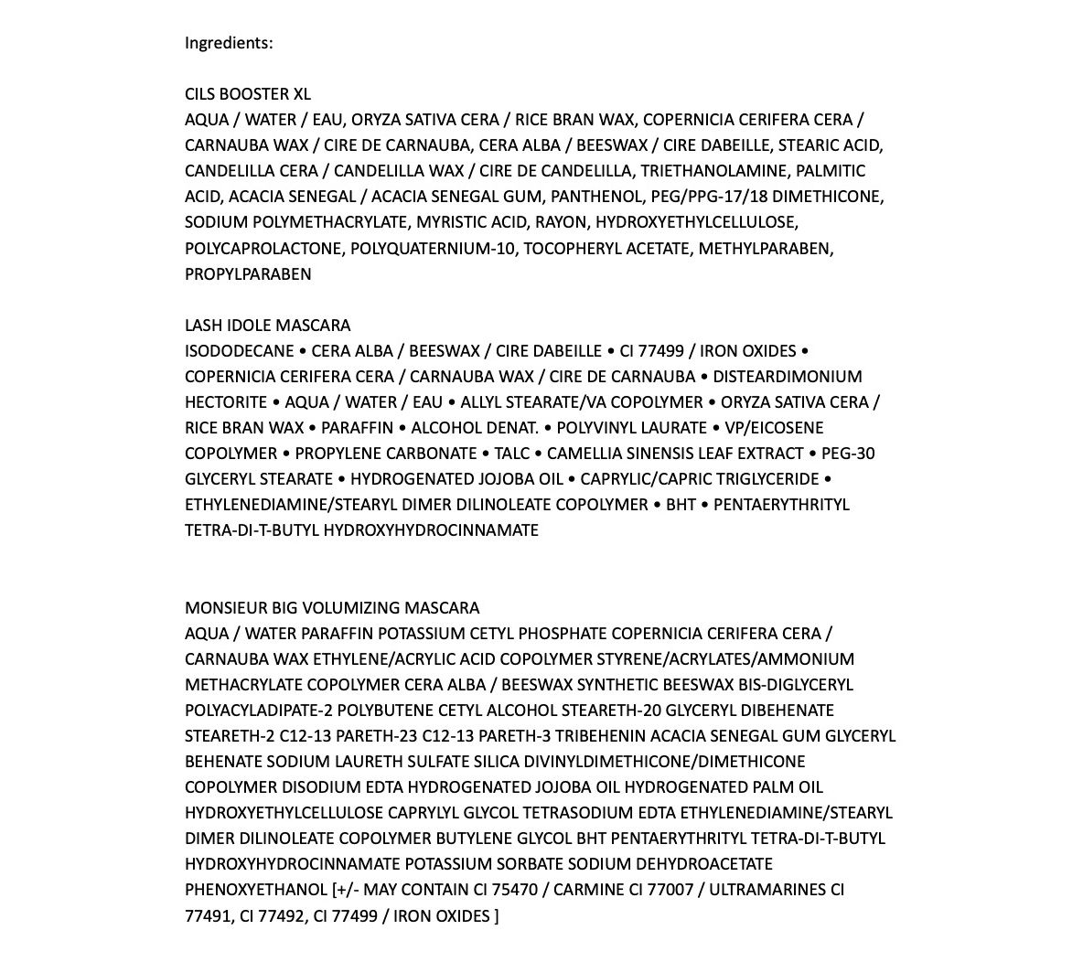 How do I use it: Apply Cils Booster XL from roots to tips of eyelashes, but do not wait until dry before coating lashes with mascara. Apply Lash Idole by holding wand horizontally near lashes, with the curved side facing upwards. Apply the mascara in an upward swiping motion for the top lashes and bottom swiping motion for bottom lashes. Layer as desired to achieve the lash extension look at home. For Monsieur Big Mascara, hold wand horizontally by lashes. Apply mascara in an upwards swiping motion for top lashes and downward swiping motion for bottom lashes. Layer as desired to achieve volume (from bare lashes) and intense black pigment.