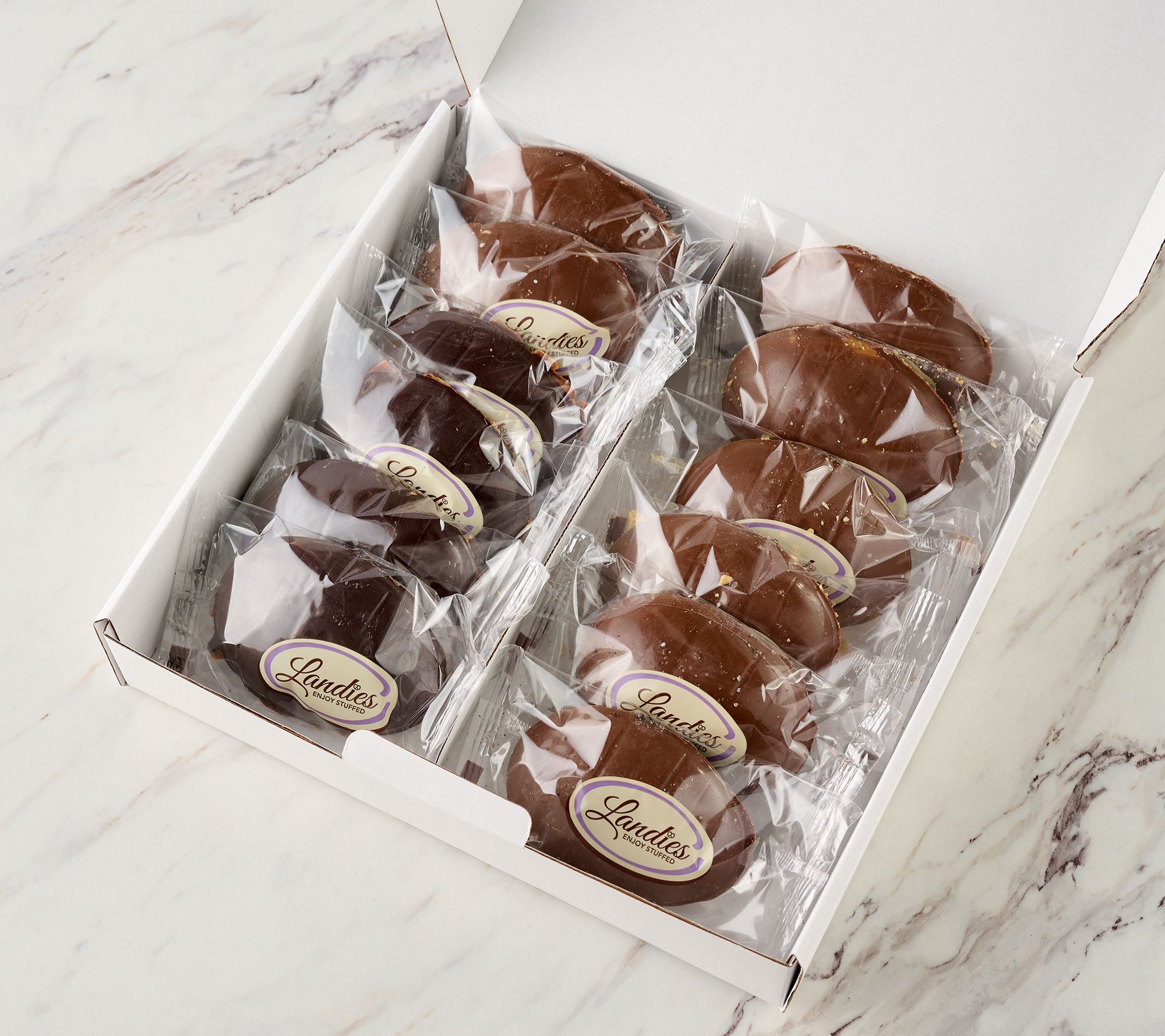 Decadent delights are just a bite away with Landies Candies' 12-piece assorted chocolate truffle eggs. Whether you're savoring the creamy milk chocolate peanut butter, indulging in the rich dark sea salt caramel, or treating yourself to the whimsical milk chocolate cookies and cream, each egg promises a moment of bliss. Perfect for gifting or enjoying yourself, these chocolates come beautifully gift-boxed and ready to delight your taste buds. From Landies Candies.