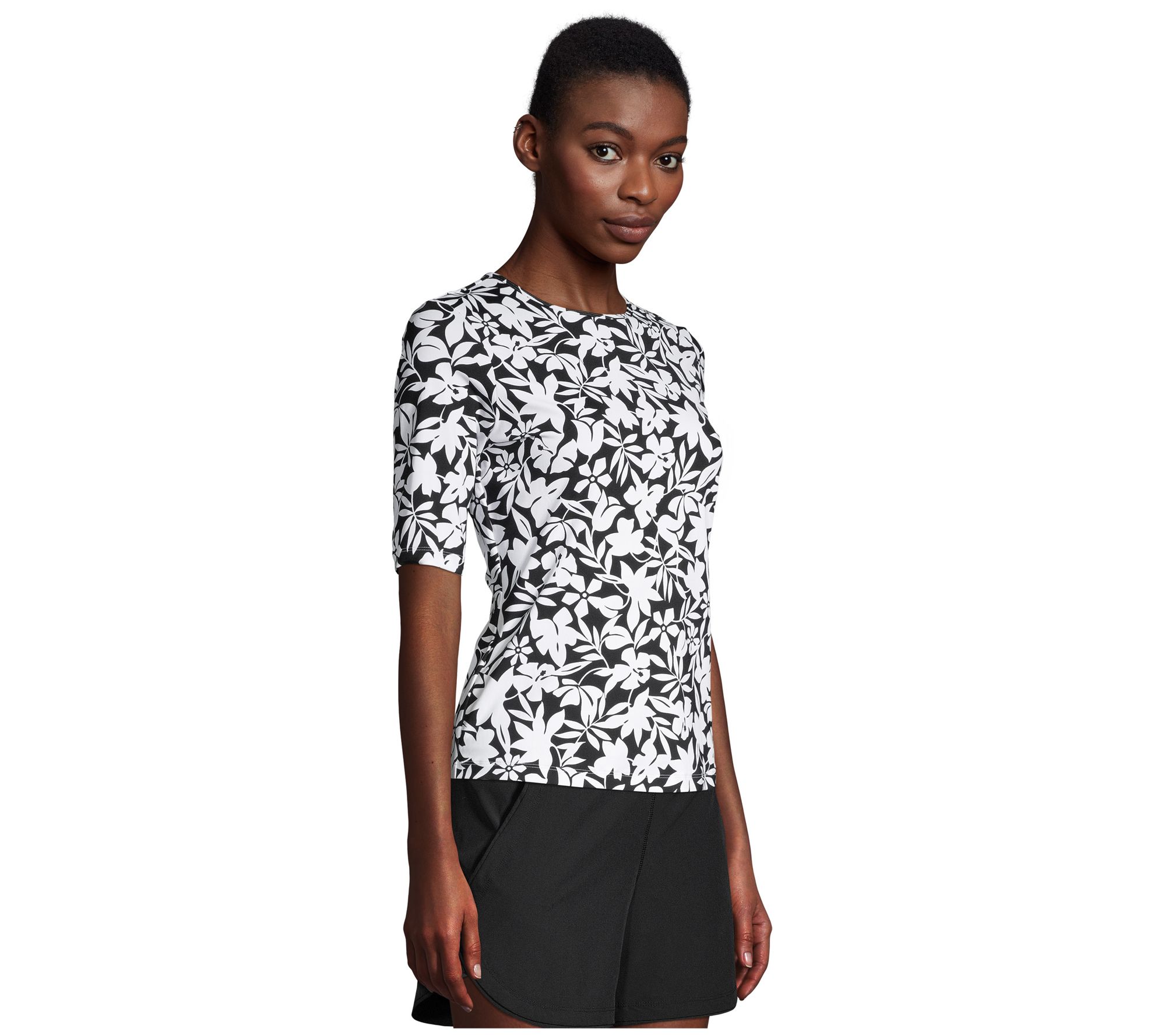 • Features: printed, crew neckline, elbow-length sleeves, UPF 50+ protection, moisture-wicking fabric