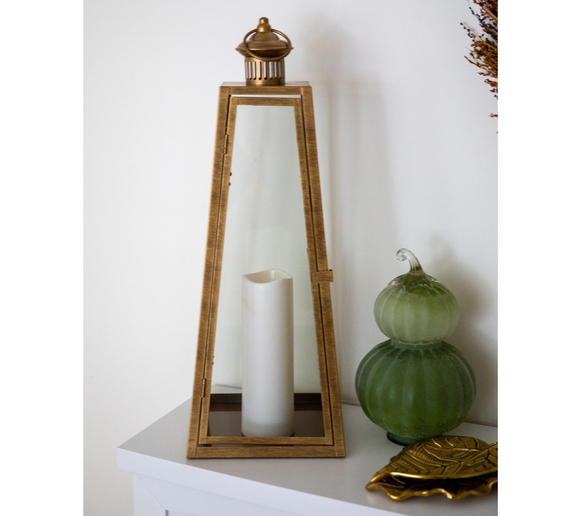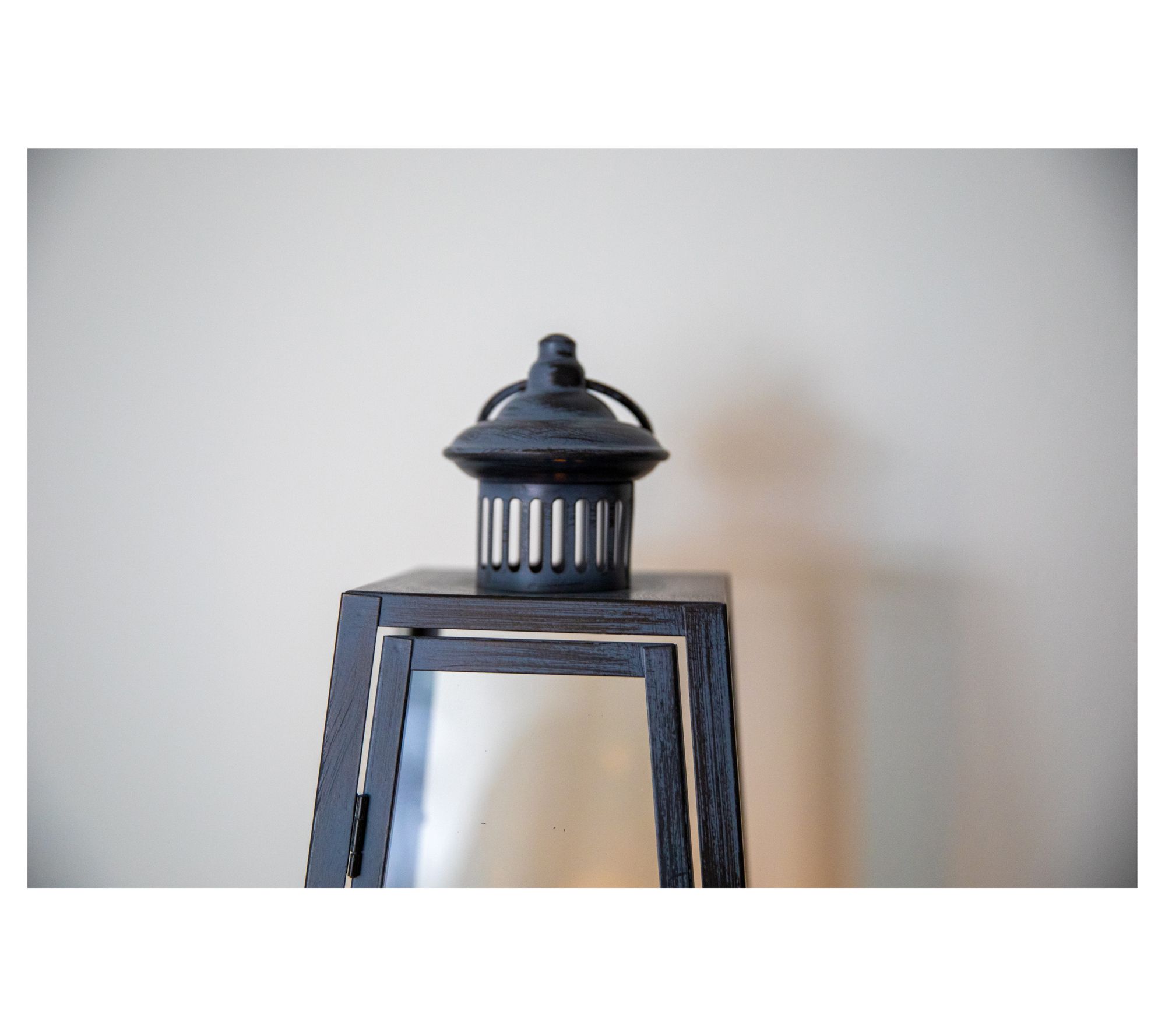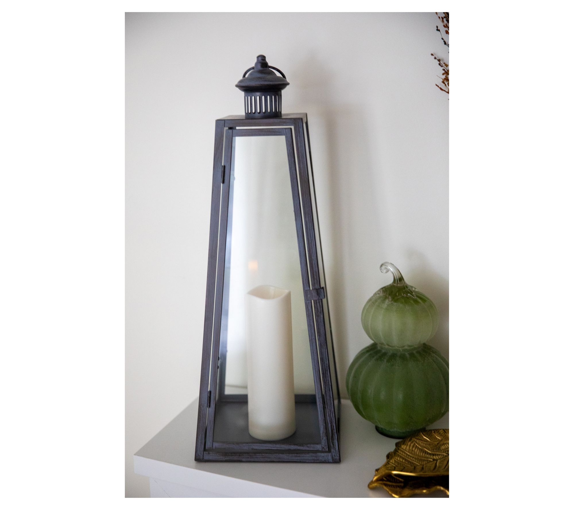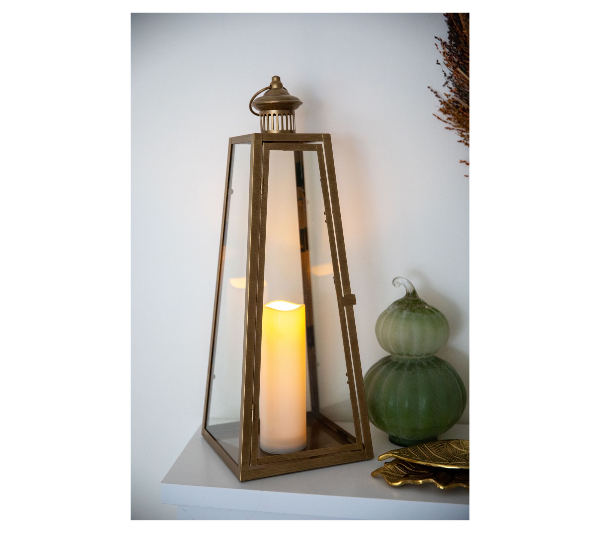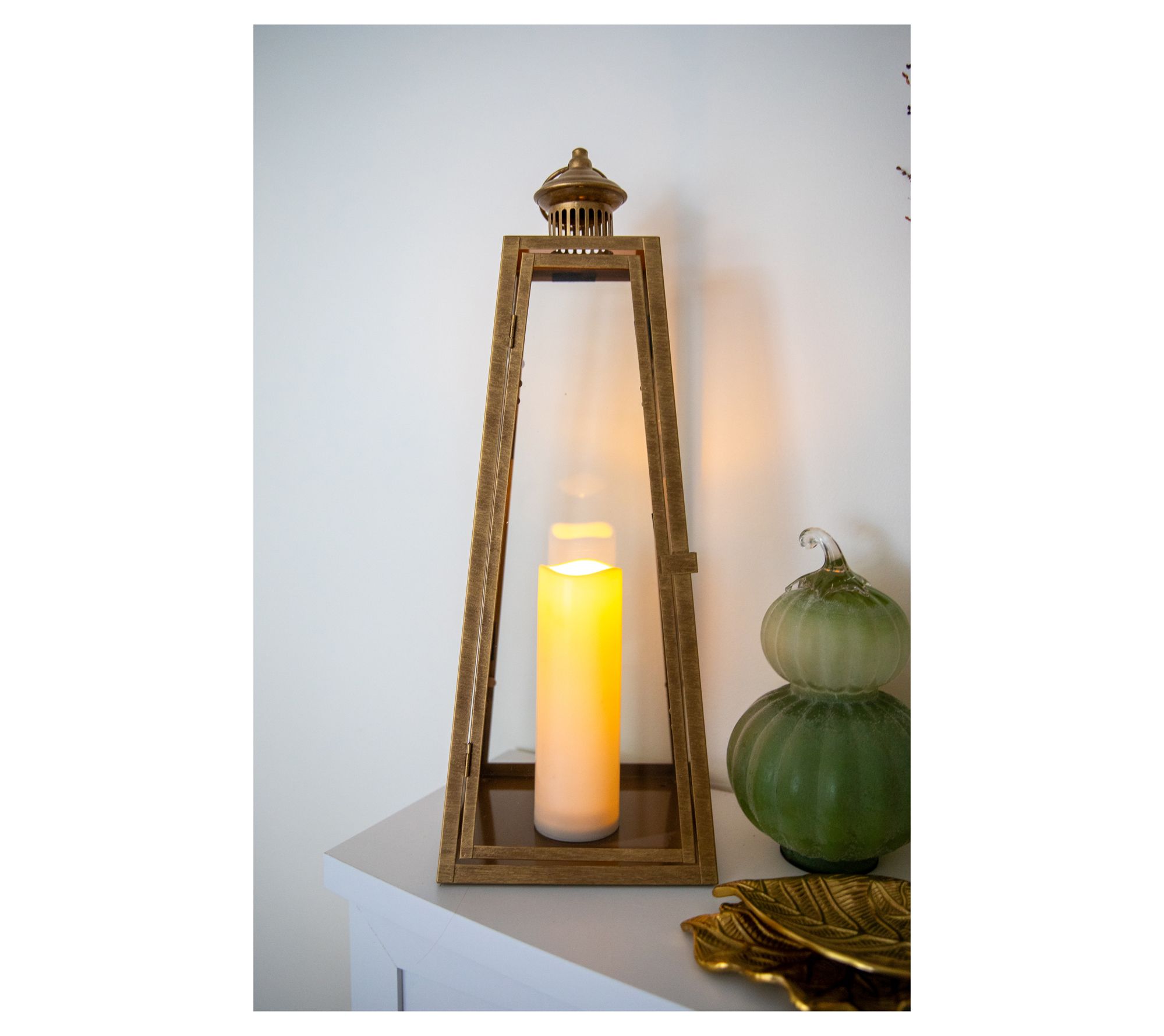 Includes lantern, LED flameless pillar candle, and remote with battery