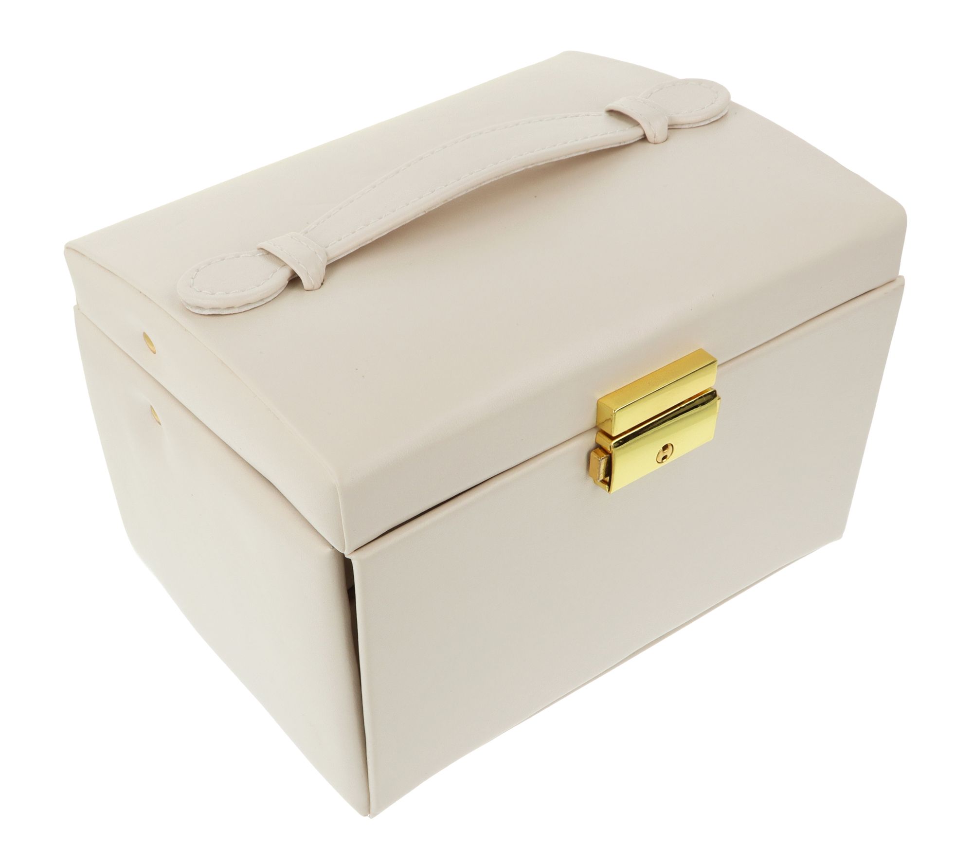 Keep your cherished pieces organized and ready for every occasion with this elegant ivory jewelry case. Its spacious, multi-level design provides dedicated compartments for rings, bracelets, necklaces, and earrings, all easily accessible with secure closure and key. Smooth synthetic exterior and soft velvet lining offer a polished, beautiful way to store your entire collection.