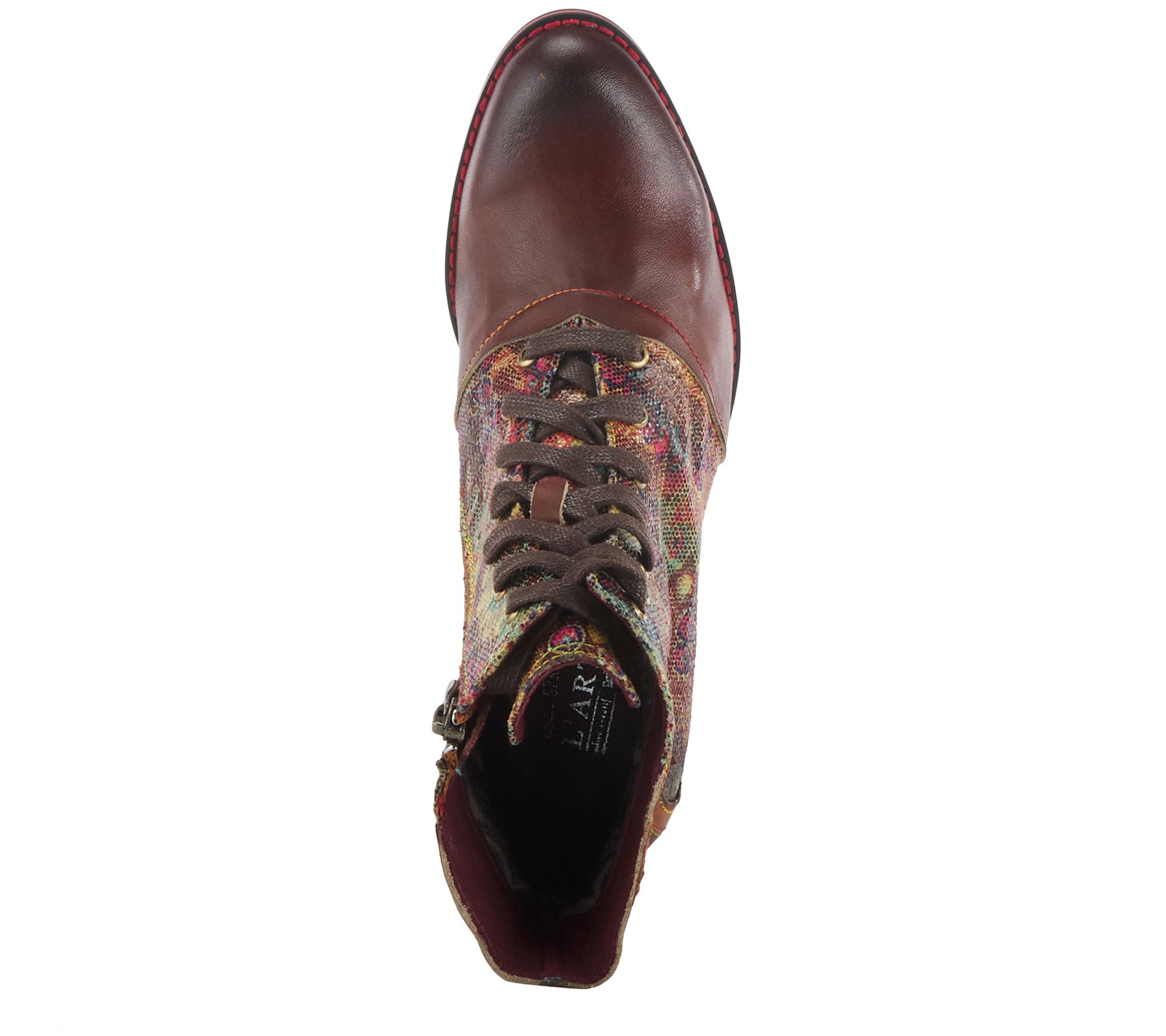 • Lace-up and side zip closures, brushed and burnished capped toe, laser-cut applique back, rainbow stitching