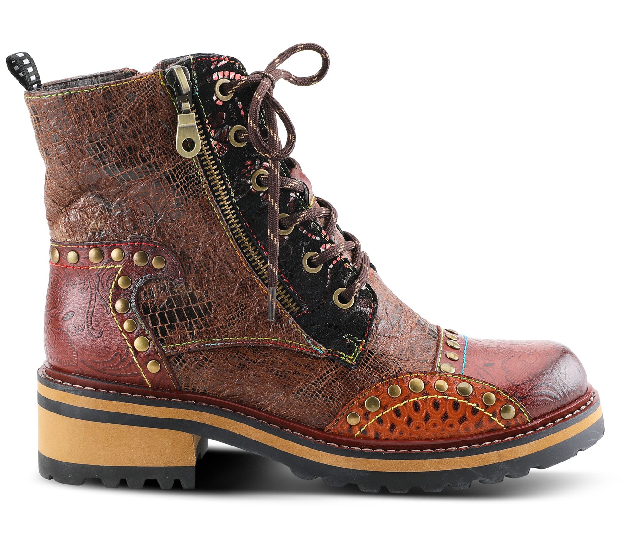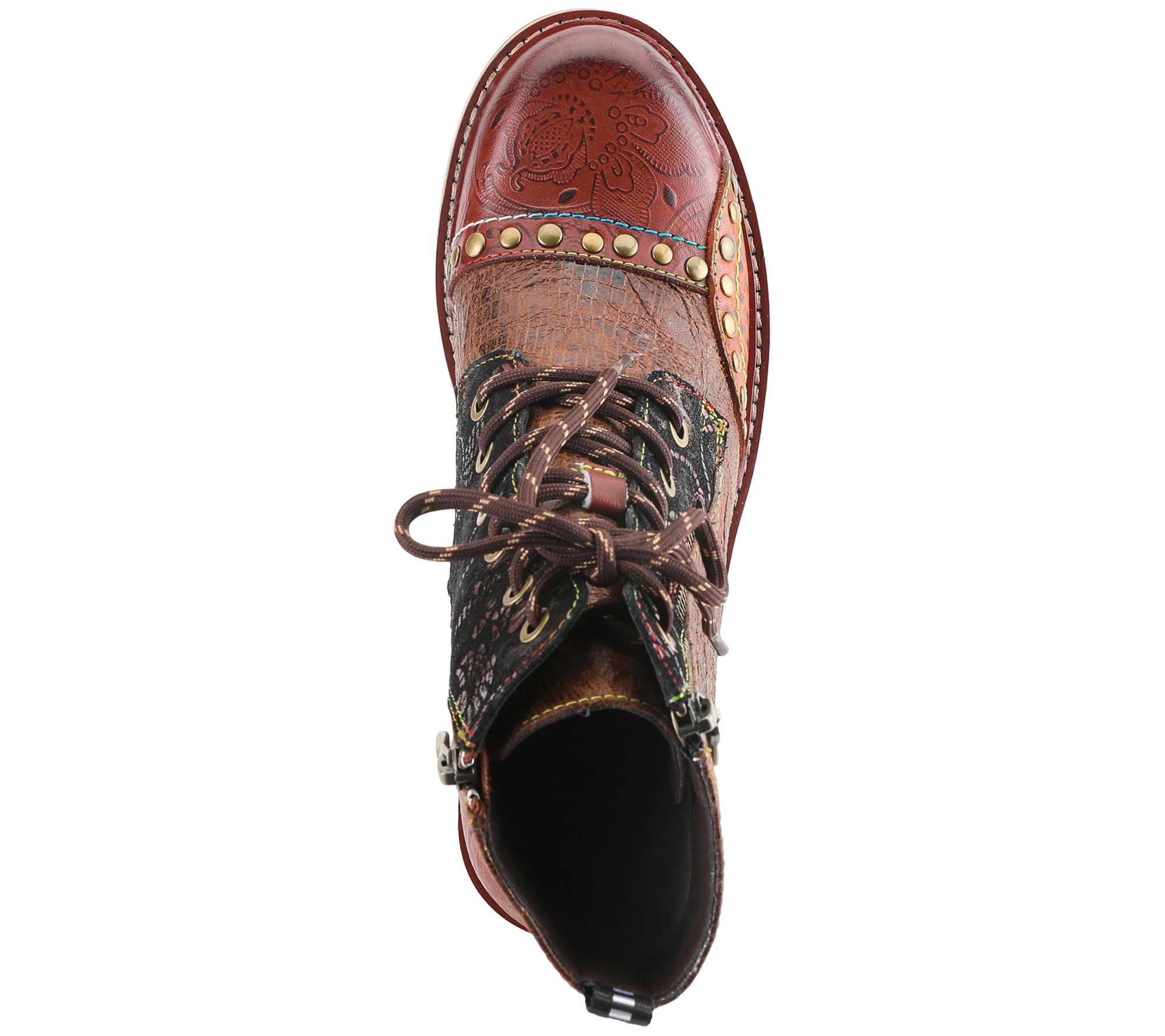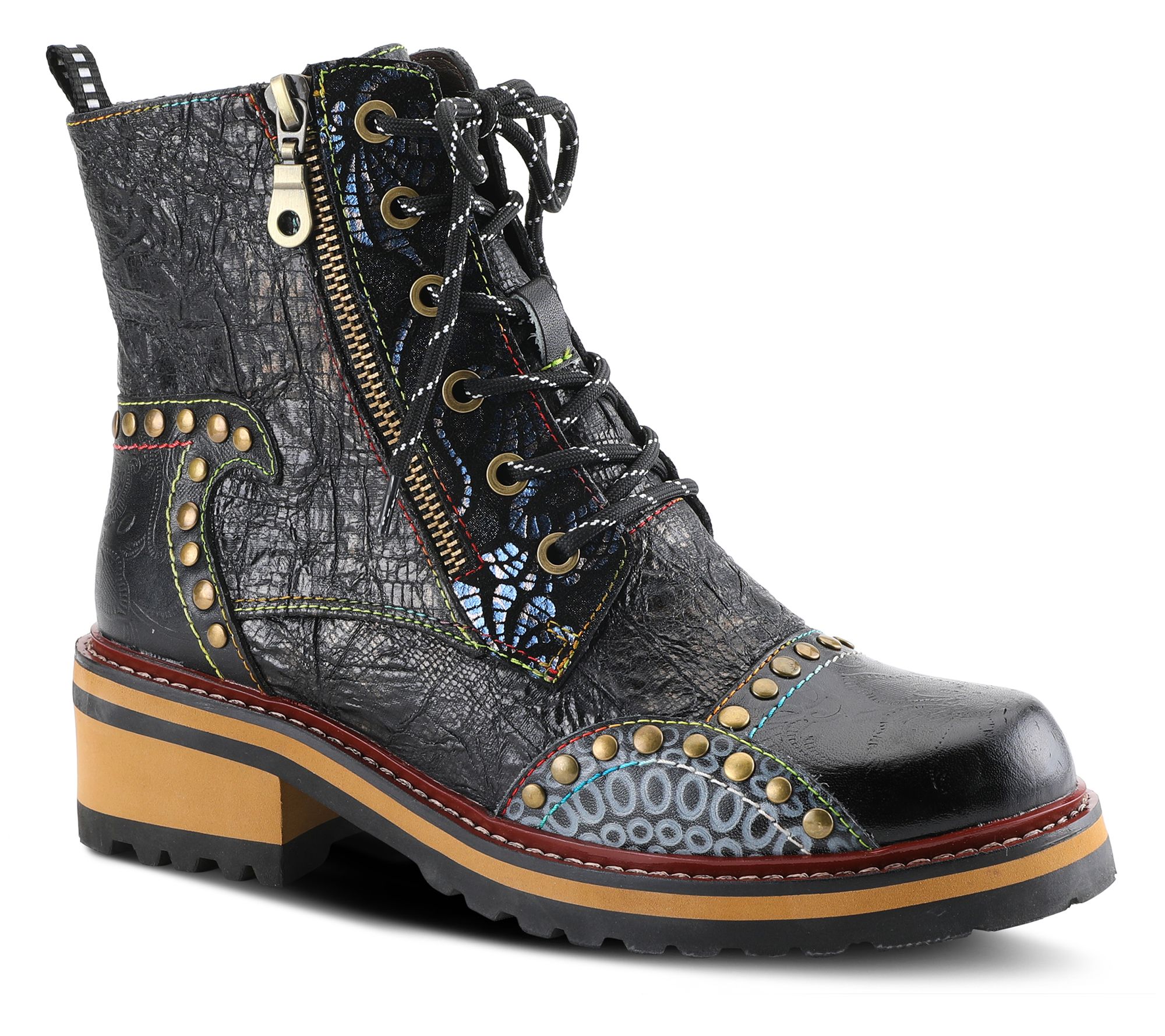 - Zip closure; lace-up style; crinkle, metallic, and embossed details; rounded toe; decorative studs