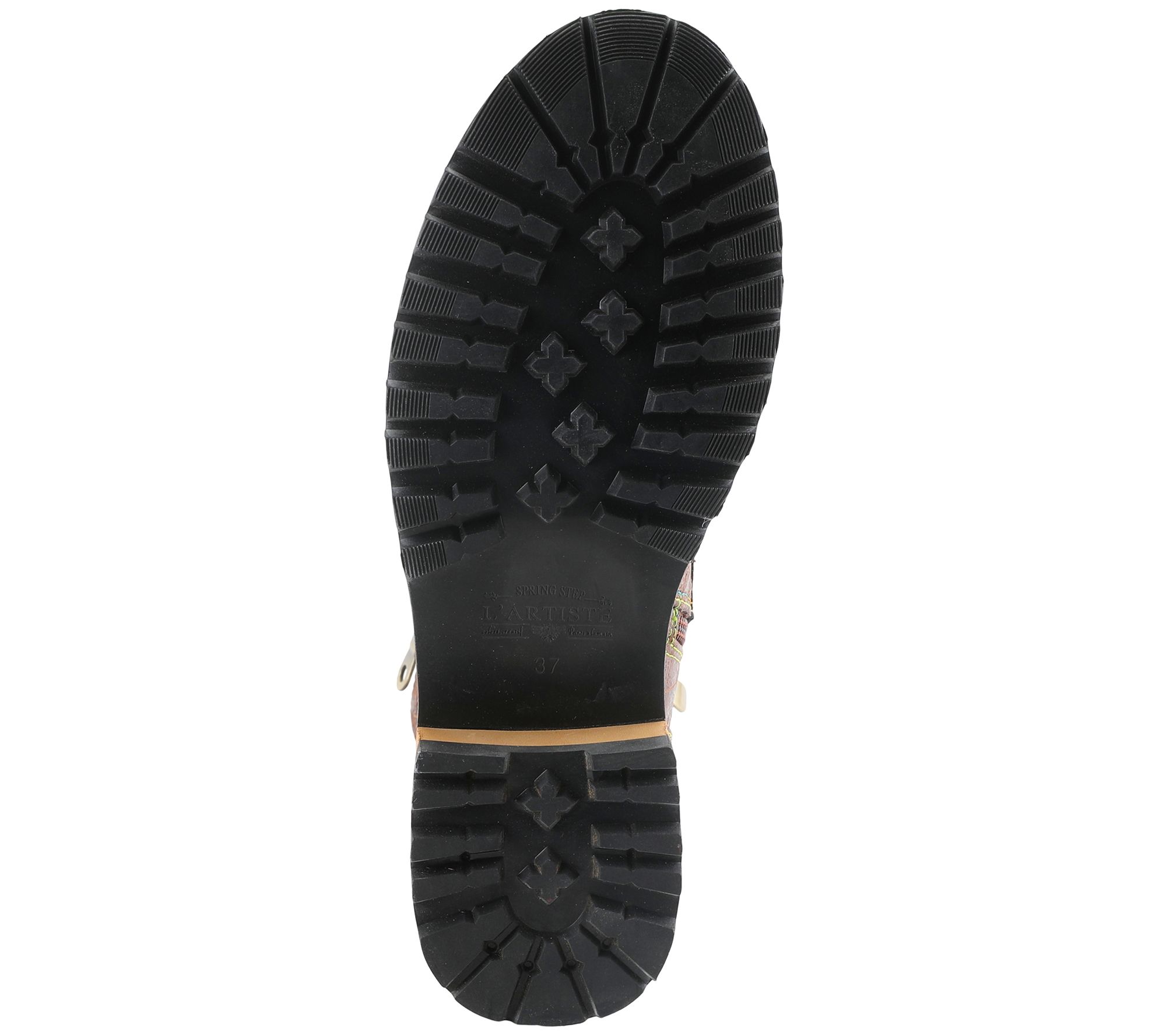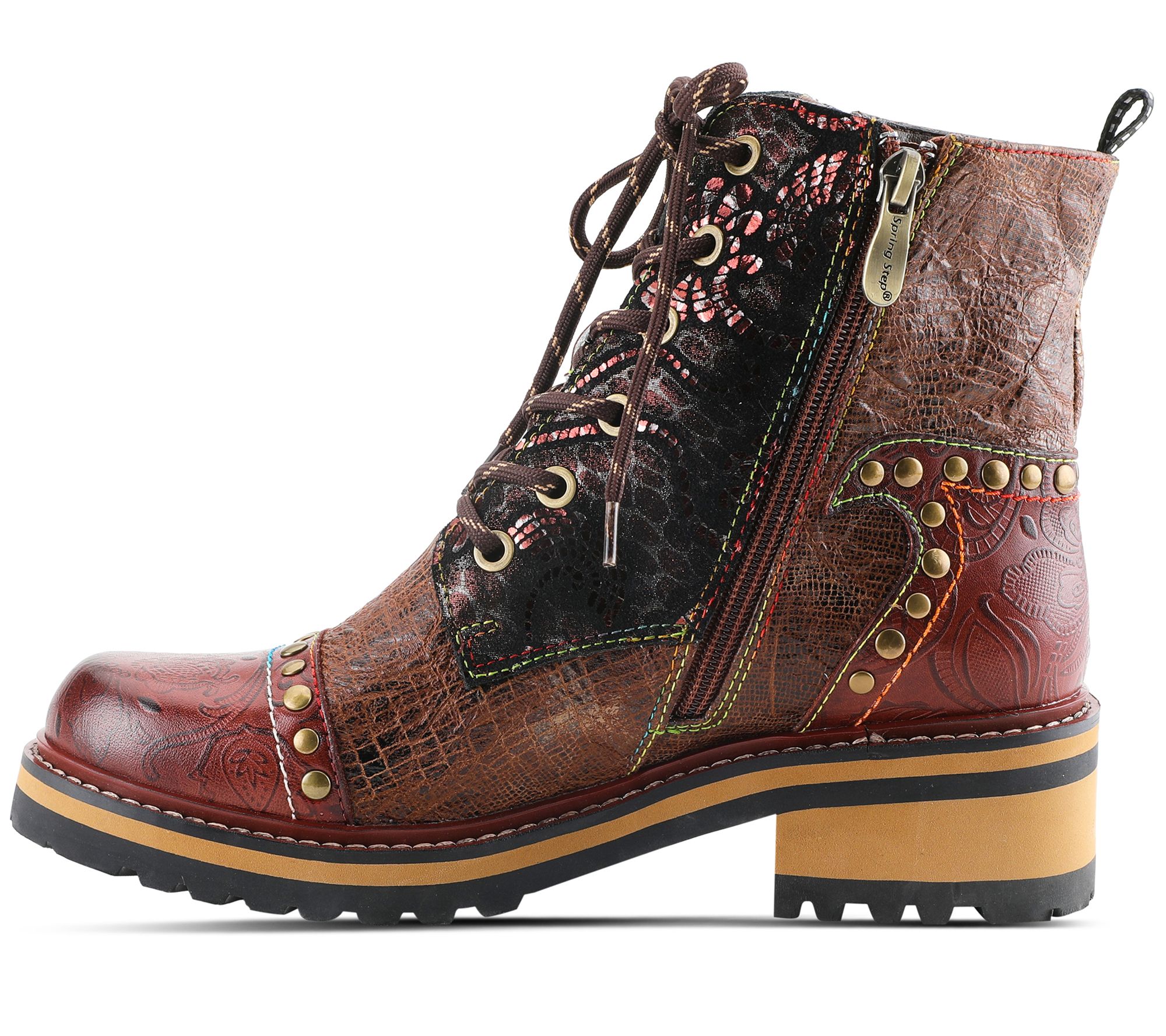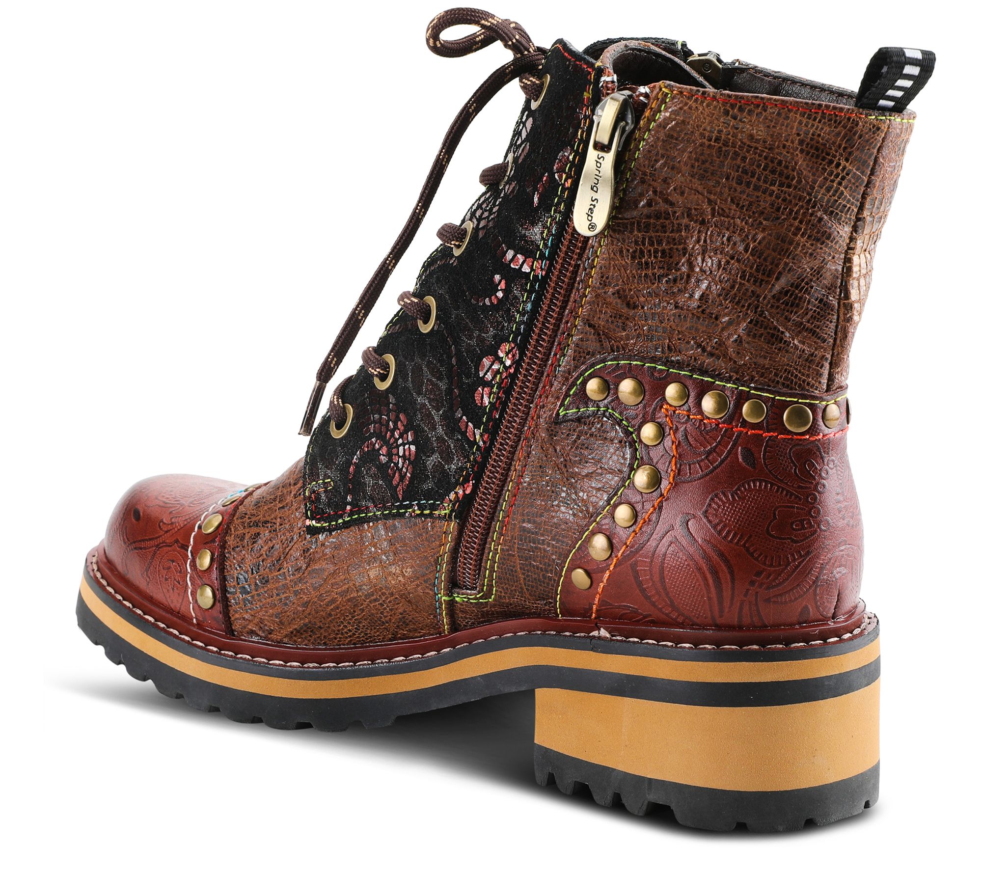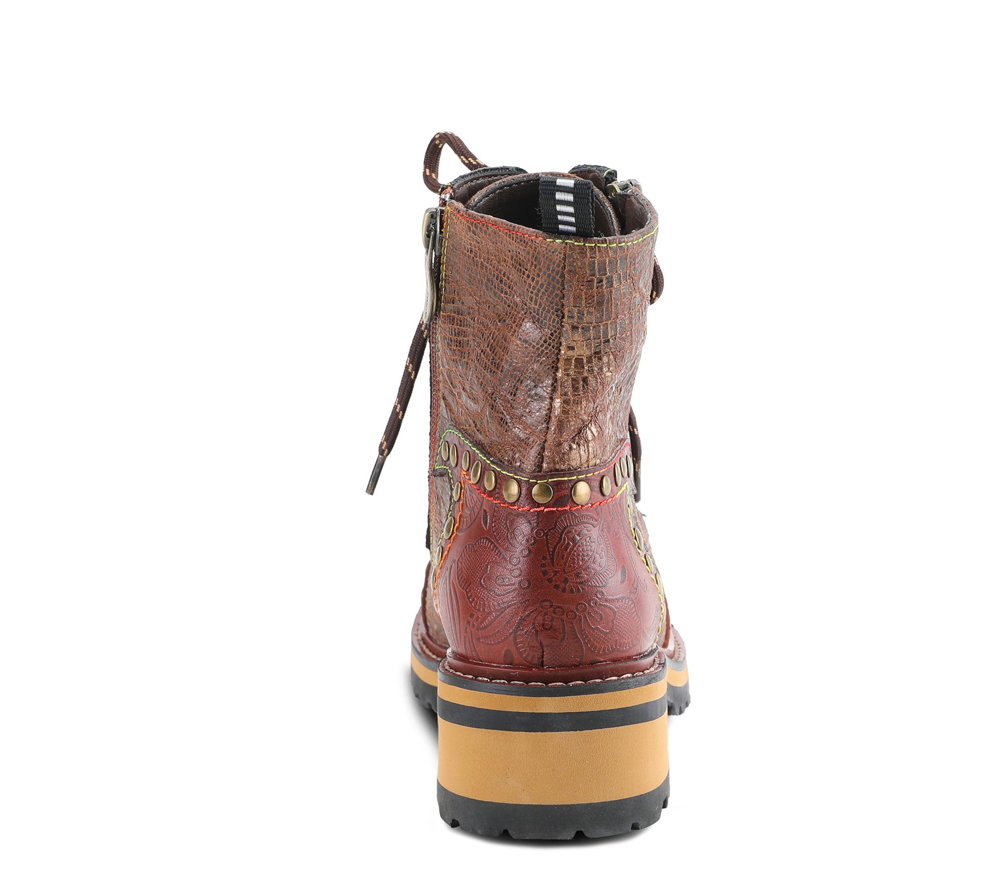 - Zip closure; lace-up style; crinkle, metallic, and embossed details; rounded toe; decorative studs